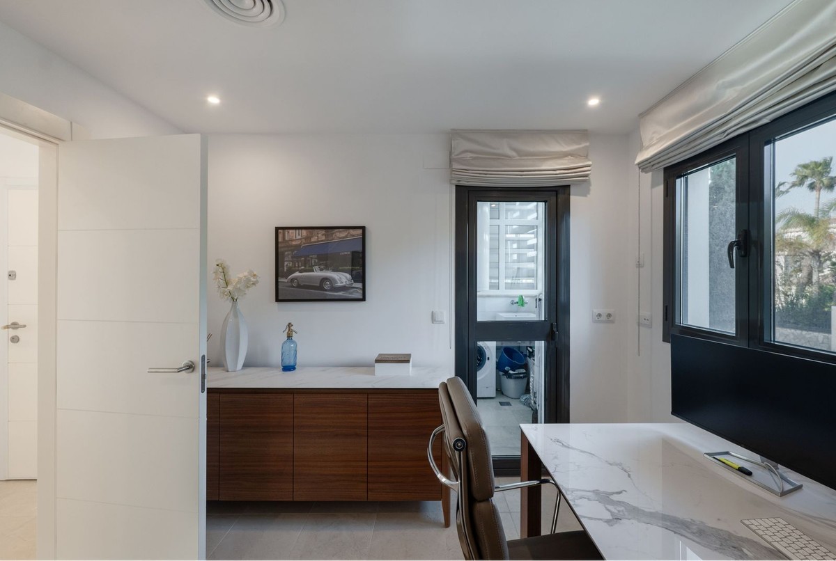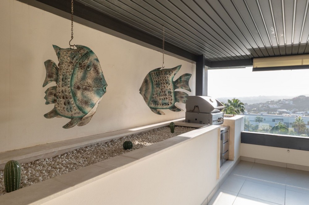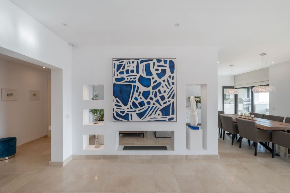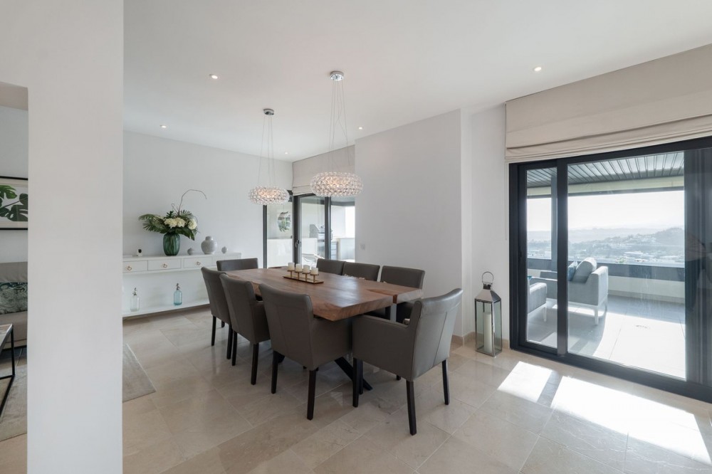 - Stunning Designer Apartment | Urb. Los Flamingos Los Flamingos, located within the prestigious Villa Padierna resort, is a gated community with 24/7 security and concierge service. One of the most sought-after locations on the Costa del Sol, combining privacy, safety and access to five-star hotel infrastructure including golf courses, SPA, restaurants and Villa Padierna services. The beach and top chiringuitos are just a few minutes by car, while Marbella and Puerto Banús are approximately 10-15 minutes away. Supermarkets and all essential amenities are within a 1 km radius. The apartment is the result of combining two units, creating a significantly larger space without compromising layout. It offers a spacious residence with 4 bedrooms, 4 bathrooms and a separate office. The centerpiece is a large open-plan living area with a fully redesigned kitchen equipped with Gaggenau appliances. The space is thoughtfully zoned, with dining, lounge and terrace areas seamlessly connected. The interior has been fully renovated, including new bathrooms, finishes and flooring. A sophisticated lighting system creates a beautiful ambiance in the evening. A key architectural feature of the living room is the L-shaped panoramic glazing, enhancing both natural light and the sense of space. The terrace has also been merged and expanded, offering spectacular panoramic views of the sea, mountains, Gibraltar and the golf course. Its west-facing orientation provides stunning sunsets. The terrace includes a barbecue area and awnings for sun protection. Additional comfort features include mosquito screens throughout, external shutters, blackout blinds and a fireplace. The property also comes with 2 parking spaces and 2 storage rooms, ensuring ample storage. Key advantages: expanded layout through unit combination, panoramic views, high level of privacy and security, access to Villa Padierna infrastructure and a prime location with quick access to the beach and Marbella.
