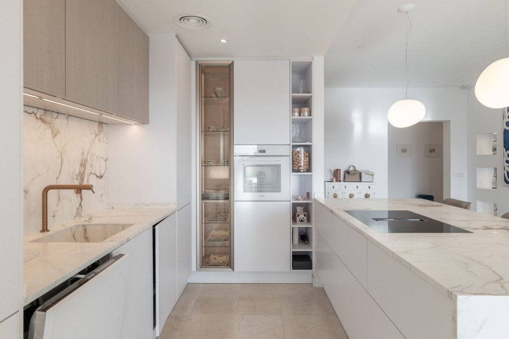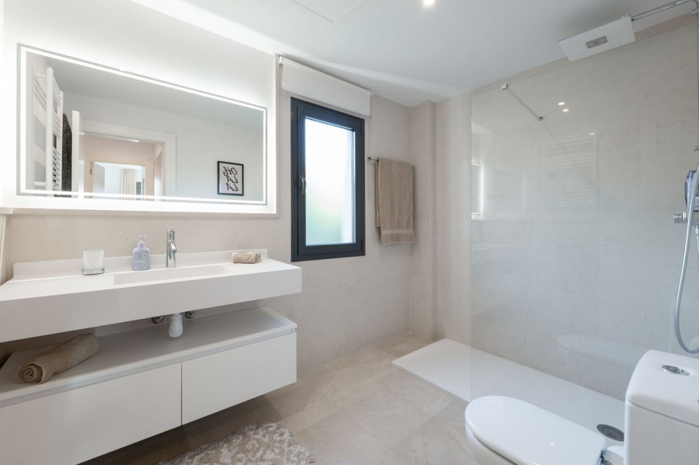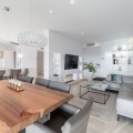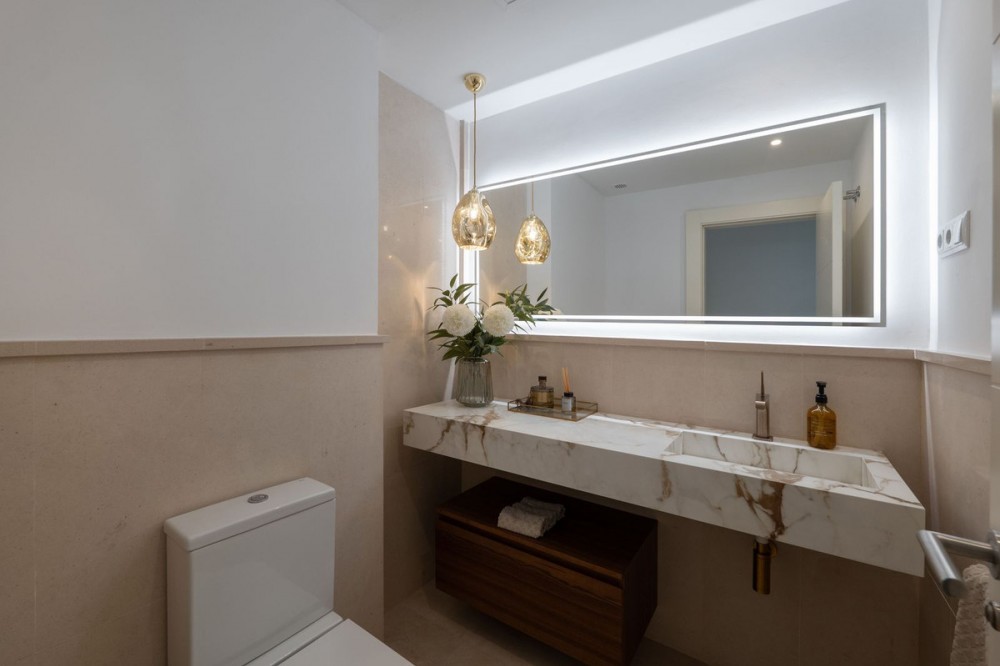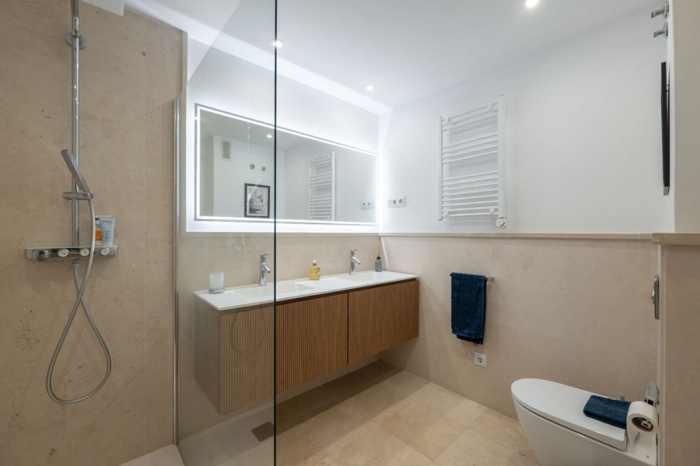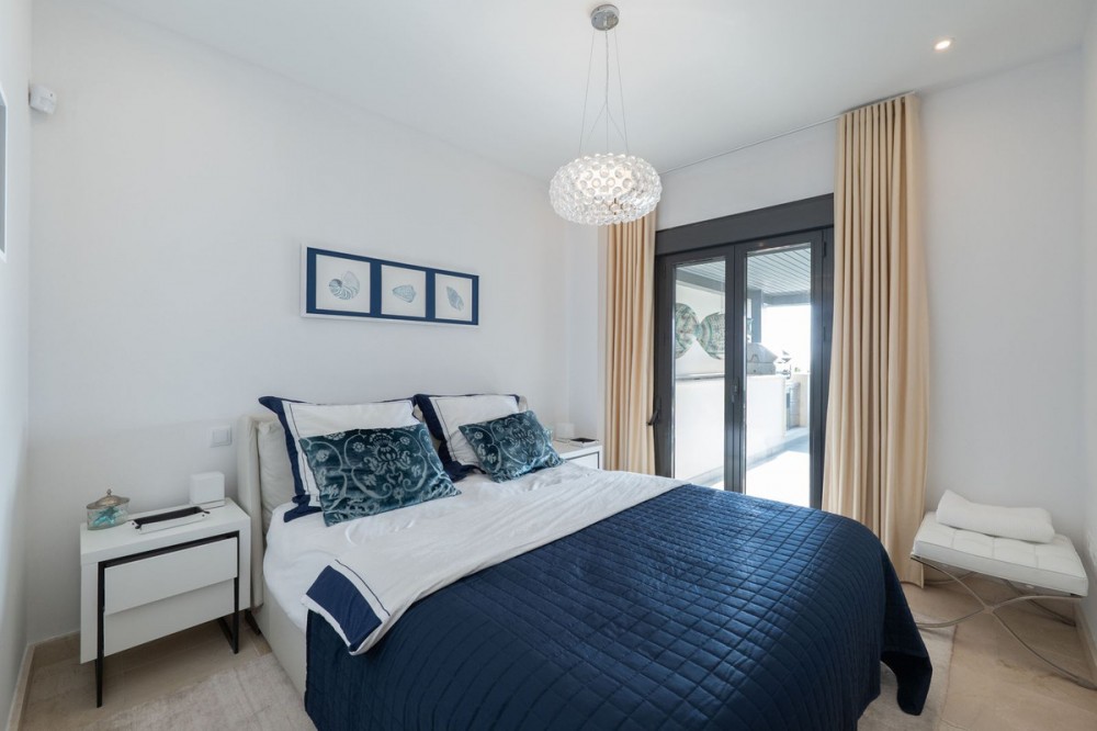 - Stunning Designer Apartment | Urb. Los Flamingos Los Flamingos, located within the prestigious Villa Padierna resort, is a gated community with 24/7 security and concierge service. One of the most sought-after locations on the Costa del Sol, combining privacy, safety and access to five-star hotel infrastructure including golf courses, SPA, restaurants and Villa Padierna services. The beach and top chiringuitos are just a few minutes by car, while Marbella and Puerto Banús are approximately 10-15 minutes away. Supermarkets and all essential amenities are within a 1 km radius. The apartment is the result of combining two units, creating a significantly larger space without compromising layout. It offers a spacious residence with 4 bedrooms, 4 bathrooms and a separate office. The centerpiece is a large open-plan living area with a fully redesigned kitchen equipped with Gaggenau appliances. The space is thoughtfully zoned, with dining, lounge and terrace areas seamlessly connected. The interior has been fully renovated, including new bathrooms, finishes and flooring. A sophisticated lighting system creates a beautiful ambiance in the evening. A key architectural feature of the living room is the L-shaped panoramic glazing, enhancing both natural light and the sense of space. The terrace has also been merged and expanded, offering spectacular panoramic views of the sea, mountains, Gibraltar and the golf course. Its west-facing orientation provides stunning sunsets. The terrace includes a barbecue area and awnings for sun protection. Additional comfort features include mosquito screens throughout, external shutters, blackout blinds and a fireplace. The property also comes with 2 parking spaces and 2 storage rooms, ensuring ample storage. Key advantages: expanded layout through unit combination, panoramic views, high level of privacy and security, access to Villa Padierna infrastructure and a prime location with quick access to the beach and Marbella.
