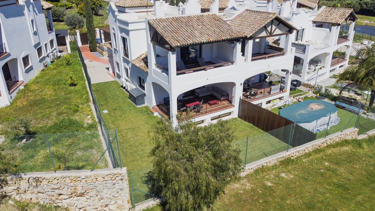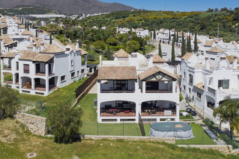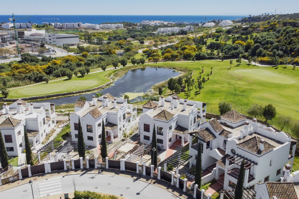 - This stunning semi detached villa is situated within the exclusive Azata Golf gated community in Estepona West, Malaga, presenting a sophisticated opportunity for discerning buyers seeking a blend of lifestyle and investment on the Costa del Sol. The property is perfectly positioned for those desiring proximity to golf courses, the sea, local amenities and essential services, all while enjoying the security and privacy of a gated complex. This villa offers an impressive layout across multiple levels. The lower floor incorporates a comfortable lounge area, a dedicated gym, a practical office room, a laundry suite, and a generous storage room. Living and entertaining spaces flow effortlessly thanks to an open plan living-dining arrangement, accentuated by a modern, fully-fitted kitchen. The villa benefits from both air conditioning and a fireplace, ensuring comfort throughout the year. Natural light bathes the interiors due to the southwest orientation, while multiple terraces and a solarium provide extensive areas for relaxation and al fresco dining. The private terrace is a particular highlight with serene views of the lake, lush gardens, and captivating panoramic vistas. The upper level comprises four well-appointed bedrooms and four bathrooms (two of which are en-suite), delivering superb accommodation for families or guests. The master suites and guest rooms are elegantly finished, some offering direct terrace access and serene garden or street views. Outlined by a private garden, the property’s outdoor spaces are perfect for unwinding or entertaining in the Mediterranean climate. The carport provides secure parking within the gated community, further contributing to peace of mind. Estepona Golf and the prestigious Finca Cortesín are nearby, while the beaches and lively town centre of Estepona are reachable within ten minutes. Estepona’s west side offers an excellent balance of tranquillity and accessibility, with supermarkets, restaurants, and schools close at hand. For those looking to experience the finest the Golden Mile and Marbella have to offer, Puente Romano and Puerto Banús are a short drive away. With its excellent condition, privacy, security, and potential for strong rental yields, this villa represents an exceptional Costa del Sol real estate investment opportunity, appealing to international buyers looking for a luxury villa on the Marbella–Estepona frontline.