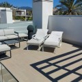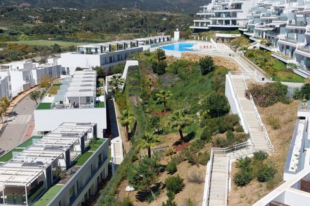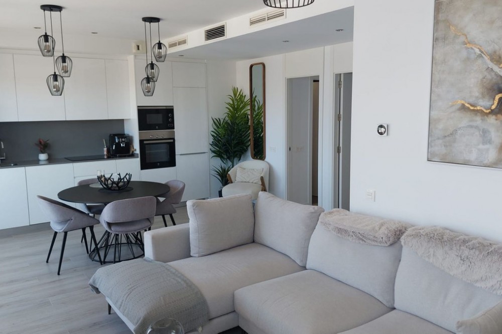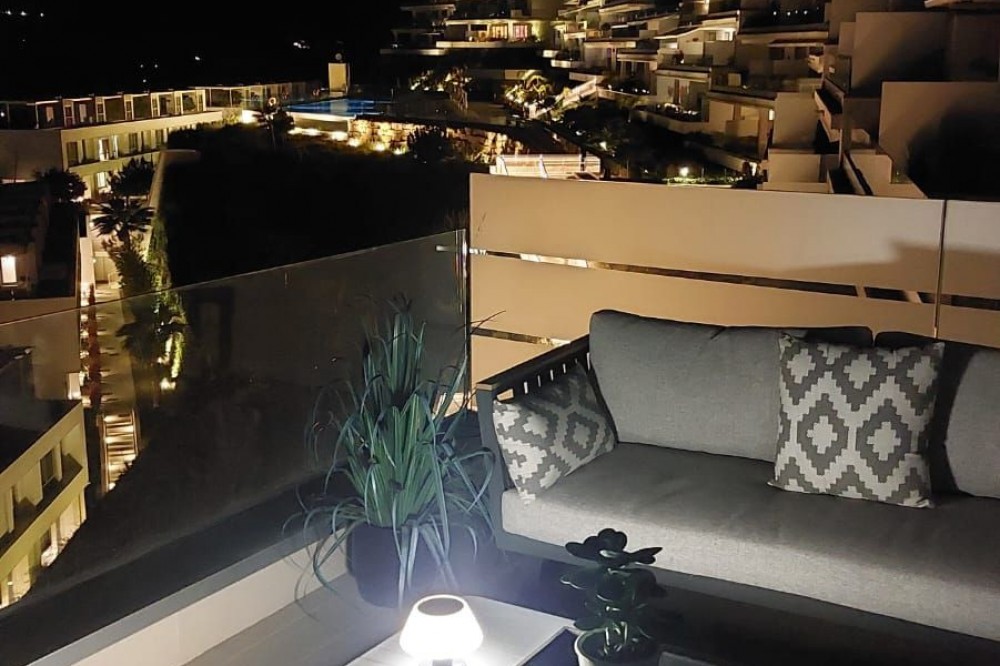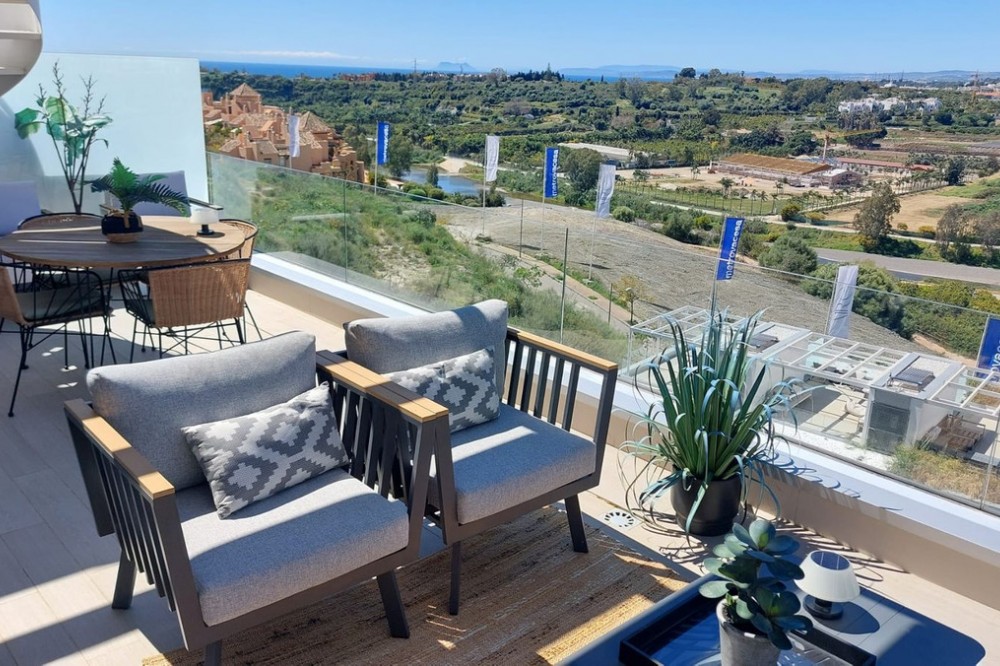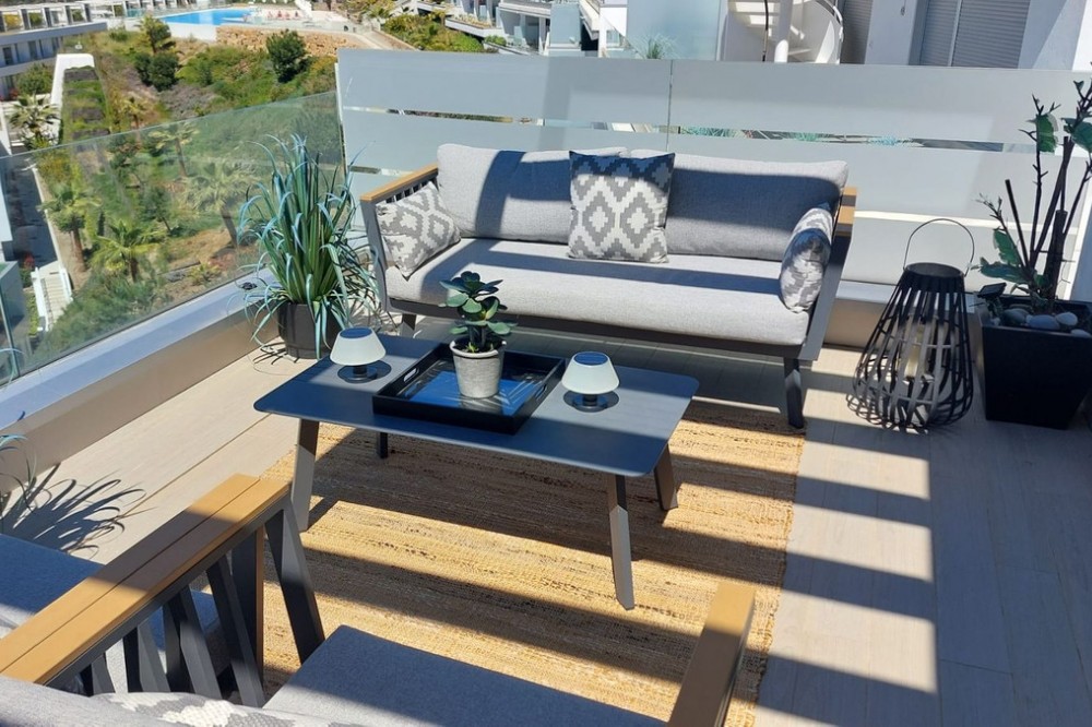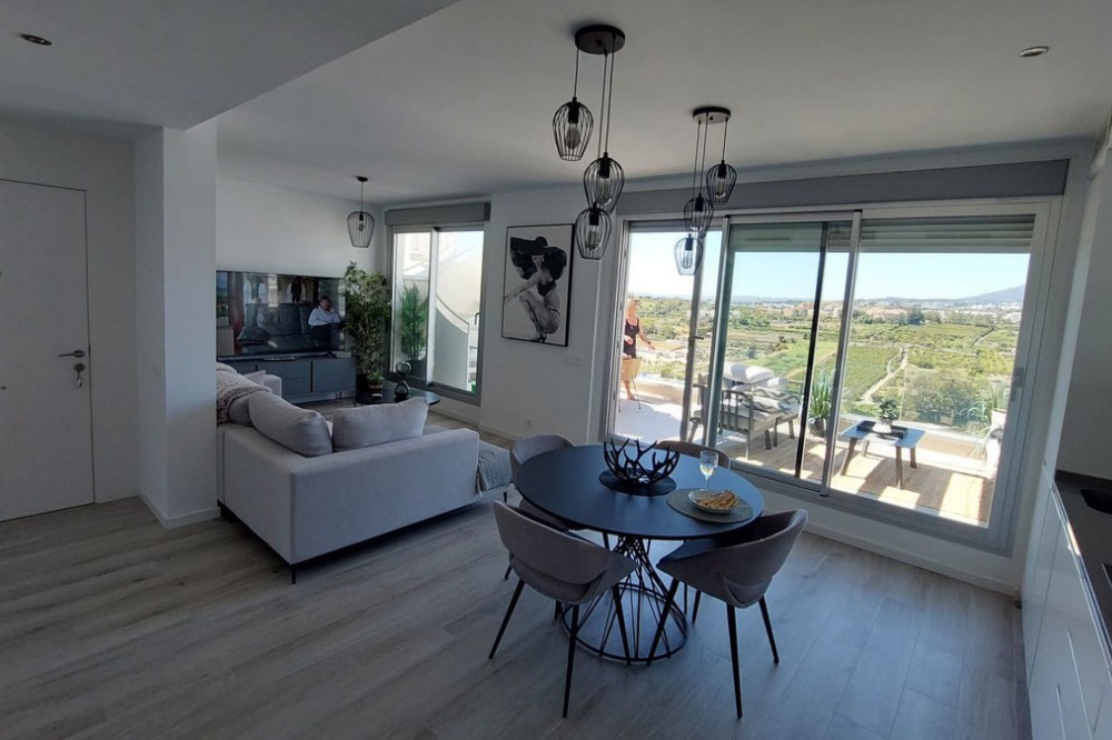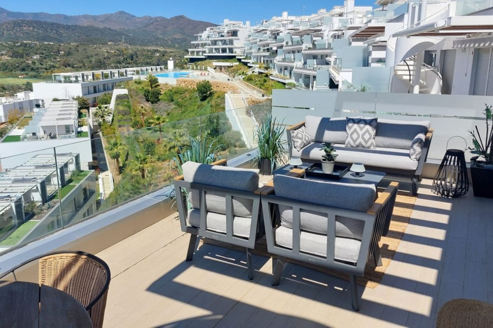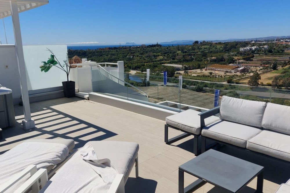 - This modern 2-bedroom penthouse for sale on Estepona's New Golden Mile, consists of approximately 89 m² of interior space with 62 m² of terraces, including a private solarium with panoramic sea and mountain views, and is competitively priced at €550,000. Located within the Oceana Views community, the property combines contemporary design with strong value positioning in a recently built development. With an asking price of €550,000, this 2-bedroom penthouse offers full furniture inclusion and excellent outdoor living. Positioned within a secure gated community, it enjoys proximity to amenities, the beach and village life. Property Highlights: * 2 bedrooms and 2 bathrooms including en-suite * Priced at €550,000, approximately 10% below comparable units * 27 m² main terrace plus 35 m² rooftop solarium * Panoramic sea, mountain and river valley views * Fully furnished with large furniture included * Underground parking and private storage included * Lift access from garage and pool level * Community allows application for rental licences Interior Layout The apartment is designed with a practical open-plan layout, maximising natural light through full-width floor-to-ceiling sliding doors. The living, dining and kitchen areas flow seamlessly, creating a bright and functional space for everyday living. The kitchen is fully fitted with modern appliances, while both bedrooms are well-proportioned doubles. The primary bedroom includes an en-suite bathroom, and the second bedroom is served by a separate guest bathroom. Shutters are fitted throughout for comfort and privacy. Terraces and Views Outdoor space is a key feature, beginning with a 27 m² terrace directly off the living area, offering open views across the Guadalmansa river valley towards the sea and surrounding mountains. A staircase leads to the 35 m² rooftop solarium, which enjoys all-day sun and uninterrupted panoramic views extending to Gibraltar and the African coastline. The terrace orientation ensures sun from midday through to sunset. Community and Location Oceana Views is a modern gated community completed in 2021, featuring landscaped gardens and a large communal pool. Residents also have the option to join the nearby Santa Vista Clubhouse, which offers a gym, indoor pool and social facilities. The property is located on the New Golden Mile, within a 10-minute walk of Cancelada village, where a range of restaurants, shops and supermarkets are available. The beach is approximately a further 10-minute walk, while public transport links provide easy access to Estepona, Puerto Banús and Marbella. Why this Penthouse Stands Out: * Strong value pricing compared to similar units * Dual outdoor spaces including rooftop solarium * Turnkey condition with furniture included * Rental licence pathway already approved by community * Walkable access to village amenities and beach FAQs How much are the total purchase costs? Purchase costs are approximately 10% of the property price. For a €550,000 property, this is around €55,000, giving a total budget of approximately €605,000 (£520,000 / $650,000). We’ll confirm exact figures when making an offer. Can the property be used for holiday rentals? Yes. While a licence is not currently in place, the community has approved the ability for owners to obtain one, subject to application and local regulations. How far is the beach? The beach is approximately a 15–20 minute walk, crossing via pedestrian bridges from Cancelada village. What facilities are available in the community? The community offers a large swimming pool and landscaped gardens, with optional membership at the nearby Santa Vista Clubhouse. Is the property accessible by lift? Yes. The penthouse has lift access from both the underground parking and pool level.