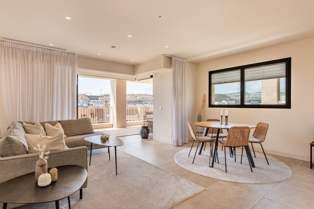 - Exclusive Contemporary Living in La Cala de Mijas A rare opportunity to acquire a stunning, modern four-bedroom apartment in one of the most prestigious developments on the sun-drenched side of the La Cala de Mijas valley. This exceptional residence enjoys a privileged corner position with natural light flowing in from three directions, creating an airy and luminous atmosphere throughout. The expansive southwest-facing terrace is a true highlight—offering panoramic views of the Mediterranean Sea and surrounding mountains, with breathtaking sunsets that define Costa del Sol living. As evening falls, the clear skies reveal a spectacular display of stars and the light from the mountains. The apartment comprises four beautifully appointed bedrooms. Two feature en-suite bathrooms, while the remaining two share a stylishly designed bathroom. A separate guest WC includes a discreetly integrated laundry area. Soft tones, elegant finishes, and abundant natural light define each bedroom, with two offering direct access to the terrace. At the heart of the home lies a sophisticated open-plan living area, seamlessly integrating the kitchen, dining, and lounge spaces. The fully fitted kitchen is equipped with high-end appliances and designed for both functionality and social interaction. Floor-to-ceiling sliding glass doors disappear seamlessly into the structure, creating a fluid transition between indoor and outdoor living—perfectly suited to the region’s exceptional climate. The indoor climate is regulated by integrated air-condition (areothermia) and under floor heating through out the whole apartment. Quality is evident throughout, with premium materials and finishes in both kitchen and bathrooms. Enhanced insulation and energy-efficient glazing ensure tranquility, privacy, and optimal energy performance. A unique eco-filtration system provides purified drinking water directly from the taps, adding a further layer of convenience and sustainability. The property is located within the exclusive gated community of Azalea, offering 24-hour security and impeccably maintained surroundings. Residents enjoy beautifully landscaped gardens, scenic walkways, and access to three swimming pools, including a heated pool for year-round use. Luxurious sunbeds and partially submerged loungers create a resort-style atmosphere. Additional amenities include a fully equipped gym and cardio studio, supporting a healthy and active lifestyle. The apartment also benefits from two private parking spaces, a spacious storage room, and direct lift access connecting all levels for maximum convenience. This is a home designed for effortless living—where comfort, security, and elegance come together to create a truly exceptional lifestyle.