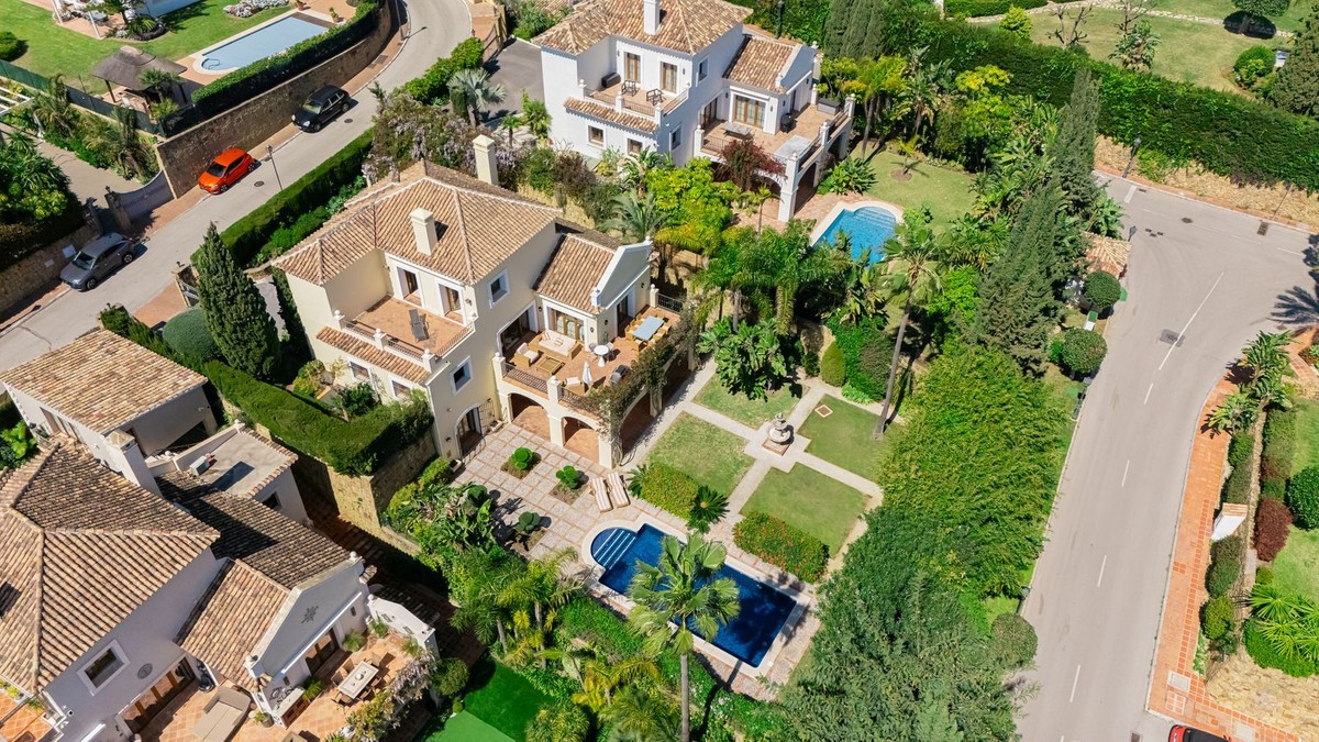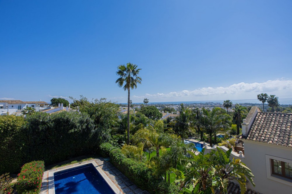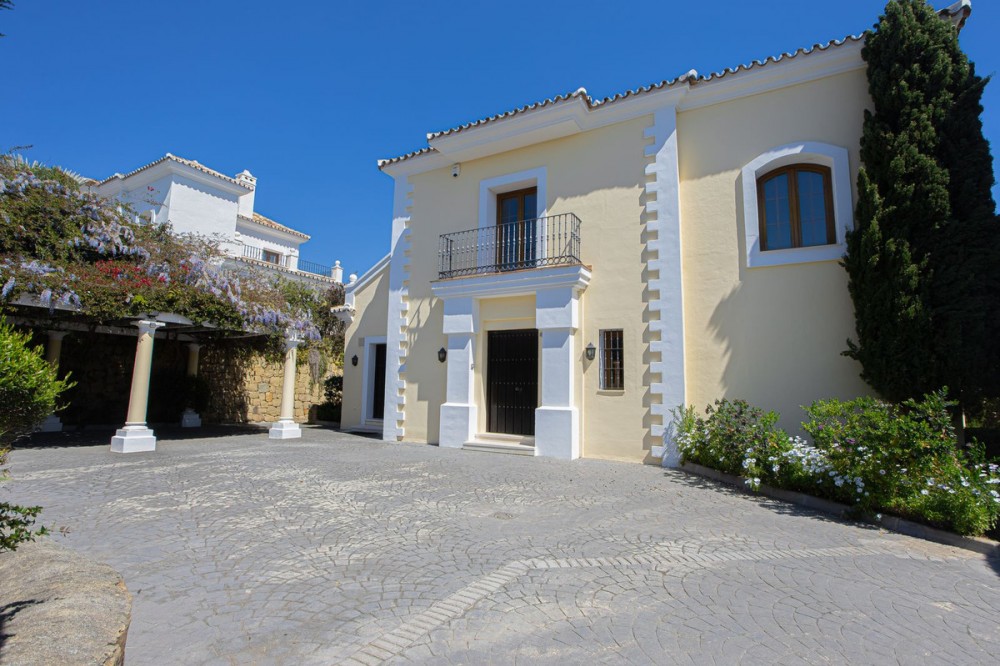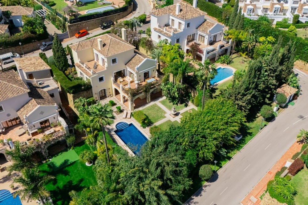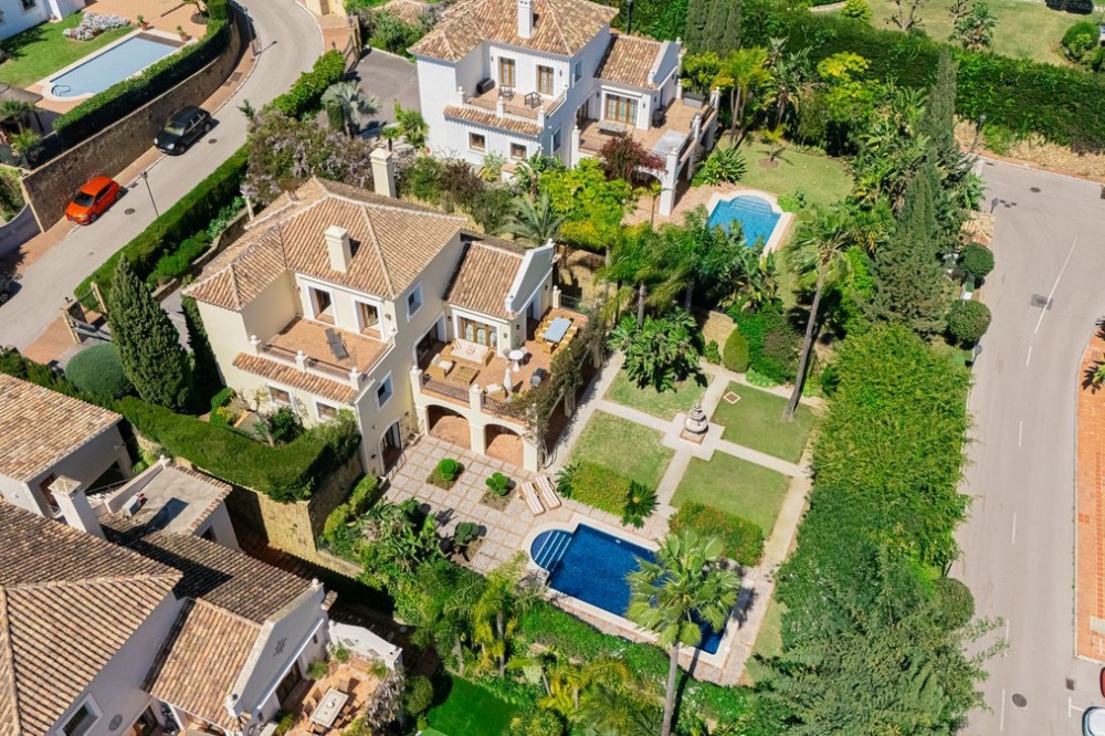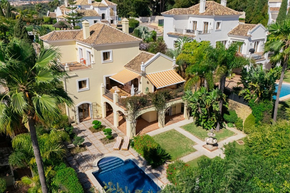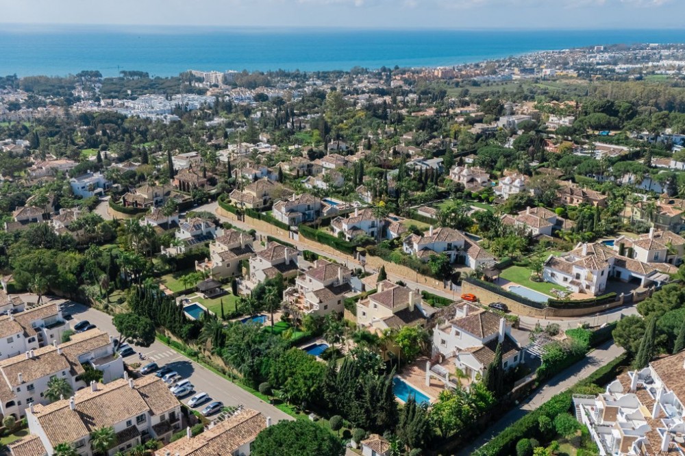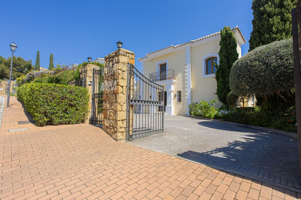 - Mediterranean style independent villa ready to move into, very bright & spacious with excellent sea views Built to the highest construction standards, in the most sought after area of El Paraiso Full tourist license €€€ The villa has five bedrooms + four bathrooms + one guest toilet, large living room, modern kitchen, and ample garden with private heated swimming pool The outdoor areas and gardens are perfect to entertain guests The villa is set on an elevated position with panoramic sea views from the main terrace and master bedroom terrace Less than a 5 minute drive to the beach + shops + restaurants + supermarkets Only a 15 minute walk to a commercial centre with many restaurants and a McDonald's drive through restaurant Upstairs, the top floor master bedroom is very spacious with a cathedral height ceiling, a fireplace, en-suite bathroom with bathtub and shower, and a private terrace with spectacular panoramic sea & coastal views Ground floor level has four more bedrooms, all very spacious and bright, two of which open onto the garden and swimming pool The exterior of the property is equally impressive, with beautifully landscaped gardens with a feature fountain in the middle, mature trees, and a private swimming pool, and an extensive driveway provides covered parking for multiple vehicles The gardens grounds and layout is ideal for entertaining guests, and has hosted a wedding with 150 guests in the past The modern kitchen features light wood cabinetry, a peninsula island, and a dining table for 8 guests, there is also a separate laundry room with staff entrance, and guest bathroom on the main living floor This is a Single Home built quality villa Individual air conditioning (cold + hot) throughout the villa, marble underfloor heating throughout the villa as well, and high quality building materials and furnishings give this villa a homely and welcoming feeling the moment you enter A truly outstanding home in one of the Costa del Sol's most sought-after residential areas.