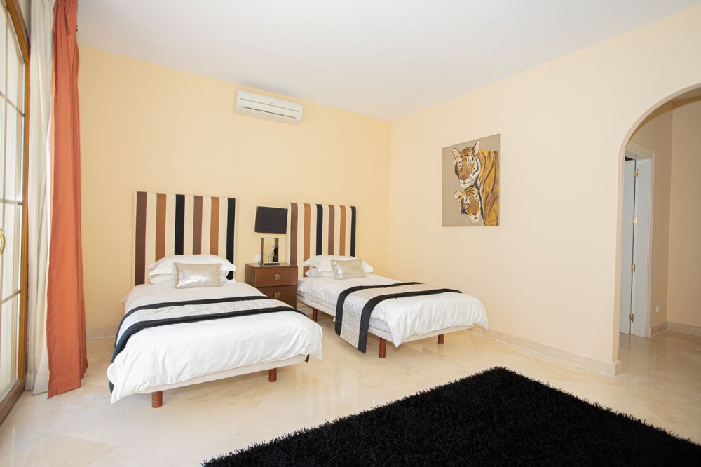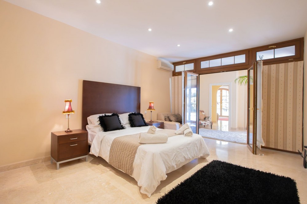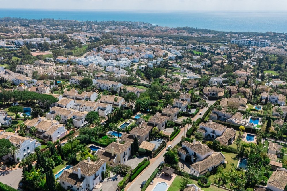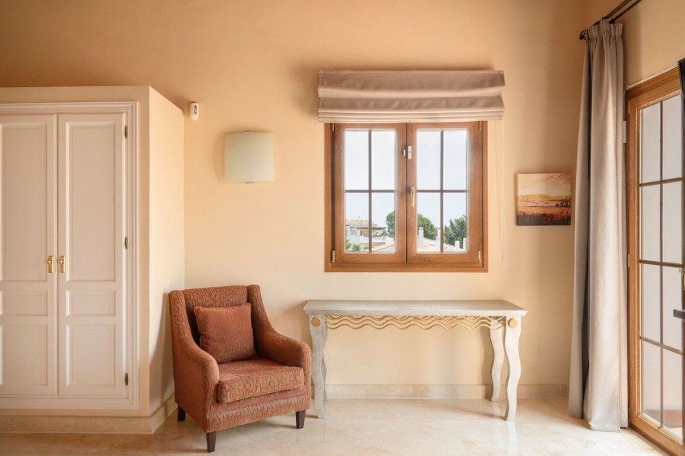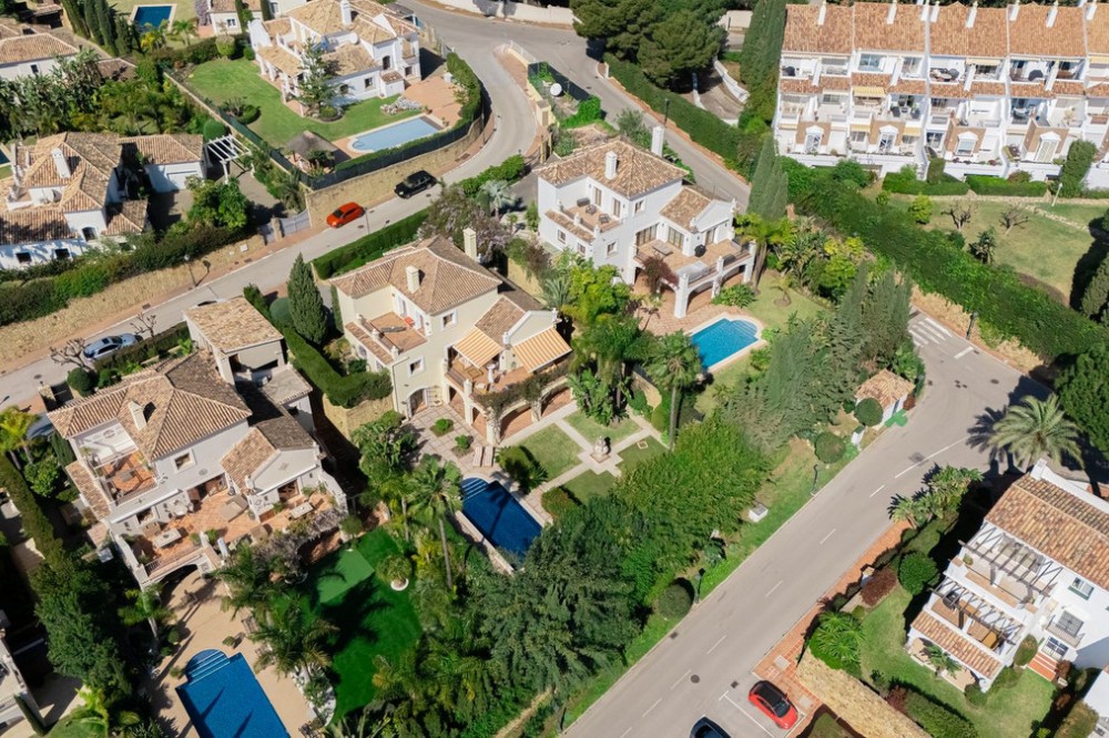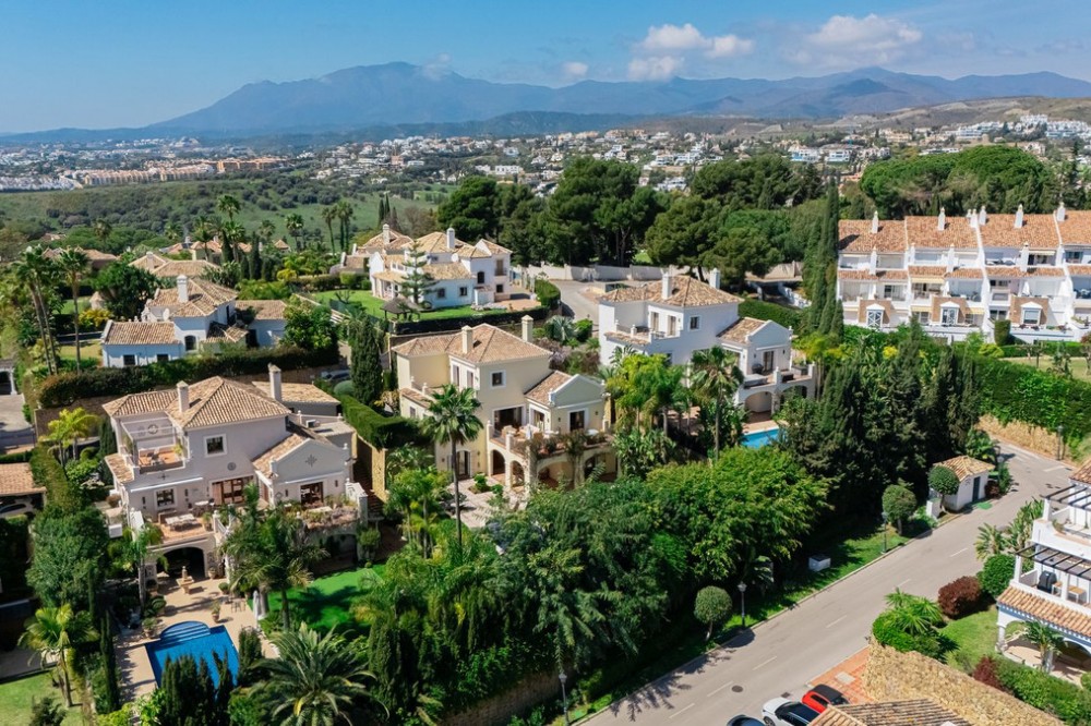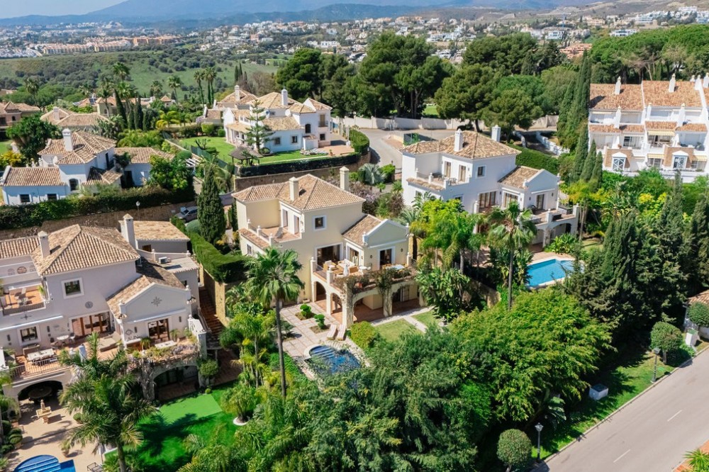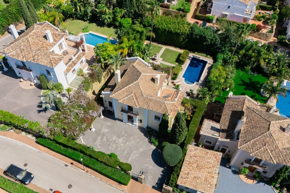 - Mediterranean style independent villa ready to move into, very bright & spacious with excellent sea views Built to the highest construction standards, in the most sought after area of El Paraiso Full tourist license €€€ The villa has five bedrooms + four bathrooms + one guest toilet, large living room, modern kitchen, and ample garden with private heated swimming pool The outdoor areas and gardens are perfect to entertain guests The villa is set on an elevated position with panoramic sea views from the main terrace and master bedroom terrace Less than a 5 minute drive to the beach + shops + restaurants + supermarkets Only a 15 minute walk to a commercial centre with many restaurants and a McDonald's drive through restaurant Upstairs, the top floor master bedroom is very spacious with a cathedral height ceiling, a fireplace, en-suite bathroom with bathtub and shower, and a private terrace with spectacular panoramic sea & coastal views Ground floor level has four more bedrooms, all very spacious and bright, two of which open onto the garden and swimming pool The exterior of the property is equally impressive, with beautifully landscaped gardens with a feature fountain in the middle, mature trees, and a private swimming pool, and an extensive driveway provides covered parking for multiple vehicles The gardens grounds and layout is ideal for entertaining guests, and has hosted a wedding with 150 guests in the past The modern kitchen features light wood cabinetry, a peninsula island, and a dining table for 8 guests, there is also a separate laundry room with staff entrance, and guest bathroom on the main living floor This is a Single Home built quality villa Individual air conditioning (cold + hot) throughout the villa, marble underfloor heating throughout the villa as well, and high quality building materials and furnishings give this villa a homely and welcoming feeling the moment you enter A truly outstanding home in one of the Costa del Sol's most sought-after residential areas.