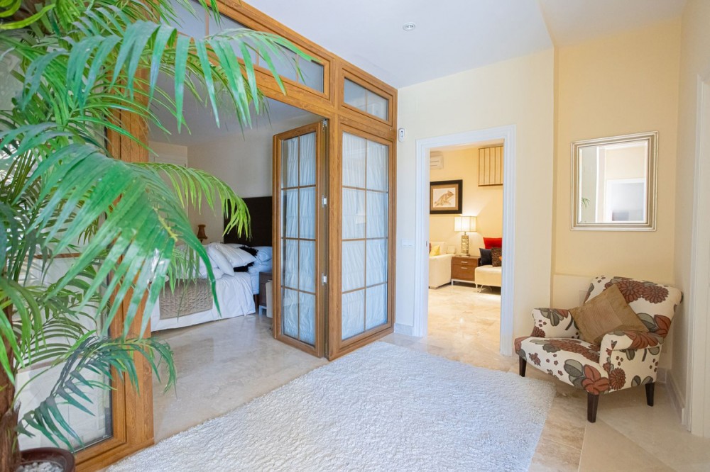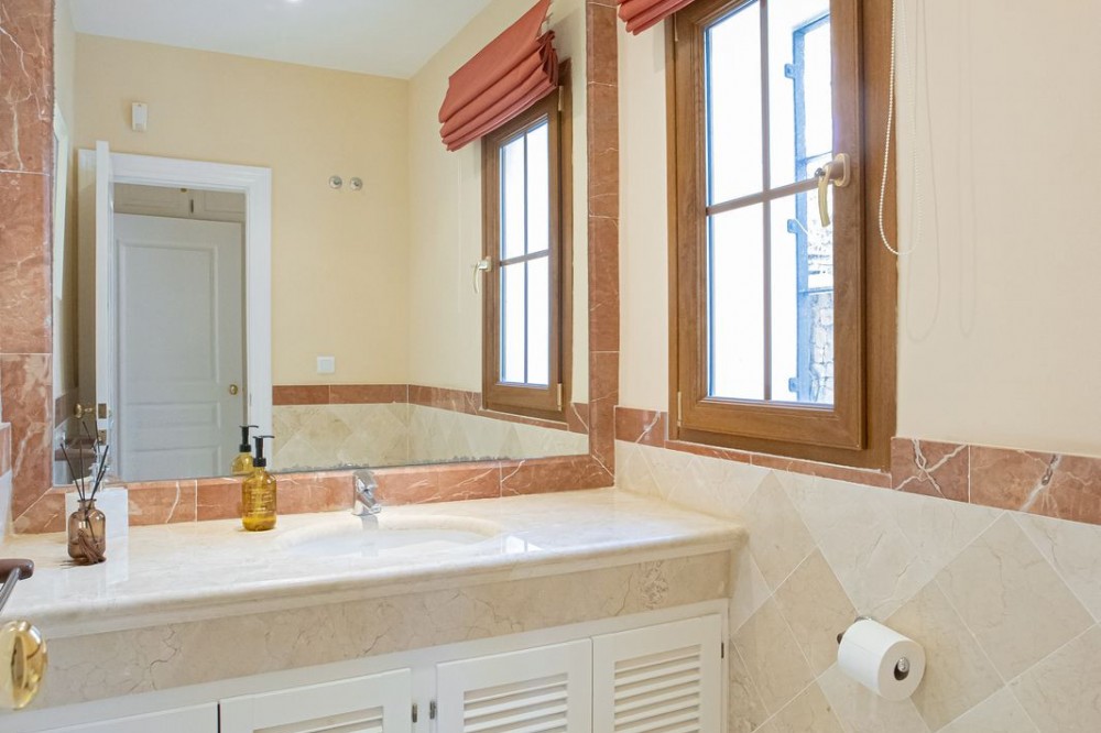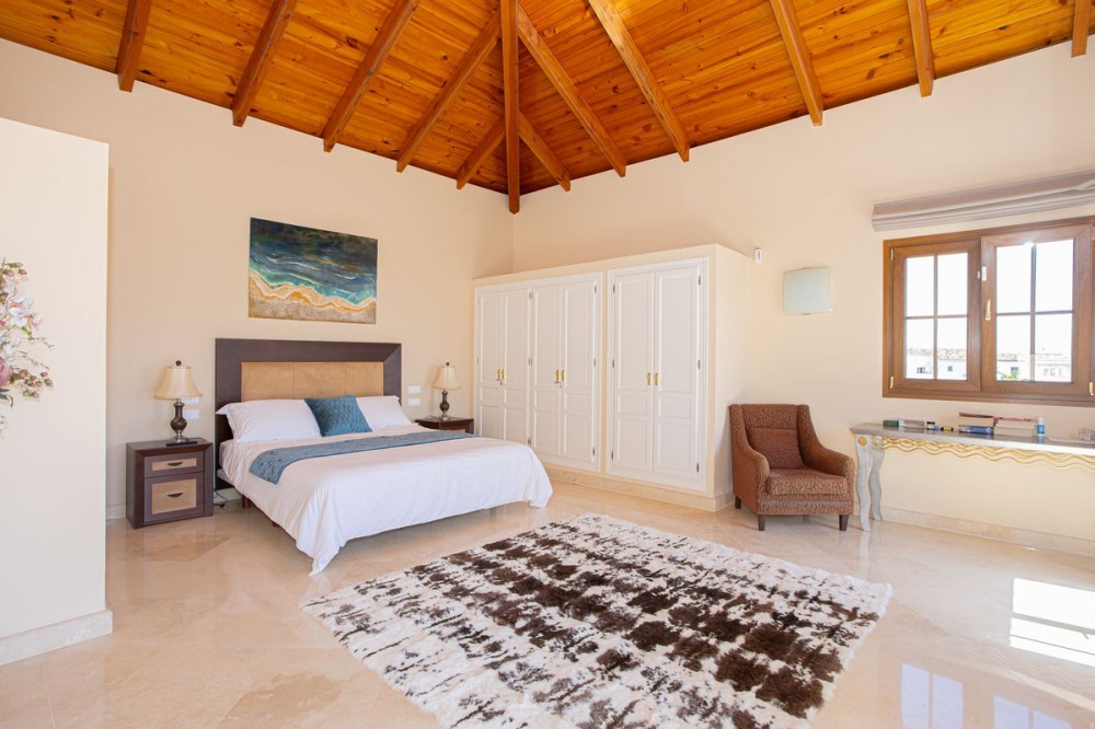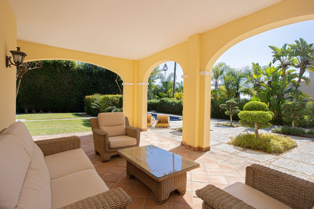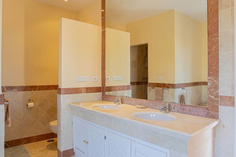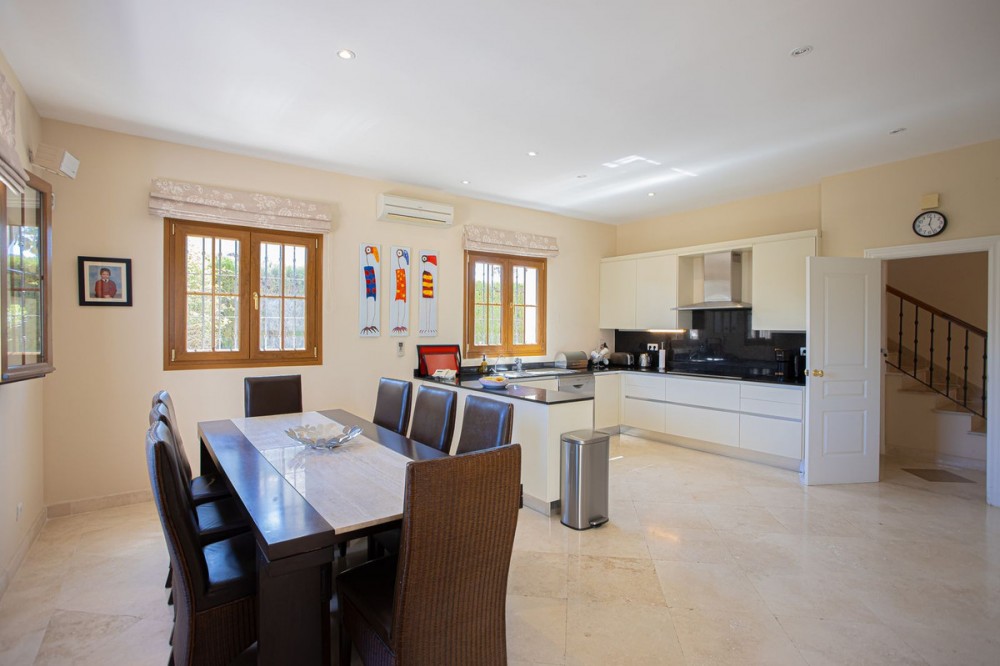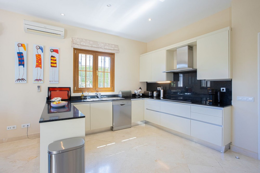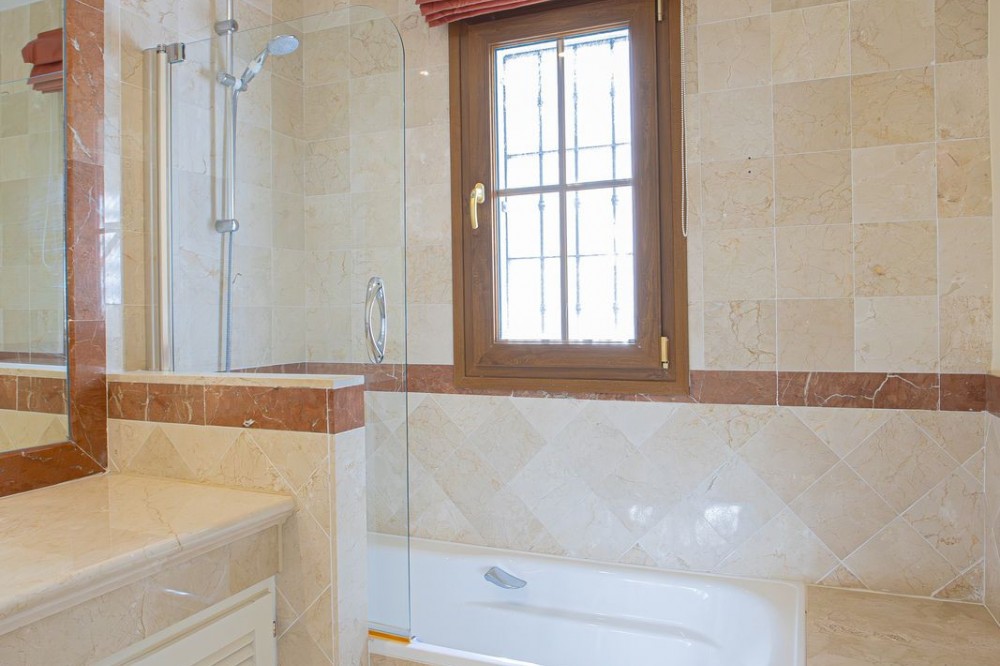 - Mediterranean style independent villa ready to move into, very bright & spacious with excellent sea views Built to the highest construction standards, in the most sought after area of El Paraiso Full tourist license €€€ The villa has five bedrooms + four bathrooms + one guest toilet, large living room, modern kitchen, and ample garden with private heated swimming pool The outdoor areas and gardens are perfect to entertain guests The villa is set on an elevated position with panoramic sea views from the main terrace and master bedroom terrace Less than a 5 minute drive to the beach + shops + restaurants + supermarkets Only a 15 minute walk to a commercial centre with many restaurants and a McDonald's drive through restaurant Upstairs, the top floor master bedroom is very spacious with a cathedral height ceiling, a fireplace, en-suite bathroom with bathtub and shower, and a private terrace with spectacular panoramic sea & coastal views Ground floor level has four more bedrooms, all very spacious and bright, two of which open onto the garden and swimming pool The exterior of the property is equally impressive, with beautifully landscaped gardens with a feature fountain in the middle, mature trees, and a private swimming pool, and an extensive driveway provides covered parking for multiple vehicles The gardens grounds and layout is ideal for entertaining guests, and has hosted a wedding with 150 guests in the past The modern kitchen features light wood cabinetry, a peninsula island, and a dining table for 8 guests, there is also a separate laundry room with staff entrance, and guest bathroom on the main living floor This is a Single Home built quality villa Individual air conditioning (cold + hot) throughout the villa, marble underfloor heating throughout the villa as well, and high quality building materials and furnishings give this villa a homely and welcoming feeling the moment you enter A truly outstanding home in one of the Costa del Sol's most sought-after residential areas.