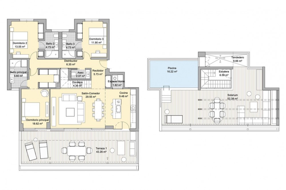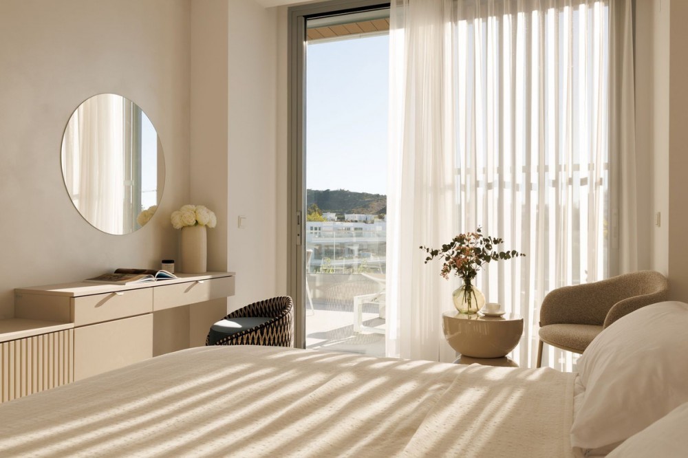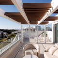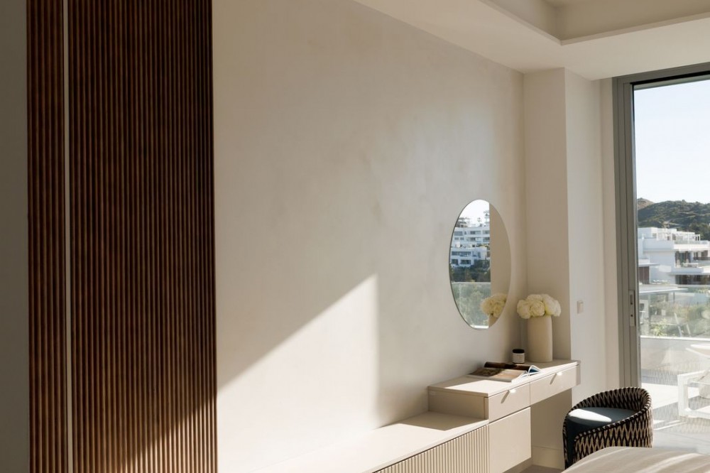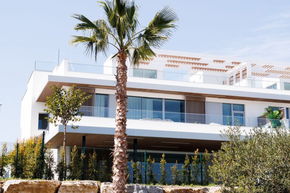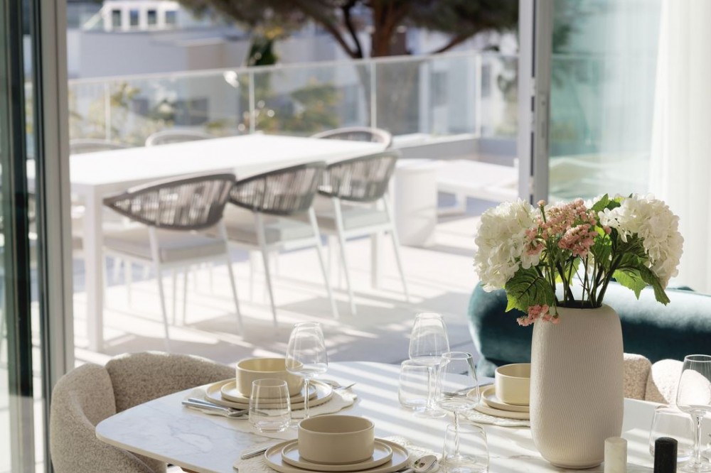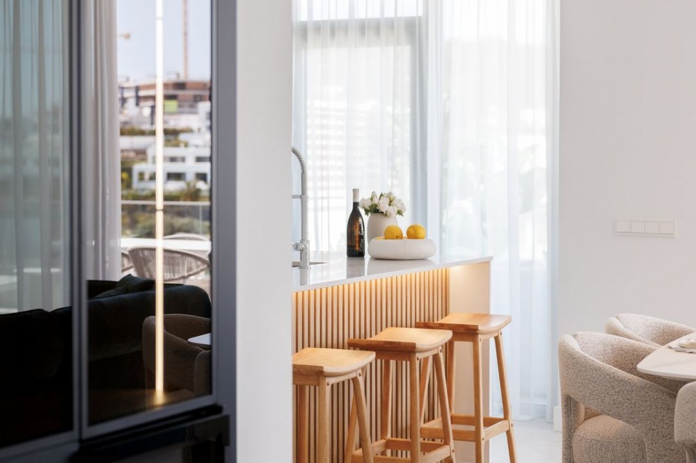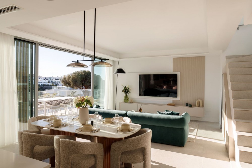 - Experience elevated living in this stunning duplex penthouse, perfectly positioned frontline golf and surrounded by lush greenery and mountain views. This beautifully designed home offers three spacious bedrooms and three elegant bathrooms, alongside a bright open-plan kitchen with a central island that flows seamlessly into the living area, creating a natural connection between indoor and outdoor spaces. The property is fully furnished in a contemporary style, with clean lines and warm finishes enhancing the sense of comfort and sophistication. The true highlight of this penthouse is the impressive 128 m² of terraces, designed for both relaxation and entertaining, featuring a private swimming pool, stylish lounge areas, a covered outdoor dining space, and open views over landscaped gardens and modern architecture. The east-facing orientation allows for soft morning light and pleasant temperatures throughout the day, making the outdoor areas enjoyable year-round. Located within a secure gated community with 24-hour security, the property offers access to exceptional amenities including a large outdoor swimming pool, indoor pool, sauna, fully equipped gym, and beautifully maintained green areas. It also includes two underground parking spaces and a storage room, adding convenience and practicality. The location is ideal, just a 15-minute walk to the beach, close to a variety of beach restaurants and clubs, and with schools nearby, offering the perfect balance between peaceful surroundings and easy access to everything needed for everyday living. This is an outstanding opportunity for a luxury holiday home, investment, or permanent residence in one of the most desirable areas.