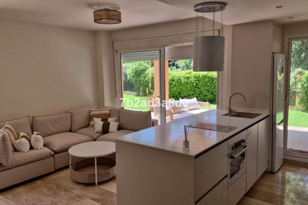 - Beachfront Urbanisation – Unique Opportunity by the Sea A rare opportunity to acquire a beautifully presented 2-bedroom, 2-bathroom apartment just 40 metres from Alicate Beach, one of Marbella’s finest stretches of coastline. The property features a recently renovated open-plan kitchen, finished to a high standard and seamlessly integrated into the living area, along with fully refurbished bathrooms. The bright living space opens onto a generous covered porch, which can be enclosed with glass curtains to create up to an additional 30 m² of usable living area—perfect for year-round enjoyment. Surrounding the property is a spacious private corner garden with a south-east orientation, offering abundant natural light from morning through to sunset. Ideally located in a მშვიდ and established area, the apartment enjoys both privacy and proximity to all amenities. It is close to top golf courses, supermarkets, and essential services, while Marbella town centre is just a 10-minute drive away. This property represents an excellent choice as a permanent residence, a holiday home, or a strong investment opportunity, with short-term rentals permitted by the community.