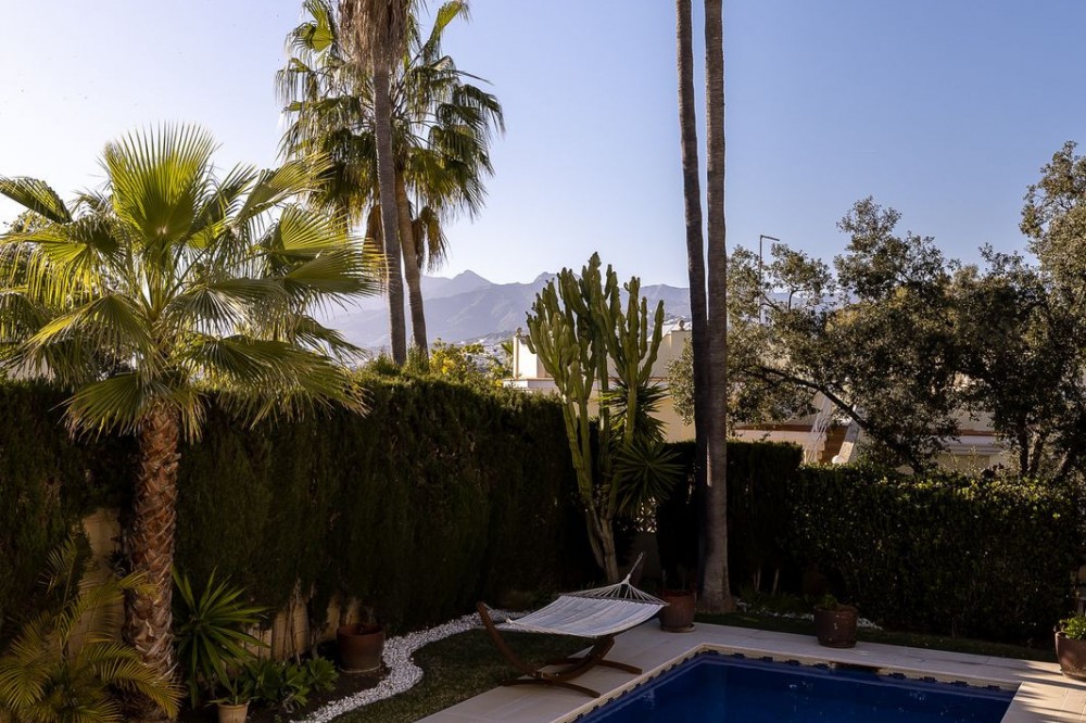 - Fully furnished, recently renovated villa located in a prestigious gated and secure community in El Rosario, Marbella East. The property sits on a private plot of 1,088 m² with a total built area of 558 m², distributed over three levels (2 floors + basement). The villa is in excellent condition, following renovation and extension completed in 2020, and is ready for immediate use. The property has also been featured in Architectural Digest, highlighting its design quality and aesthetic appeal. Layout: Spacious living and dining area with direct access to terraces and garden Fully equipped kosher-style kitchen (2 sinks, 2 refrigerators, 2 dishwashers) Multiple bedrooms and bathrooms Basement level (-1), with natural light and windows, divided into two areas: * large open space suitable for gaming room / cinema / gym * independent unit with bedroom, bathroom, walk-in closet and pre-installations for a kitchen, with separate entrance from the garden — ideal for staff or guests Outdoor area: Private swimming pool Landscaped garden with mature greenery Several terrace areas Mountain views High level of privacy Additional information: Sold fully furnished and equipped Located in a secure gated community Short-term rentals (Airbnb) are not permitted in the community Ideal as a second home or for permanent living Very suitable for a family, including with staff