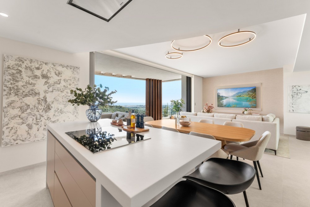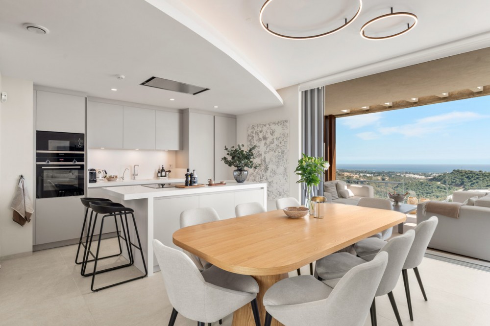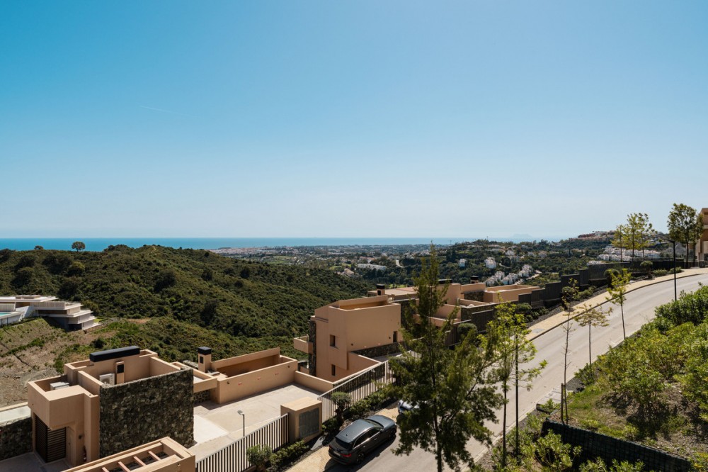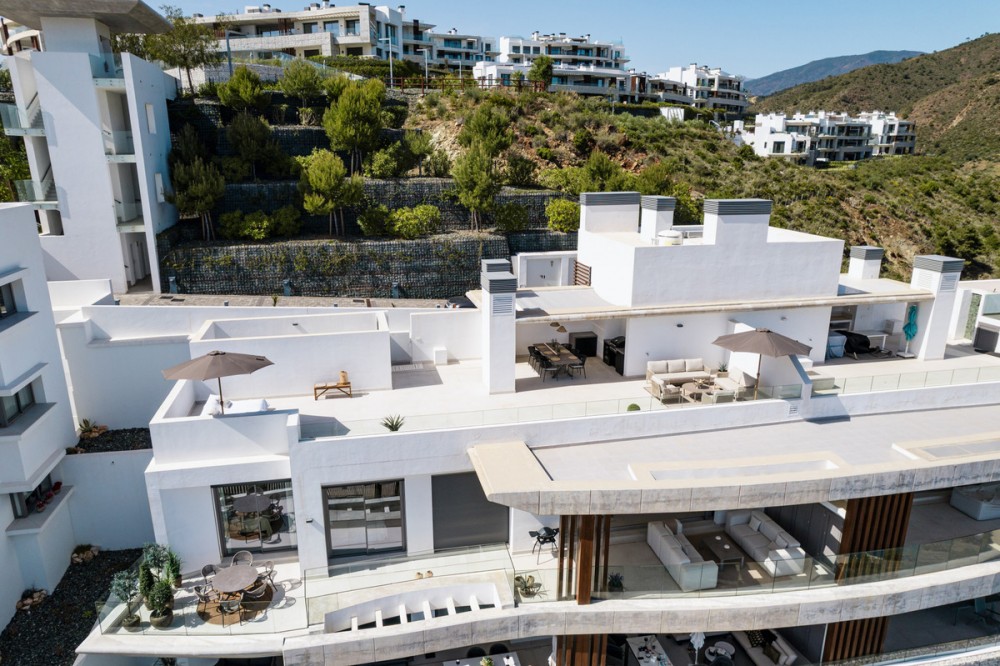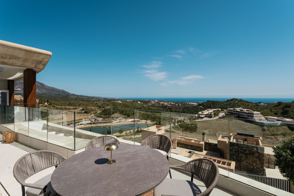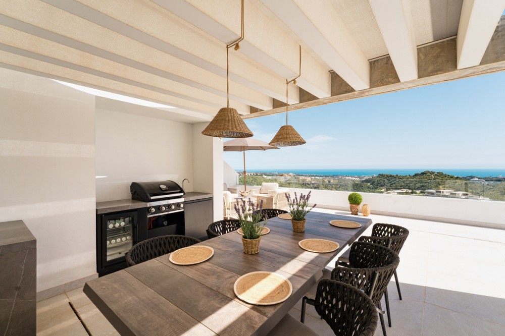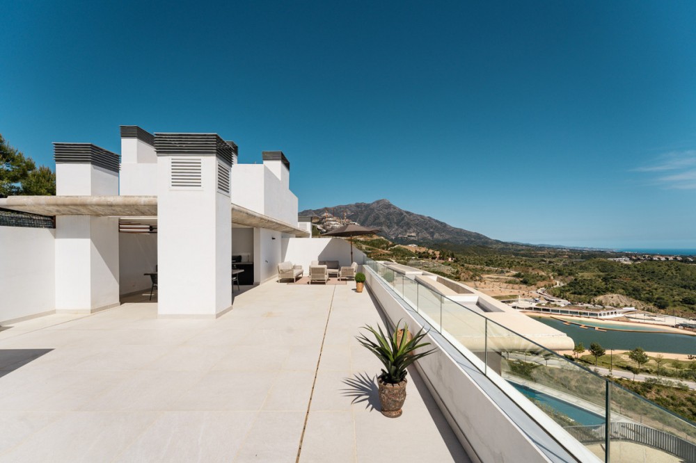 - This duplex penthouse for sale in Quercus, Real de la Quinta, Benahavís offers three bedrooms, two bathrooms, 138 m² of interior space, 68 m² of terraces, and a 128 m² private solarium, featuring a south-facing orientation with open views of the sea, golf course, and surrounding mountains. The property combines contemporary Scandinavian design with natural materials, creating a bright and functional living environment within a secure and well-planned residential community. The interior layout is designed around an open-plan living area that connects seamlessly with the kitchen and dining space, allowing for a natural flow throughout the main level. Large windows maximise natural light and frame the surrounding landscape, while the use of stone finishes and oak wood details adds warmth and consistency to the design. The kitchen is fully equipped with Siemens appliances, combining clean aesthetics with everyday practicality, making it suitable for both daily living and entertaining. The property includes three well-proportioned bedrooms, all designed to prioritise comfort and privacy. The master bedroom features an en-suite bathroom with underfloor heating and benefits from direct light and open views. Two additional bedrooms share a second bathroom, maintaining the same level of quality and finish found throughout the home. The overall distribution ensures a balanced separation between living and sleeping areas. Outdoor spaces are a key feature of this penthouse, with a total of 195 m² combining terraces and solarium areas. The main terrace includes a covered lounge and dining area, ideal for year-round use, while the rooftop solarium provides additional space for relaxation and entertaining, complete with an outdoor kitchen, dining area, and sunbathing zones. From the terrace, residents can enjoy a unique and ever-changing scenery. On clear days, the views extend across the Mediterranean towards Gibraltar and the Atlas Mountains of North Africa, creating a striking natural backdrop that enhances the outdoor living experience. The property is located within a gated community in Real de la Quinta, offering 24-hour security and a range of practical features including double glazing, electric blinds, a lift, an alarm system, two underground parking spaces, and a storage room. The development is known for its modern architecture and integration with the natural environment, creating a low-density and private residential setting. Real de la Quinta is recognised for its natural surroundings and lifestyle offering, including a private lake for water activities such as paddleboarding and kayaking, as well as access to walking and cycling trails in the nearby hills. Golf facilities are available at La Quinta Golf & Country Club, while additional sports options include tennis and paddle courts in the area. Dining options nearby include Los Arqueros Restaurant and Sakura, offering a variety of international cuisine, while shopping can be found at Centro Comercial Los Halcones and La Heredia. The area is well connected by road via the AP-7, providing access to nearby coastal towns and key destinations along the Costa del Sol. Educational options include Atalaya International School, making the location suitable for families as well as second-home buyers. Real de la Quinta also stands out for its commitment to sustainability, being one of the first developments in Spain to receive infrastructure planning certification from BREEAM. This property offers a combination of modern design, generous outdoor space, and a well-connected natural setting, making it a strong option for buyers seeking a contemporary home in a secure and established residential environment in Benahavís.