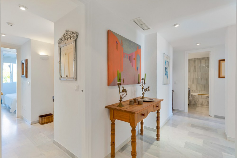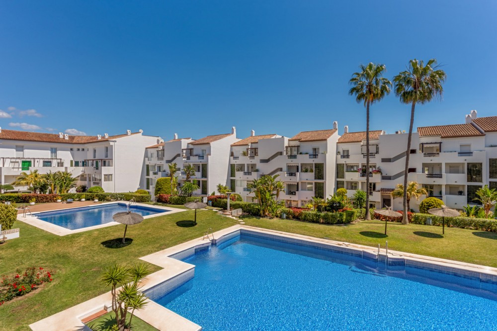 - Spacious three-bedroom ground floor apartment situated in the sought-after community of Las Jacarandas, Bel Air, within a gated complex featuring beautifully landscaped gardens, two communal swimming pools, and concierge service. Ideally located close to the beach and a wide range of leisure amenities, including golf courses. This property offers an open-plan living and dining area with direct access to a private terrace and garden; a fully fitted kitchen with an enclosed utility room; two guest bedrooms with access to a private terrace; a guest bathroom; and a master bedroom with en-suite and access to the private garden. Additional features include hot and cold air conditioning, marble flooring, fitted wardrobes and a private parking space.