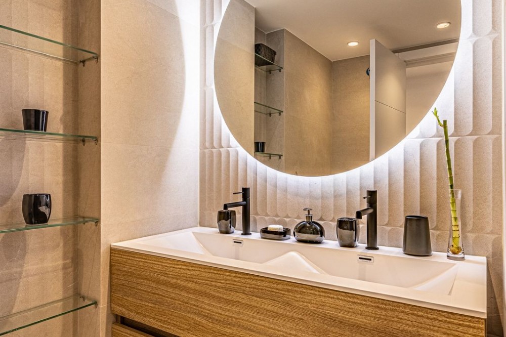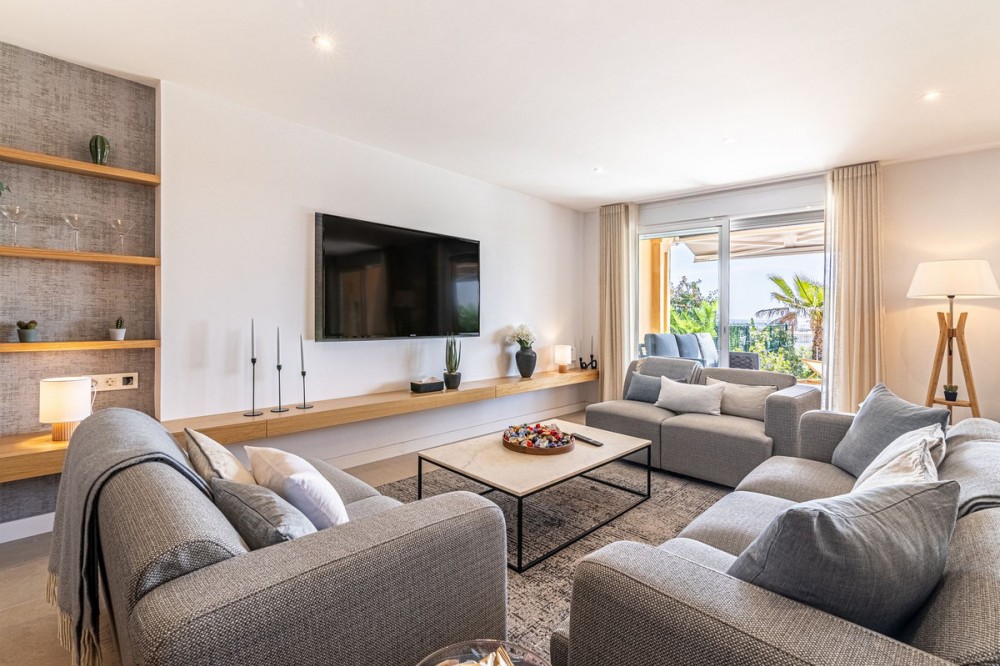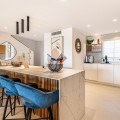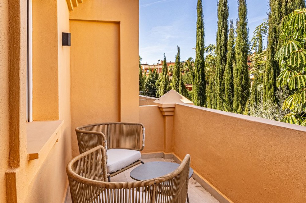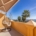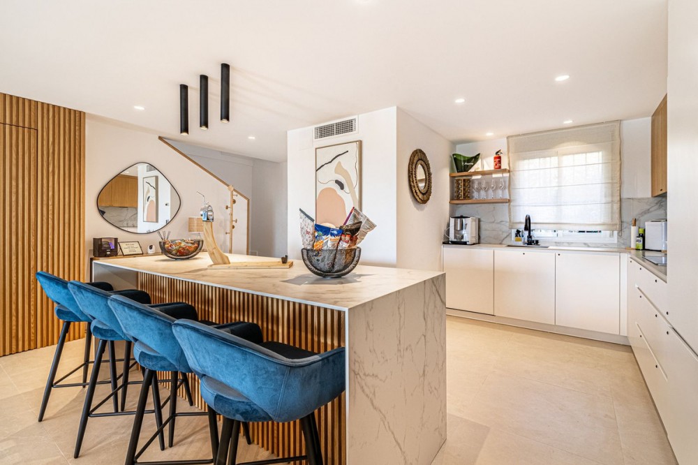 - Luxurious three bedroom and two-bathroom townhouse with a guest toilet, recently renovated with the highest quality of materials. Open plan kitchen, fully equipped with Miele appliances. The comfort & elegancy of the residence has also been assured by the brand-new furniture, tastefully decoration, and the exquisite custom designed woodwork. Featuring Airzone AC system, security system, electric shutters, wine cooler. Private elevator gives the access to all floors from the private, closed garage which offers 2 large parking spaces. Benefiting of several terraces situated both sides of the house, including a large solarium with fantastic views over the sea and towards Gibraltar. The private garden has been also landscaped and equipped with an advanced irrigation system. The community offers two swimming pools, a Padel court and it’s situated just a short walk to the beach and close to amenities. A perfect home which must be seen!