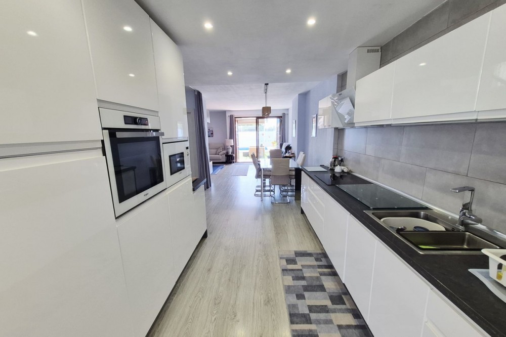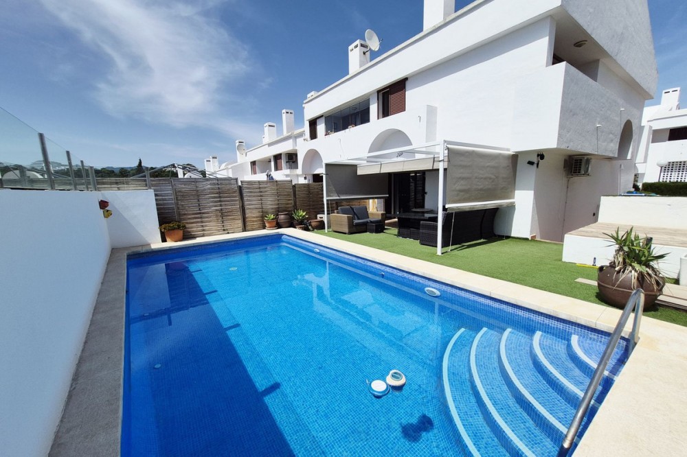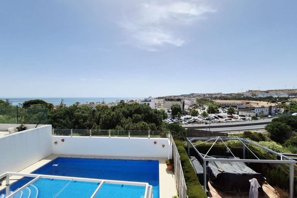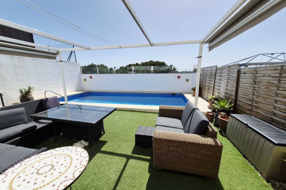 - STUNNING SEMI-DETACHED HOUSE LOCATED WITHIN A 2 MINUTE WALK OF LA CALA VILLAGE. THE PROPERTY OFFERS EXCEPTIONAL INTERNAL LIVING SPACE AS WELL AS EXTENSIVE OUTDOOR SPACE WHICH INCLUDES VARIOUS TERRACES, A ROOF-TOP SOLARIUM AND A PRIVATE SWIMMING POOL. THE HOUSE IS SITUATED ON A LARGE CORNER PLOT WITH A SUNNY SOUTH WEST ORIENTATION AND ENJOYING LOVELY VIEWS OVER LA CALA VILLAGE WITH THE BACKDROP OF THE MEDITERRANEAN BEYOND WHICH SHIMMERS IN THE SUN BY DAY AND DELIGHTS WITH IMPRESSIVE SUNSETS IN THE EVENING. THE PROPERTY IS ACCESSED BY A FEW STAIRS LEADING TO THE ENTRANCE AND COMPRISES OF AN ENTRANCE HALLWAY, GUEST SHOWER ROOM, LAUNDRY / STORAGE ROOM, VAST OPEN PLAN LIVING ROOM / DINING AREA AND LUXURY FITTED KITCHEN. THE LOUNGE HAS A FEATURE PELLET STOVE AND ALSO DIRECT ACCESS TO THE VERY PRIVATE REAR PATIO AND POOL AREA WITH PLENTY OF OUTDOOR SEATING AND ENTERTAINING SPACE. THERE ARE 3 SEPARATE STORAGE ROOMS WHICH ARE IDEAL FOR TOOLS, POOL EQUIPMENT, TERRACE FURNITURE AND CUSHIONS. RETRACTABLE SUN-BLINDS GIVE THE OPTION OF AN OPEN UNCOVERED TERRACE OR SHADED CHILL-OUT AREA TO RELAX IN. UPSTAIRS TO THE 1ST FLOOR THERE IS A GUEST BATHROOM, THREE VERY GENEROUS DOUBLE BEDROOMS, EACH WITH FITTED ROBES AND THE MASTER BEDROOM HAVING IT'S OWN EN-SUITE BATHROOM AND SMALL BALCONY. STAIRS LEAD UP TO THE SOLARIUM WHICH HAS FANTASTIC VIEWS, OUTDOOR SINK AND BUILT-IN BBQ. THE PROPERTY ALSO HAS THE ADDED BENEFIT OF A BASEMENT AREA WHICH WAS ORIGINALLY AN INTERNAL GARAGE AND STORAGE AREA BUT HAS BEEN CONVERTED TO PROVIDE ADDITIONAL LIVING SPACE THAT SERVES AS AN ENORMOUS STUDIO WITH BEDROOM AREA, LOUNGE AND GAMES ROOM. THE SET-UP IS IDEAL TO ALLOW ANY NEW OWNER TO DECIDE HOW THEY WISH TO USE THE SPACE OR EVEN USE PART OF IT AS AN INTERNAL GARAGE AGAIN. THE HOUSE IS WITHIN A GATED COMPLEX OF SIMILAR PROPERTIES ALTHOUGH FEW HAVE THE CORNER POSITION, LARGE PLOT OR PRIVATE POOL. THERE IS A LARGE COMMUNAL POOL FOR OWNERS TO USE IF THEY WISH. THE PROPERTY IS IMMACULATELY PRESENTED AND TASTEFULLY FURNISHED THROUGHOUT WITH THE BENEFIT OF HAVING RECENTLY REFURBISHED, BATHROOMS, FLOORING, INTERNAL DOORS AND A SUPERB KITCHEN. THIS IS A MUST-SEE PROPERTY TO BE ABLE TO FULLY APPRECIATE THE INTERNAL AND EXTERNAL SPACE, BRILLIANT LOCATION AND QUALITY FEATURES AND FITTINGS THROUGHOUT.