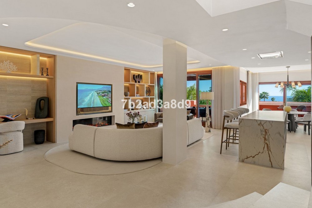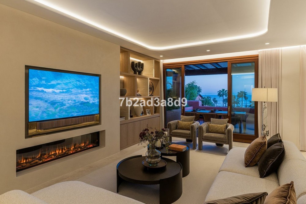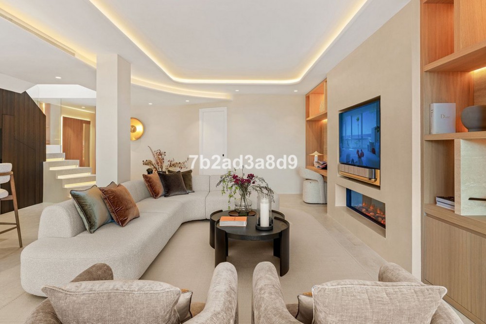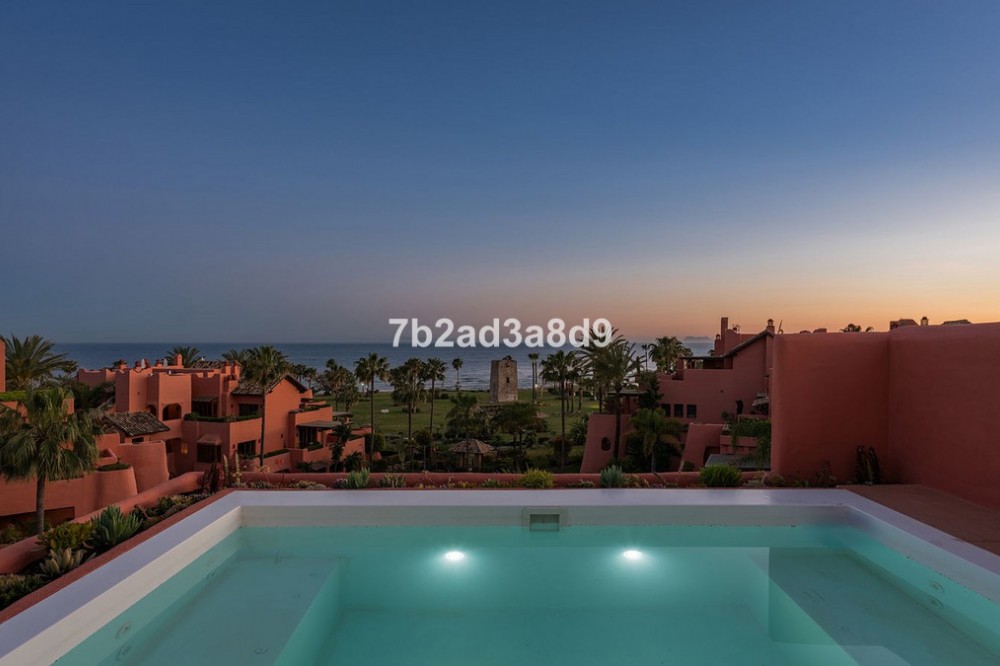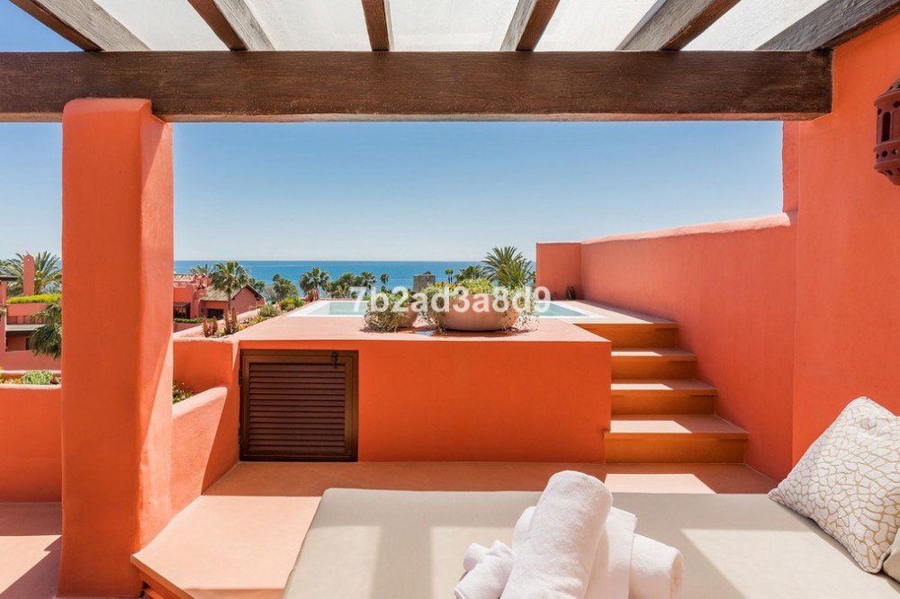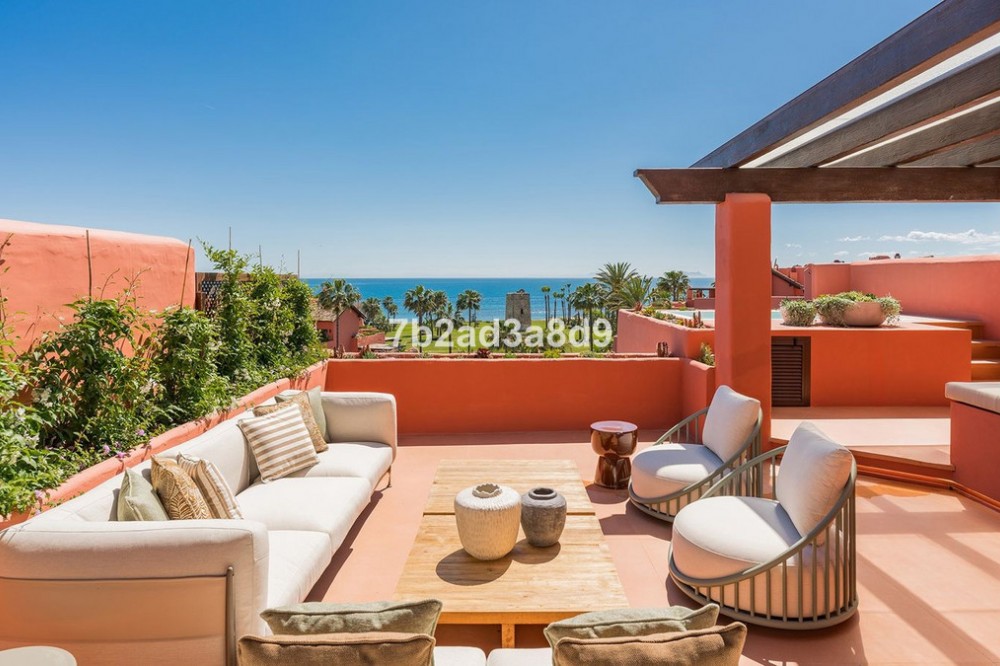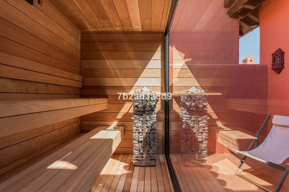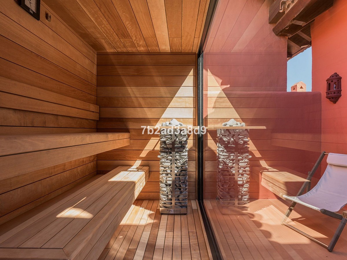 - Presenting Penthouse Bermeja, an elegant andfully renovated penthouse in the beachfront community of Torre Bermeja, Estepona. Located within the prestigious beachfront enclave of Torre Bermeja on Estepona’s coveted New Golden Mile, this remarkable duplex penthouse seamlessly fuses timeless Andalusian architecture with elevated contemporary design. A rare opportunity to own a luxury home in one of the Costa del Sol’s most desirable gated communities, this property is a masterclass in understated elegance and modern comfort. Spanning over 200 square metres of interior space, with an additional 125 square metres of private terraces, the residence is meticulously curated to offer both sophistication and serenity. The open-plan living area is flooded with natural light and anchored by an electric fireplace that adds warmth and character. Custom-built wardrobes, a designer kitchen fitted with premium appliances including a Thermomix and wine fridge, and a Bang & Olufsen integrated sound system all reflect the attention to detail that sets this home apart. The primary suite is a sanctuary of its own, featuring a luxurious walk-in closet, a free-standing bathtub, and direct access to the upper terrace. Step outside to experience the pinnacle of outdoor living: a secluded sun terrace furnished with Kettal pieces, complete with a private sauna and Jacuzzi—ideal for relaxing after a day spent on nearby beaches or world-class golf courses. Additional features include a dedicated laundry room, spacious guest bedrooms, and spa-inspired bathrooms that elevate everyday living. From morning coffee to evening soirees, every corner of this penthouse has been thoughtfully designed for those who demand style, space, and exclusivity. Torre Bermeja is renowned for its 24-hour security, lush tropical gardens, indoor and outdoor swimming pools, gym, and direct access to the promenade and sandy beach beyond. Just minutes from Puerto Banús, Estepona, and Marbella’s Golden Mile, the location offers easy access to fine dining, elite international schools, boutique shopping, and vibrant nightlife.
