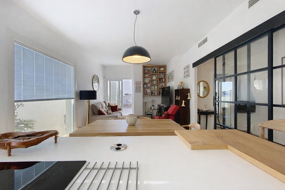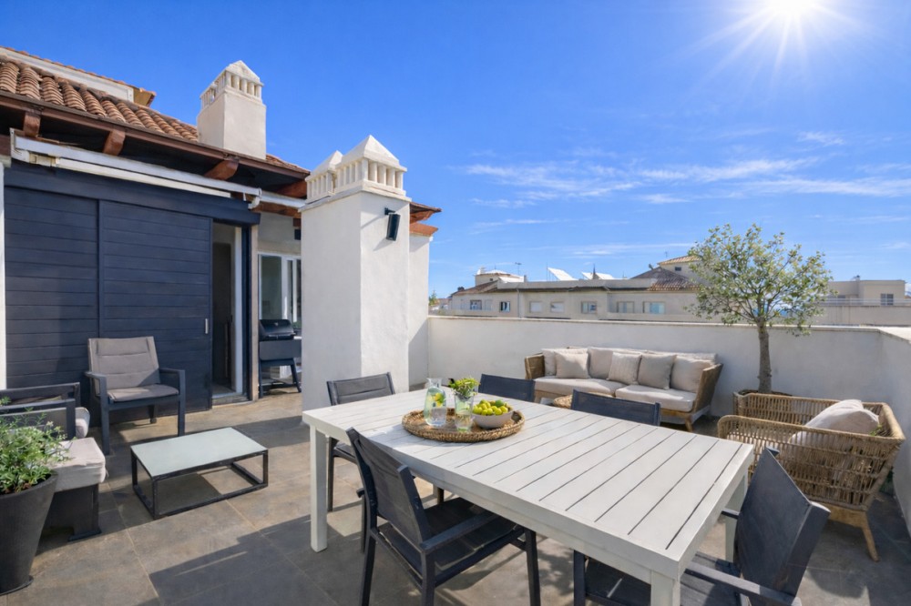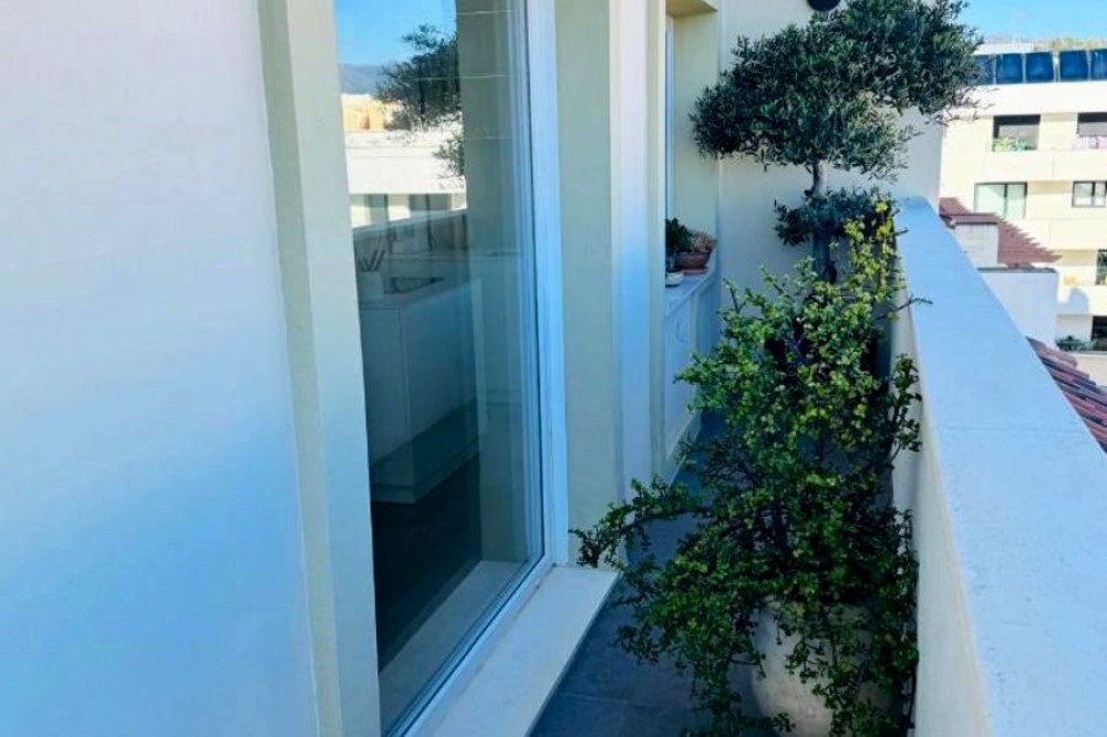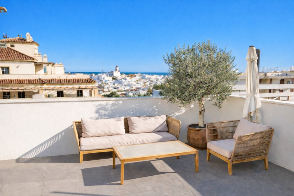 - This sophisticated penthouse offers a unique modern urban living experience and stands out for its impressive panoramic views of the sea, mountains, and and old town, creating an unparalleled setting that invites relaxation and contemplation. Located in a privileged area just steps away from the beach, the promenade, as well as the old town and a multitude of services and amenities concentrated in the center of Estepona, this property not only provides unique comfort but also a contemporary design. From the very first moment, the elegant entrance hall sets the refined character of the home. The fluid and bright layout of the apartment is enhanced by an open-plan living room perfectly integrated with a dining area and a spacious kitchen with a central island and open views, maximizing space and natural light. The true highlight of this penthouse is its spectacular terrace conceived as a private oasis with direct access from the living room. Here the infinite views, a cozy chill-out area, are the perfect setting to enjoy the Mediterranean climate all year round. The property features two bedrooms, designed to ensure maximum comfort. The master suite, with its own private bathroom, provides an intimate retreat, while the second bedroom offers versatility and spaciousness. Additionally, an extra bathroom complements the functionality of the home. To complete this exclusive offering, the apartment located on a high floor with an elevator is equipped with hot and cold air conditioning and also includes a parking space and storage room, ensuring daily convenience.