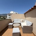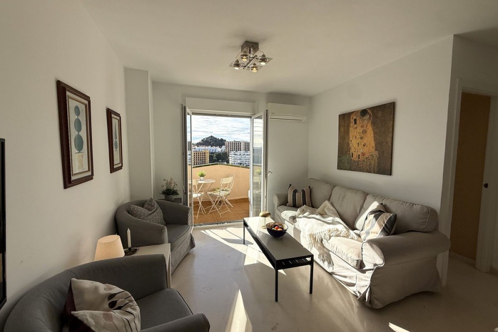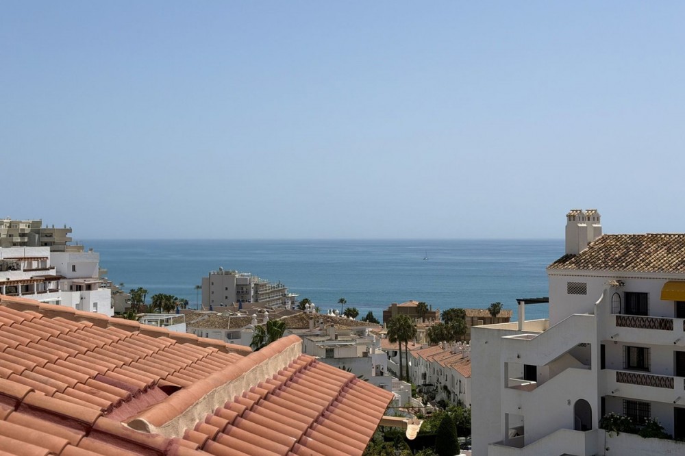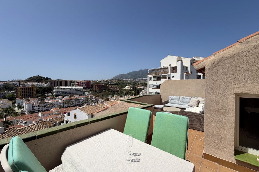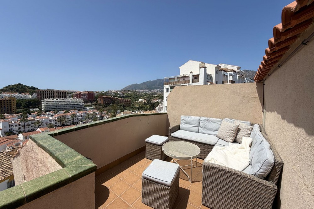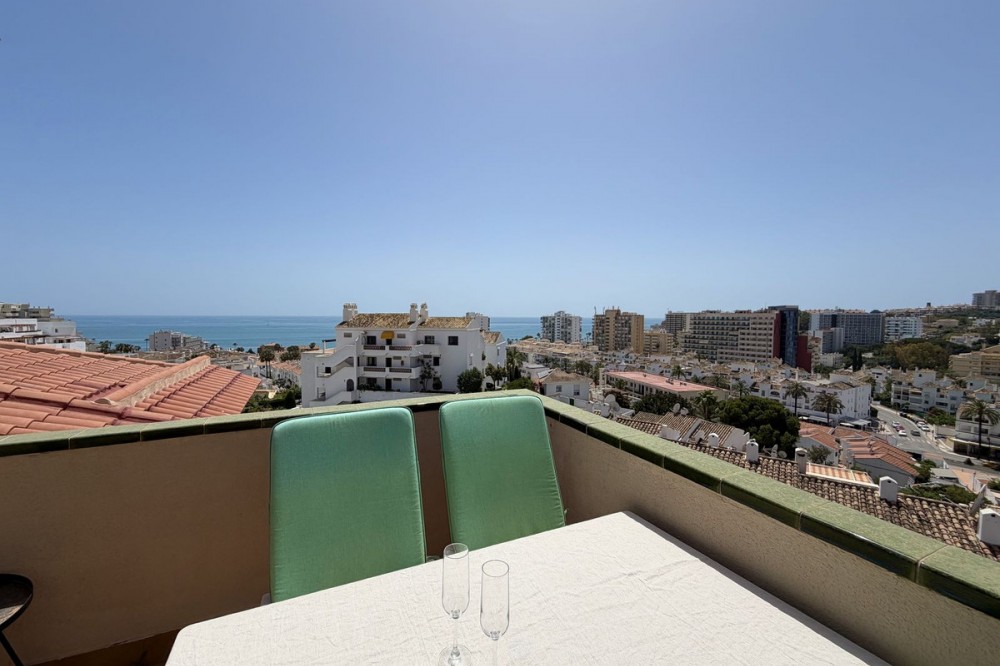 - Welcome to this attractive penthouse in Benalmádena Costa, ideally located just 500 meters from the beach and approximately 2 km from Puerto Marina. The property is situated directly opposite the famous Parque de la Paloma and within walking distance to restaurants, cafés, shops, and all amenities, while still offering a peaceful living environment year-round. The apartment is distributed over two levels with a bright and well-designed layout. On the entrance level, you are welcomed by an open-plan kitchen and living area, creating a social and inviting space. This floor also features a southwest-facing balcony, ideal for enjoying the afternoon and evening sun, along with two bedrooms and one bathroom. Upstairs, you will find a spacious master bedroom with an en-suite bathroom. Part of the room is currently used as storage but can easily be converted into an additional bedroom, office, or guest room. This level also offers a large southwest-facing terrace, perfect for relaxing, sunbathing, or outdoor dining. Both levels enjoy beautiful views of the sea, mountains, and city. With a tourist license already in place and currently used for rentals, this property is an excellent investment opportunity as well as a perfect holiday home or permanent residence.
