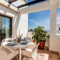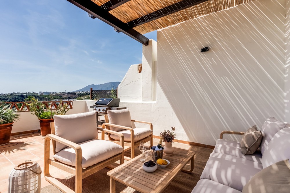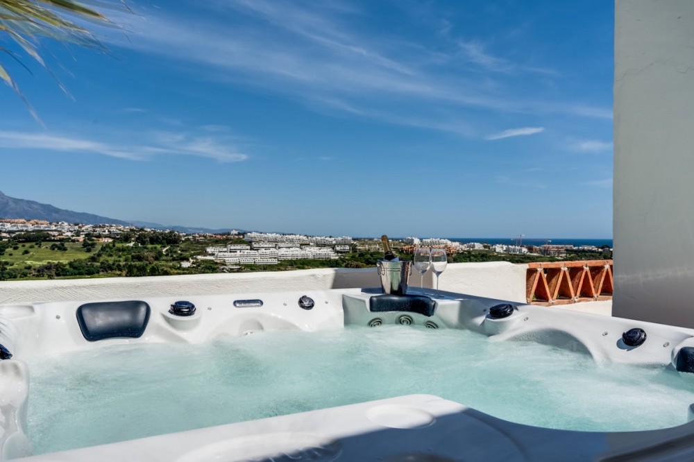 - Perched within the sought-after Sunset Golf urbanisation in Estepona, this stunning south-west facing duplex penthouse offers the perfect blend of luxury, comfort, and breathtaking surroundings. Spanning 100m² of stylish interior space, the property is complemented by an expansive 82m² terrace—ideal for outdoor living and entertaining. From here, you can enjoy panoramic sea views alongside beautiful mountain scenery, all while soaking up the afternoon and evening sun thanks to its prime orientation. The penthouse features a private jacuzzi, creating a true oasis where you can relax and unwind while taking in the views. Set within a secure gated community, residents also benefit from access to a communal swimming pool. Convenience is key, with two underground parking spaces and a private storage room included. The location is equally impressive—just 5 minutes from the beach and only 10 minutes to both Estepona and Marbella, offering easy access to world-class dining, golf courses, and amenities. Additionally, the property comes with a rental license already in place, making it an excellent investment opportunity with immediate rental potential. A perfect choice as a luxurious holiday home, investment, or full-time residence on the Costa del Sol.