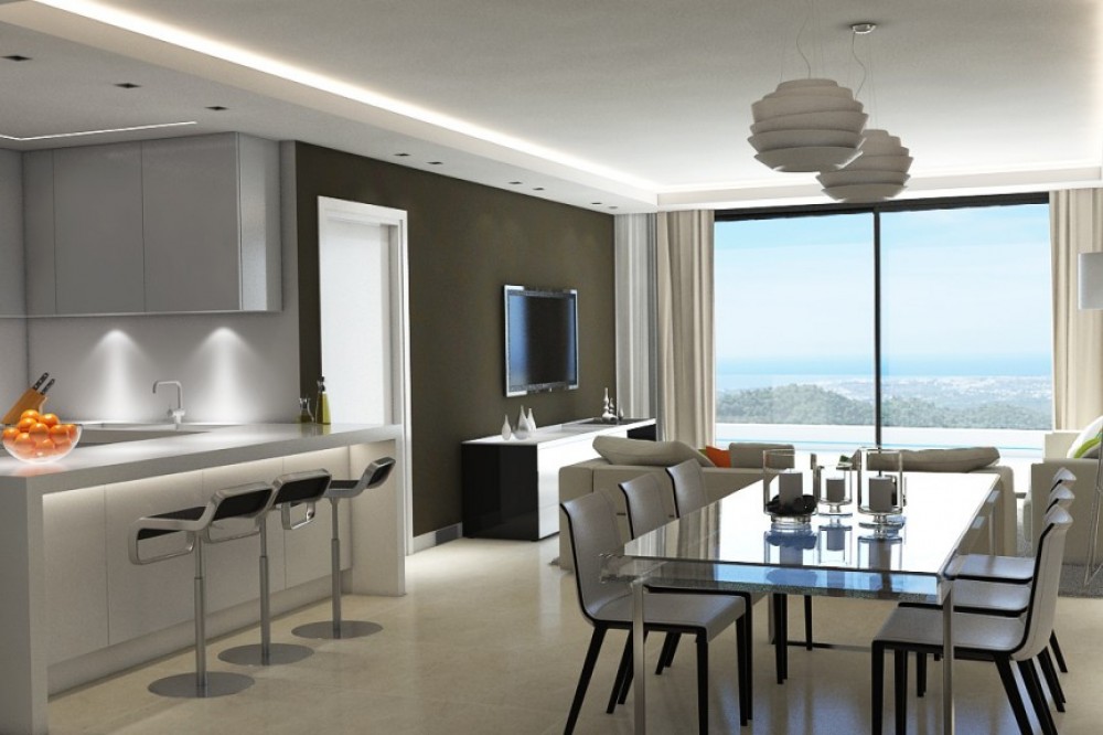 - 2 bedrooms / 2 bathrooms from 560.000€. 3 bedrooms / 2 bathrooms from 595.000€ 3 bedrooms penthouses 760.000€. Contemporary modern development built to latest specifications set in the exclusive golf valley of Nueva Andalucia. Located within minutes drive to the famous Puerto Banus and Marbella town. This ultra modern development will be ready by the end of 2017! High quality ceramic tiles throughout all the apartment, under floor heating in bathrooms, A/C with independent control in each room, fully fitted kitchen with Neff appliances, home automation system, wardroves, electrical shutters, security glasses,parking space and storage room included. 1 outdoor pool + spa with sauna, gym, turkish bath, Jaccuzzi.
