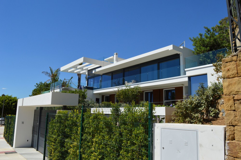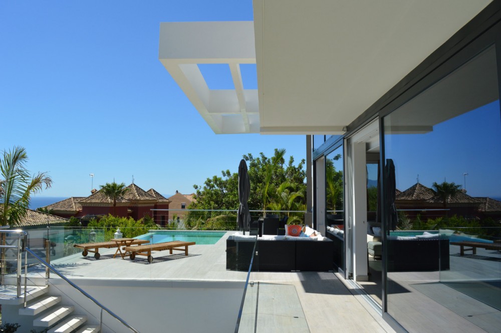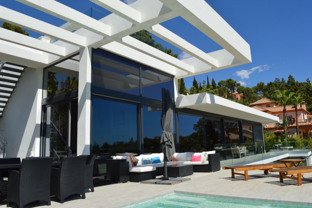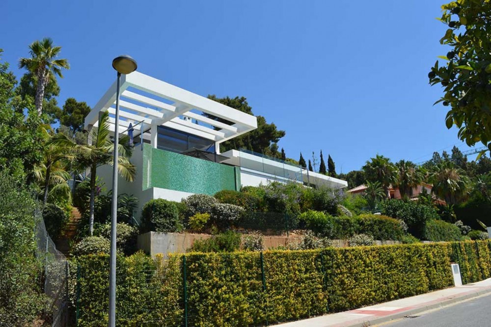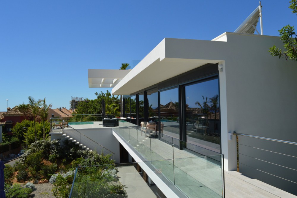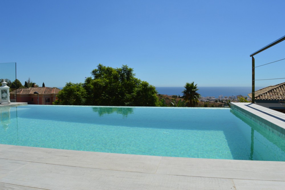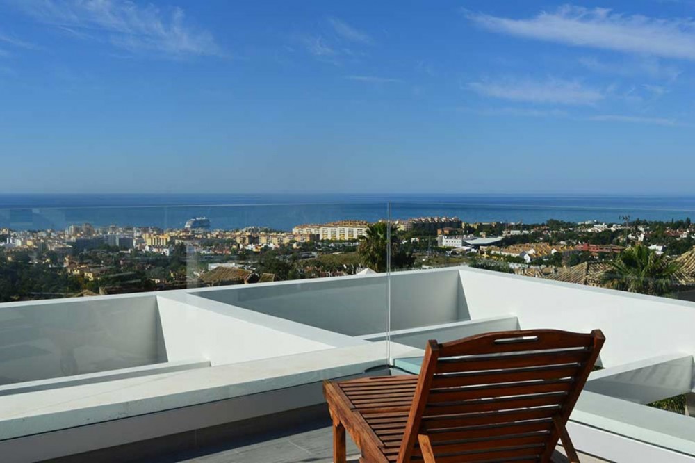 - Unique, south facing villa with panoramic sea views . Situated in a very peaceful and green hills of Marbella town .It is a perfect location for all year around living ,walking distance to a few well known restorants , shops , small hotel and mountain river ! Unique, modern style architecture with top-end finishes throughout.Plenty of private areas for entertainment and relaxation in- and outdoors. A living area can be tranformed by mooving big sliding panoramique windows and can connects with the outdoor covered and open terraces. Fireplace in living room. Generous and stylish open plan designer kitchen. Nice master suite with a southfaced terrace and a big dressing area with a natural light. 3 additional bedrooms with a shower area.Garage and storage . Cascade infinity pool with a BBQ area .Beautiful cousy garden withdifferent trees and herbs . Daikin heat pump for hot and cold air condishioning with Altherma system. Under floor water heating . Hot water system using heat pump with recovery capacity,Home automation for ligthting control, shutter control, climate and alarm controll .Pre-installed structure for a lift . Italian oak wood flooring .Wi Fi .Garden , swimming pool , stairs , and terrece with LED spotlights .plot size 970 m2build size 390 Detached Villa, Marbella, Costa del Sol. 5 Bedrooms, 3 Bathrooms, Built 340 m², Terrace 50 m², Garden/Plot 970 m². Setting : Town, Mountain Pueblo, Close To Golf, Close To Port, Close To Shops, Close To Sea, Close To Town, Close To Schools. Orientation : South East, South, South West. Condition : Excellent, New Construction. Pool : Private. Climate Control : Air Conditioning, Hot A/C, Cold A/C, Fireplace. Views : Sea, Mountain, Country. Features : Covered Terrace, Fitted Wardrobes, Near Transport, Private Terrace, Solarium, Satellite TV, ADSL / WIFI, Gym, Storage Room, Utility Room, Ensuite Bathroom, Marble Flooring, Barbeque, Double Glazing, Domotics, Restaurant On Site, Near Mosque. Furniture : Part Furnished. Kitchen : Fully Fitted. Garden : Private. Security : Electric Blinds, Entry Phone, Alarm System, Safe. Parking : Garage, Covered, Street, More Than One, Private. Utilities : Electricity, Drinkable Water, Telephone. Category : Luxury, Contemporary.
