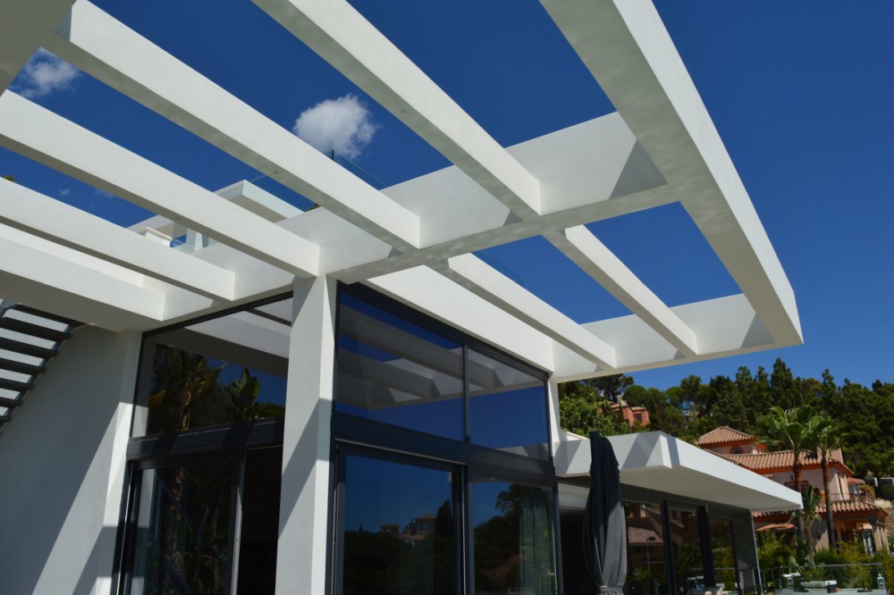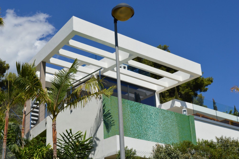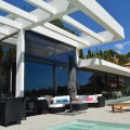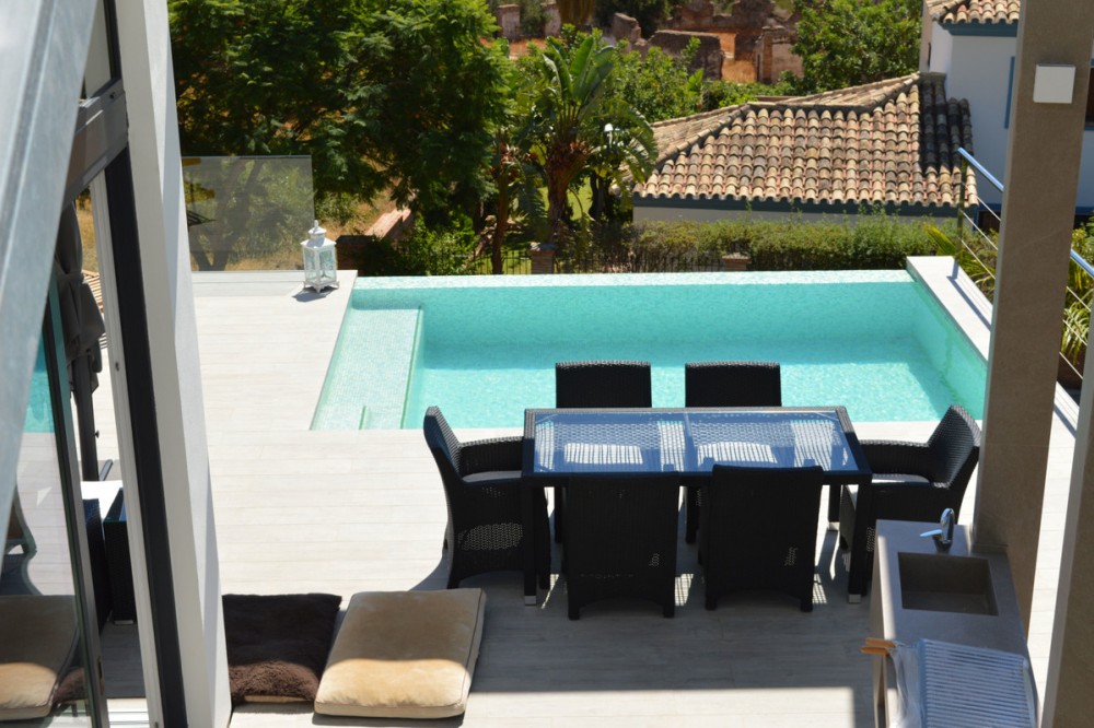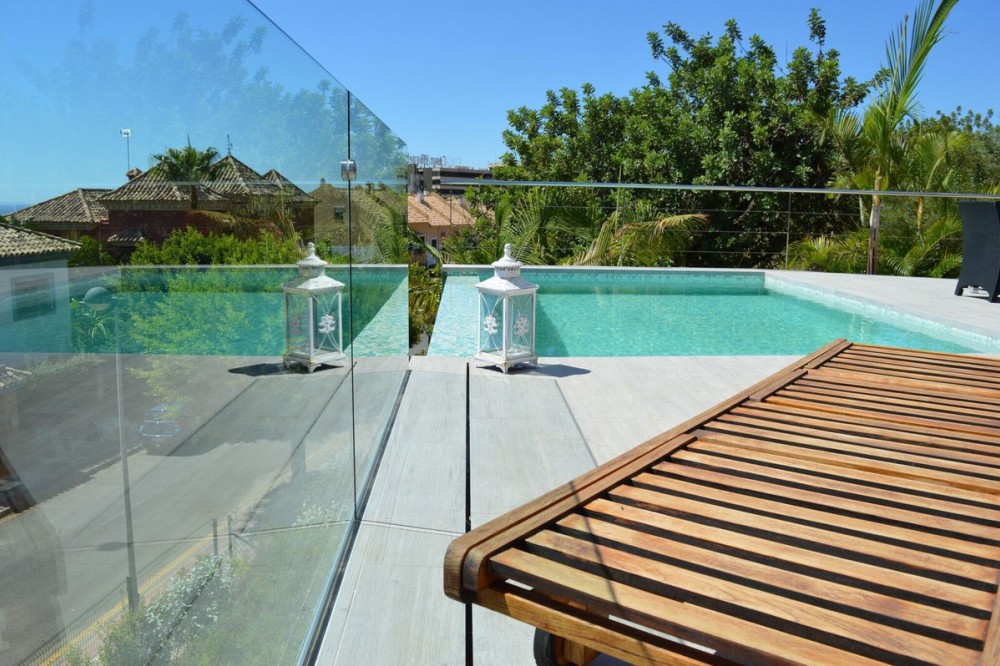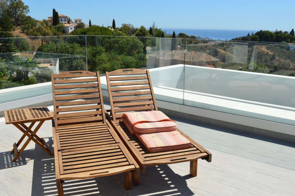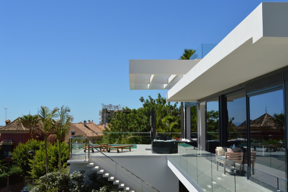 - Unique, south facing villa with panoramic sea views . Situated in a very peaceful and green hills of Marbella town .It is a perfect location for all year around living ,walking distance to a few well known restorants , shops , small hotel and mountain river ! Unique, modern style architecture with top-end finishes throughout.Plenty of private areas for entertainment and relaxation in- and outdoors. A living area can be tranformed by mooving big sliding panoramique windows and can connects with the outdoor covered and open terraces. Fireplace in living room. Generous and stylish open plan designer kitchen. Nice master suite with a southfaced terrace and a big dressing area with a natural light. 3 additional bedrooms with a shower area.Garage and storage . Cascade infinity pool with a BBQ area .Beautiful cousy garden withdifferent trees and herbs . Daikin heat pump for hot and cold air condishioning with Altherma system. Under floor water heating . Hot water system using heat pump with recovery capacity,Home automation for ligthting control, shutter control, climate and alarm controll .Pre-installed structure for a lift . Italian oak wood flooring .Wi Fi .Garden , swimming pool , stairs , and terrece with LED spotlights .plot size 970 m2build size 390 Detached Villa, Marbella, Costa del Sol. 5 Bedrooms, 3 Bathrooms, Built 340 m², Terrace 50 m², Garden/Plot 970 m². Setting : Town, Mountain Pueblo, Close To Golf, Close To Port, Close To Shops, Close To Sea, Close To Town, Close To Schools. Orientation : South East, South, South West. Condition : Excellent, New Construction. Pool : Private. Climate Control : Air Conditioning, Hot A/C, Cold A/C, Fireplace. Views : Sea, Mountain, Country. Features : Covered Terrace, Fitted Wardrobes, Near Transport, Private Terrace, Solarium, Satellite TV, ADSL / WIFI, Gym, Storage Room, Utility Room, Ensuite Bathroom, Marble Flooring, Barbeque, Double Glazing, Domotics, Restaurant On Site, Near Mosque. Furniture : Part Furnished. Kitchen : Fully Fitted. Garden : Private. Security : Electric Blinds, Entry Phone, Alarm System, Safe. Parking : Garage, Covered, Street, More Than One, Private. Utilities : Electricity, Drinkable Water, Telephone. Category : Luxury, Contemporary.