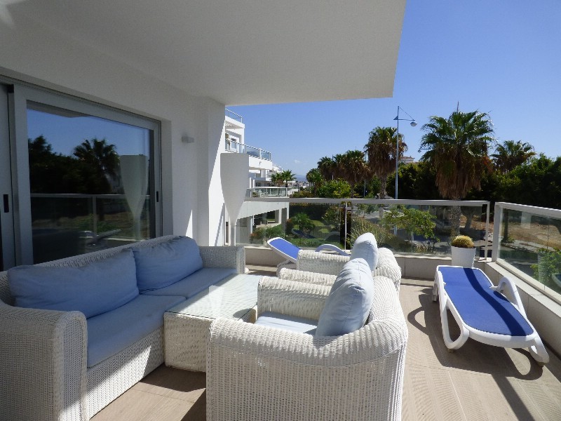 - Apartment for sale in Jade Beach, San Pedro de Alcantara. This south facing, first floor apartment is located less then 400 meters from San Pedro beach and its promenade leading to Puerto Banus and Marbella. An excellent location, only 5 minutes'' drive to Puerto Banus and less than 10 minutes to the centre of Marbella. It is a rare opportunity to find a property within walking distance to all kind of facilities, as the beach, international schools, San Pedro town centre with nice Spanish restaurants, shops, boutiques and of course the new Boulevard that offers amusements throughout the year. The apartment has been built to a high standard using quality materials and modern design. It comprises of 3 spacious double bedrooms and 2 bathrooms (one en-suite). The open plan kitchen and living area leads directly to an extensive terrace with a dining area and plenty of room for a sofa area and separate sunbathing area. The kitchen is fully fitted with breakfast bar and separate laundry room. Features are under floor heating in bathrooms, air conditioning, underground parking space, storage room and communal swimming pool.Possibility of enclosing the terrace with glass curtains gaining extra living area for the winter, but still have an open terrace in the summer or whenever one wishes..2 underground parking spaces plus 1 big storeroom included in the price. Furniture not included!!