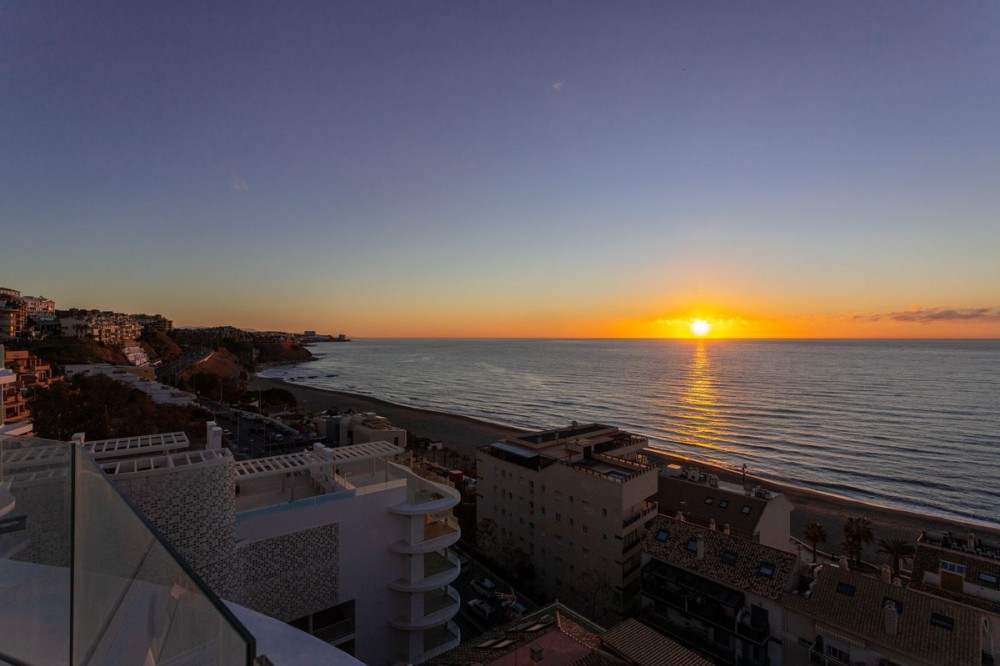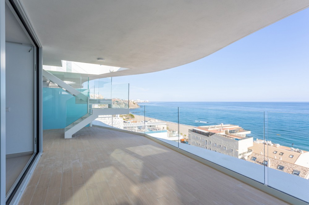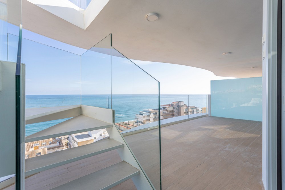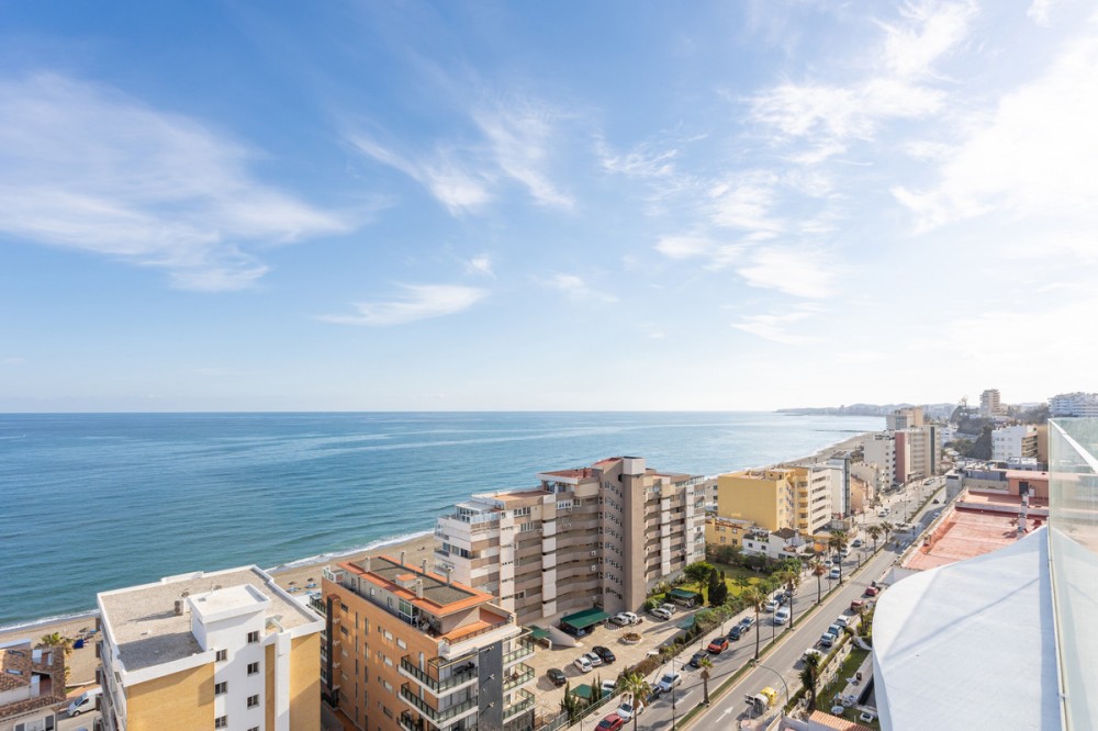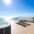 - Would you like to live just few steps from the beach, feel the waves at your terrace and enjoy your own roof top solarium, look over the rooftops and feel the sea breeze? This exclusive penthouse apartment is located in one of the finest new builds called “The Wave Collection”. It's only 25m from the sea side promenade, enjoying spectacular sea views of the Mediterranean sea and conveniently located between Fuengirola and Benalmadena in the most prestigious residential areas in the region. A top luxury property to enjoy all year round in an excellent location close to everything. The property has a big open living room and kitchen looking directly towards the sea. There are two bedrooms. The master bedroom has an ensuite bathroom, but there is also a second guest bathroom. You can access the big terrace with an astonishing sea view both from the living room and from your master bedroom. Stylish glass staircase takes you to the rooftop terrace where you find a massive area with room for endless possibilities for your outdoor life under the sun. The rooftop has a jacuzzi and an amazing outdoor kitchen and loads of space for a luxury chill out area. The area is partly covered by a big pergola, and one could glass that area in order to created a covered chill out space. Only high quality building materials have been used in this development. For your convenience, there is an underfloor heating in the bathrooms and fibre optics internet cable connection. It’s an ideal place to work distantly and enjoy outdoor life. This home also enjoys a home automation and energy efficiency management system installed with the following features: Intercom, floding detector with automatic water stop, smoke detector, notice of electronic supply cut, heating and aircon cut. The community consists of only 72 high-end properties and there is an amazing pool area, luxury lobby and a private business area for residents. The Wave beach club is just next to the property and has a heated swimming pool where you can swim all year round. You can find paddle, tennis, spa and gym at the Hilton Hotel Resort. There are plenty of restaurants nearby and you can enjoy both Benalmadena and Fuengirola beach promenades. The property comes with two underground garage spaces. It also includes a storage room. The location is excellent next to the beach. You can also find the Carvajal train station some 100m away, where you have the electric train taking you conveniently to the airport or the buzzing Malaga City.