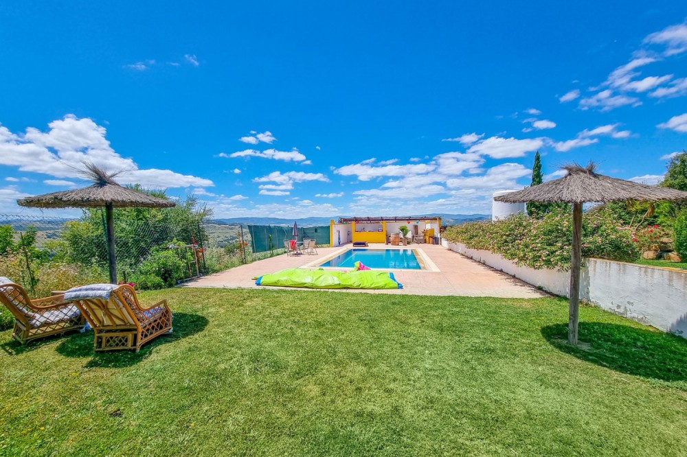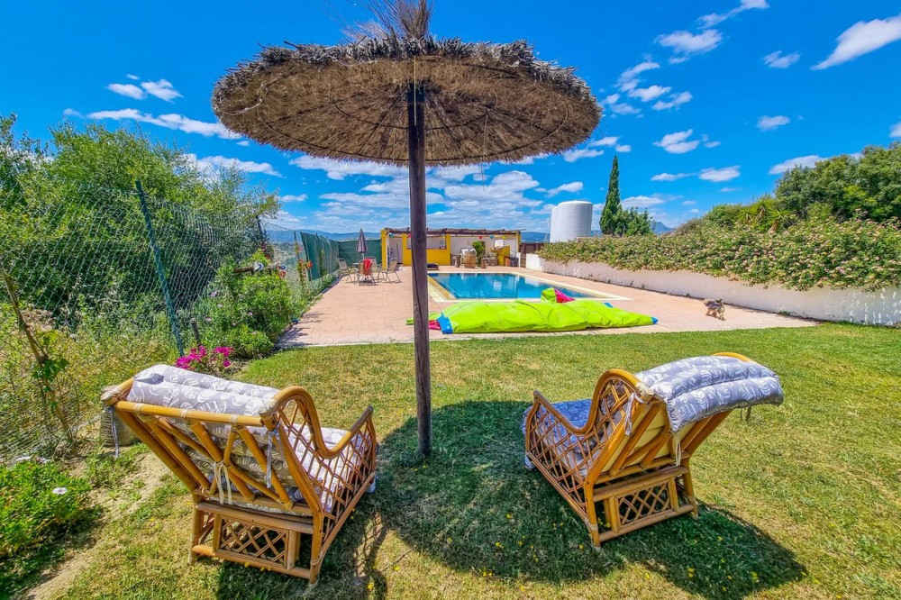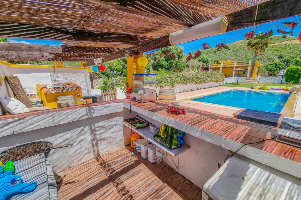 - Lovely 3-bed finca with private pool and a very large plot with fruit trees in Casares. The finca is a single-story house with plenty of space both indoors and outdoors. The living room is traditional in style and has a fireplace. The kitchen is independent and fully fitted with appliances and wood countertops. There are 3-bedrooms, one of them en-suite, where they are currently building a huge master bathroom with double sink, bathtub and shower. There are another 2-bedrooms and a full family bathroom. The outdoor space of this finca is stunning: large pool and garden areas, even has sunshades installed! there is also a barbeque and lounge area, the perfect spot for entertaining family or friends while enjoying the fantastic mountain views and the privacy and tranquility of living in the countryside. There is also a covered terrace area with sofas setting at the back of the property, many relaxing areas to choose from! The property is gated, it is sold fully furnished and includes a 2-car garage and storage. This finca includes all the finishes needed: hot/cold AC system, terracotta tiles, video surveillance system and both electrical and solar power. The field surrounding the finca is an avocado field with over 500 trees. Truly a gem for nature lovers!