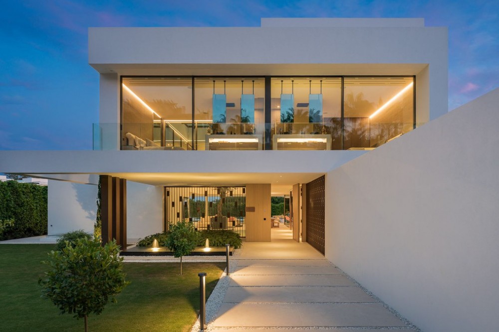 - Opportunity to acquire a magnificent modern Villa on the plot with the sea views. Located of the Golden Mile just 300 meters from the best beaches in Marbella. Villa was build in 2023, fully furnished. Modern 4 floors Villa welcomes you into an exquisite entrance. Main floor: Living area with an open plan fully fitted kitchen and equipped with top of the line appliances, leading towards the chic dining area, one guest bedroom and bathroom. The first floor includes the large master suite, a sublime walk-in closet and large terrace with the fantastic sea views over Puerto Banus, office-sitting area and two spacious bedrooms in-suite. The iconic roof top terrace has been totally prepared to be equipped with all luxury features, there is a dining zone with BBQ and the infinity swimming pool with sea views. An impressive basement level includes plenty of entertaining features, bar with open plan fireplace, cinema room, guest bedroom, garage for more than 6 cars. The Golden Mile, one of the most luxurious residential areas in Marbella, lies into the edge of the centre of Marbella to the west to Puerto Banus. The best word to describe the Golden Mile is luxury, here you will find the best hotels in Marbella like Puente Romano and Marbella Club, some of the resort’s most expensive properties, nicest seafront promenade and exclusive restaurants and shops.