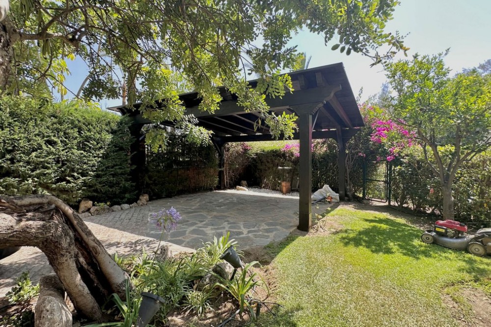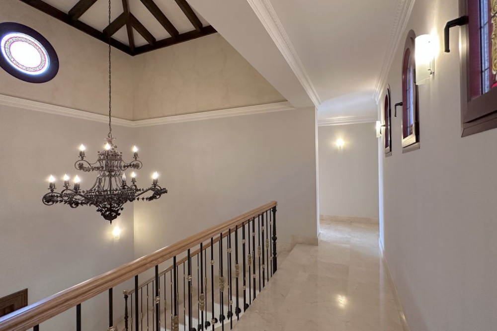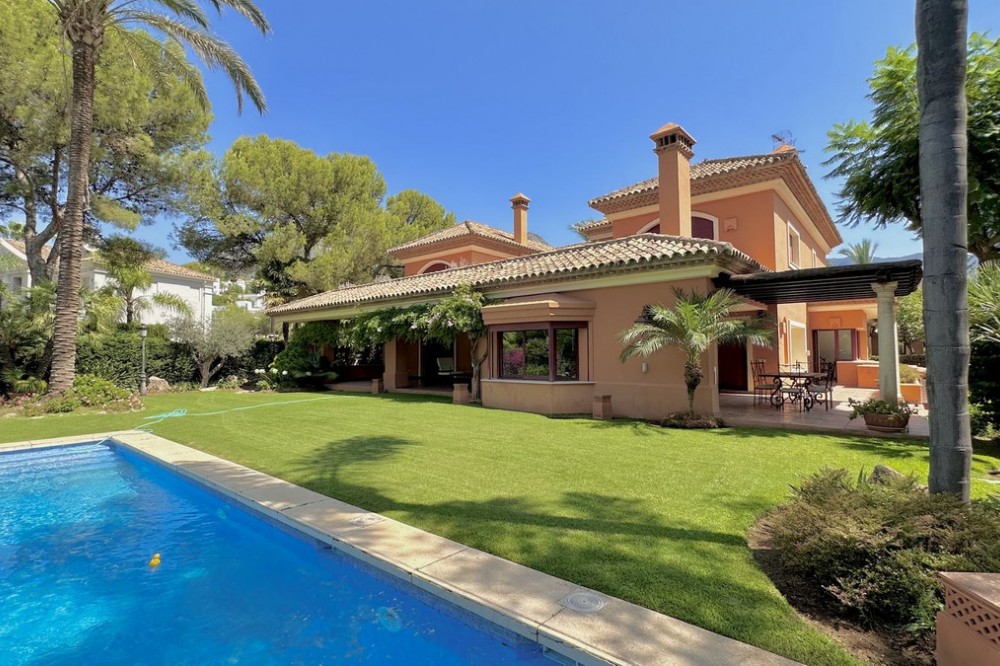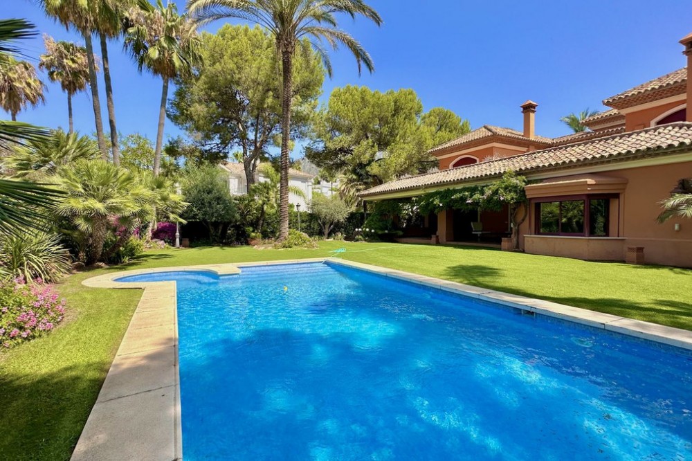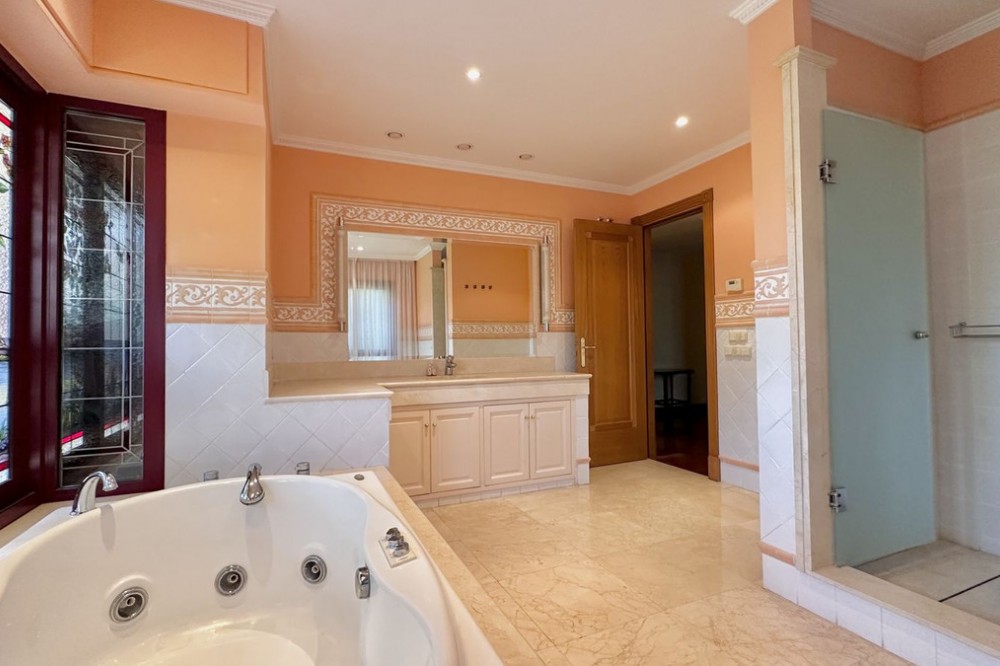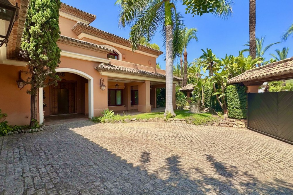 - This villa is located in the prestigious and secure community of Golden Mile Marbella. with 24h security, manicured gardens, paddle courts and children’s play area, within short distance to all aminities of Marbella and the beach. Very private property settled on a flat plot of almost 1500m2 with madure garden and good size swimming pool. The house offers comfotable entrance that leads to the covered garage for 2 cars plas carpor for another two. The villa is distribuited on 3 levels, on the ground floor there are, a spacious living room with the access to the cover large terrace and a garden that also leads to TV room, a guest toilet, a kitchen with utility room and pantry, a goos size master bedroom en suite. The upper floor consists of 4 bedrooms, 3 with their bathrooms, 2 bedrooms are with the access to the terrace. The Basement offers a living room with the cellar, another additional space to that could be addapted to personal tast, a toilet, billard room , a storage room, there is an access to the garden and BBQ area.