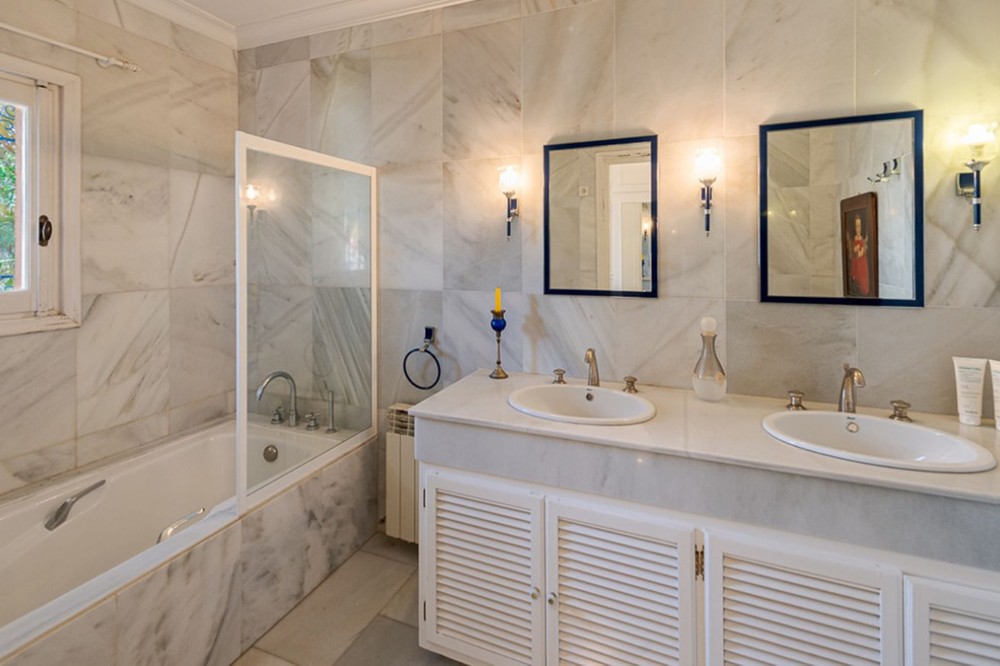 - Villa for sale in El Paraiso - Baronal 100 meters from the beach, The New Golden Mile, Estepona in a very quiet neighborhood. Villa in Andalusian style on a plot of 1,500 square meters with a pool of 11 by 6 meters. The villa consists of an entrance hall, spacious living room with fireplace, kitchen, four bedrooms each with a bathroom, as well as additional rooms. The villa should be remodeled according to your wishes, it is also allowed to add a floor. Ideally located between San Pedro de Alcantara and Estepona, two minutes from Salduna beach.