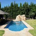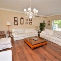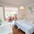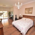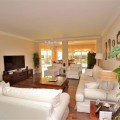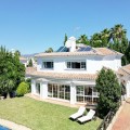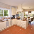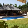 - A very special south facing family home in one of the most prestigious areas of Mijas Golf. Designed for comfortable family living it boasts a large lawned area with thatched exterior pergola with lounge, bar and BBQ beside a designer pool with waterfall, plus a back garden furnished with a chill out and children outdoor games area. The ground floor comprises of an entrance hallway leading to very spacious lounge with open plan kitchen and separate dining area and 2 bedrooms, one on suite, an aditional guest toilet and a utility room. The first floor offers two very spacious bedrooms with ensuite bathrooms and extensive built in wardrobes. The property has electric gates and parking for 2/3 cars, centralised air condition hot and cold, double glazing, solar panels, alarm system and drip irrigation.