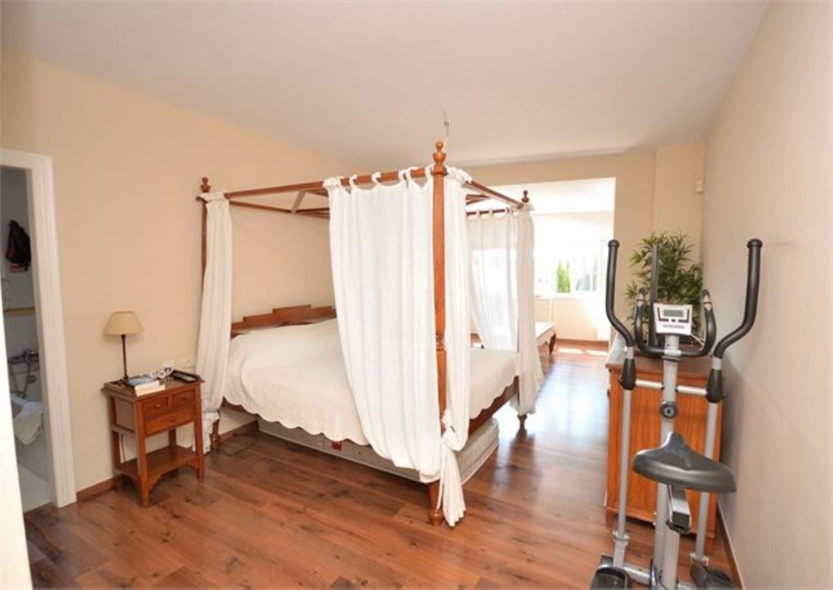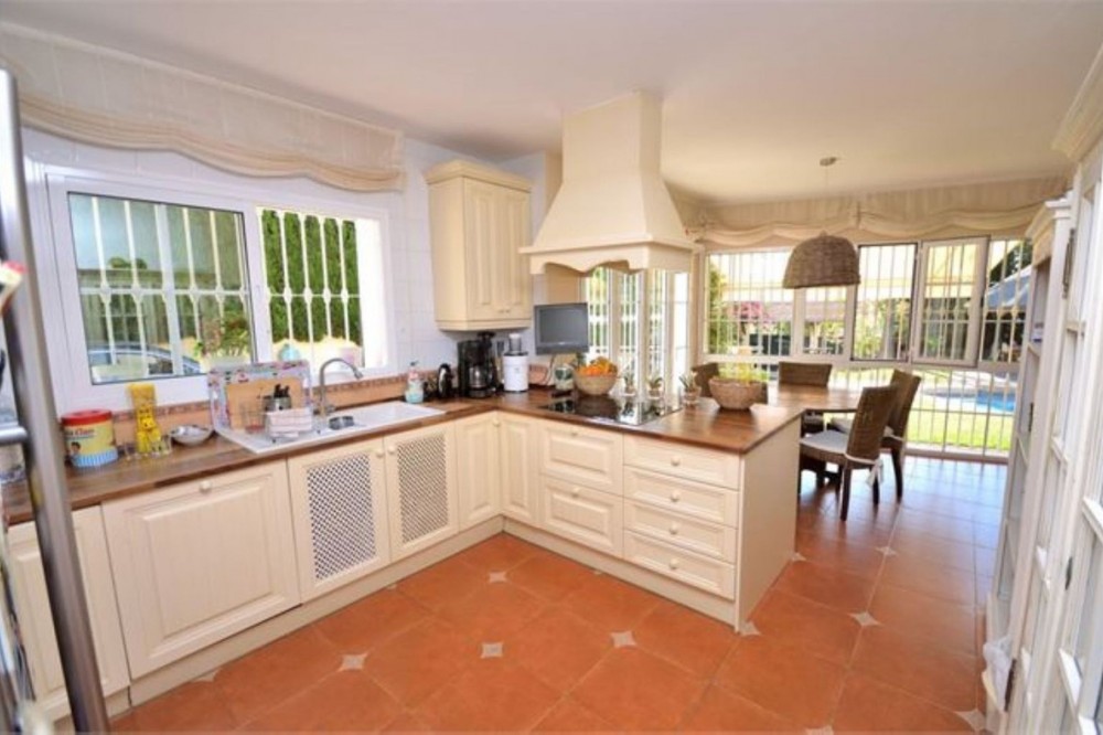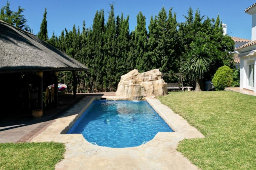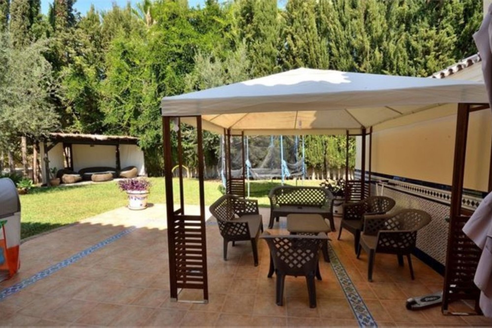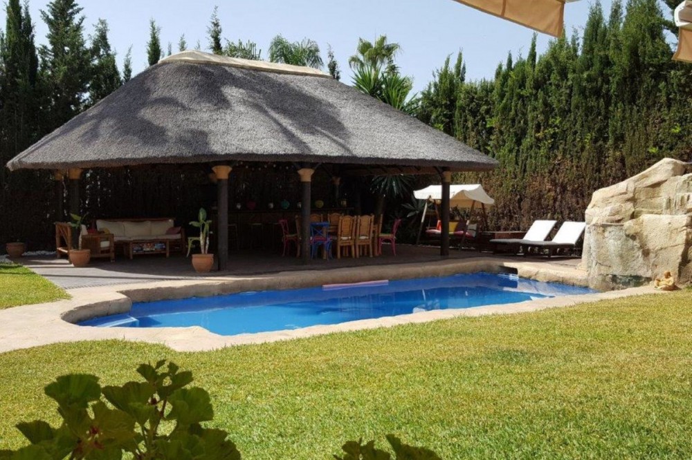 - A very special south facing family home in one of the most prestigious areas of Mijas Golf. Designed for comfortable family living it boasts a large lawned area with thatched exterior pergola with lounge, bar and BBQ beside a designer pool with waterfall, plus a back garden furnished with a chill out and children outdoor games area. The ground floor comprises of an entrance hallway leading to very spacious lounge with open plan kitchen and separate dining area and 2 bedrooms, one on suite, an aditional guest toilet and a utility room. The first floor offers two very spacious bedrooms with ensuite bathrooms and extensive built in wardrobes. The property has electric gates and parking for 2/3 cars, centralised air condition hot and cold, double glazing, solar panels, alarm system and drip irrigation.