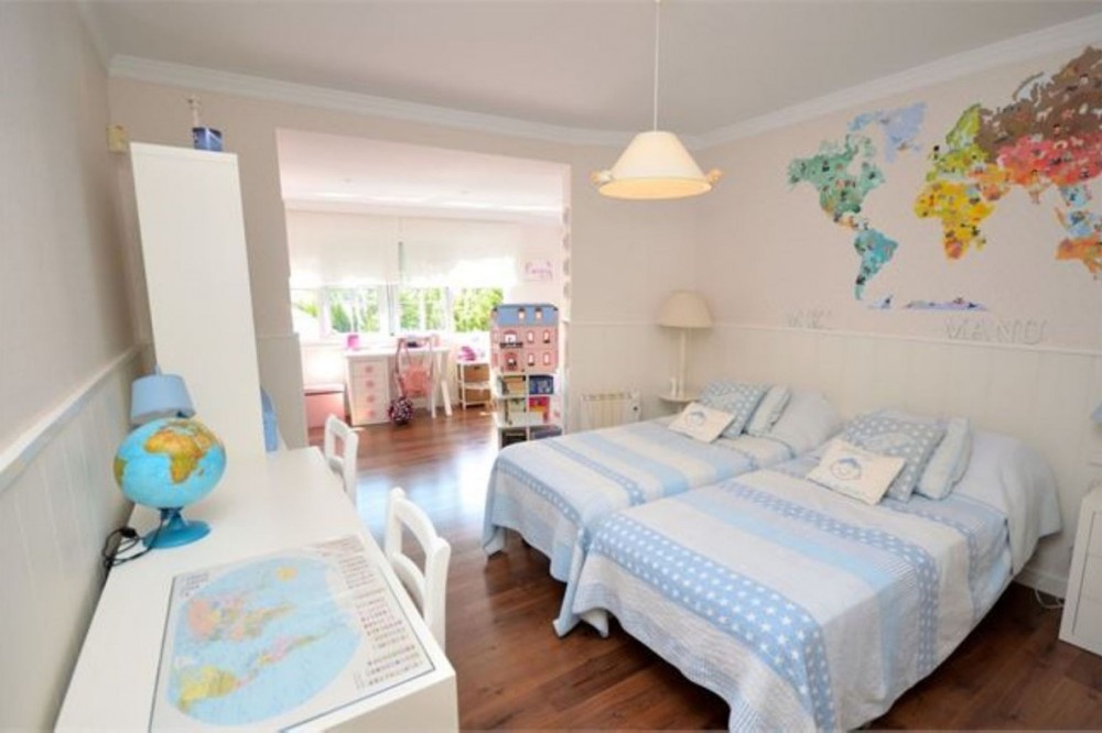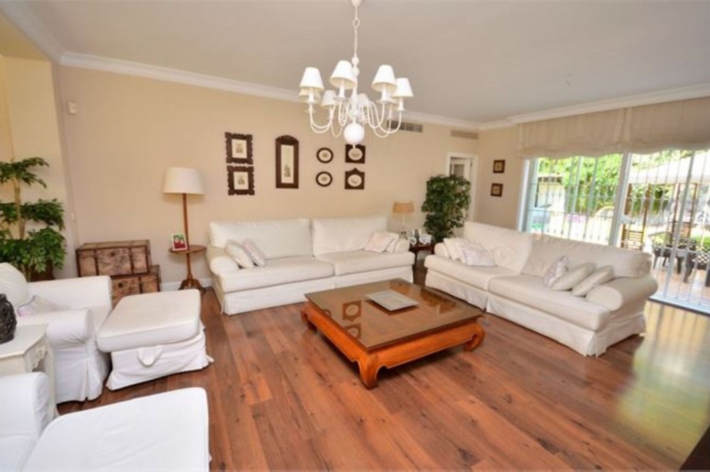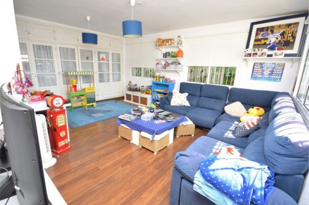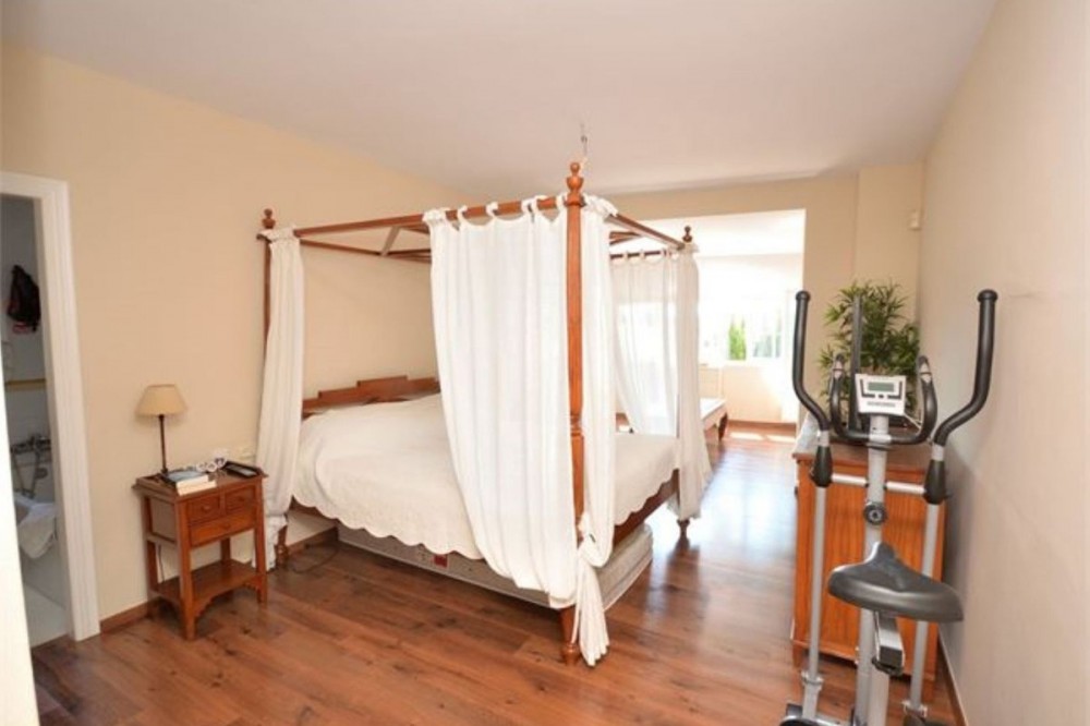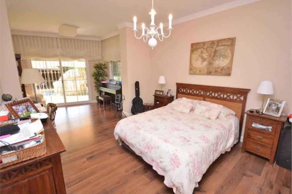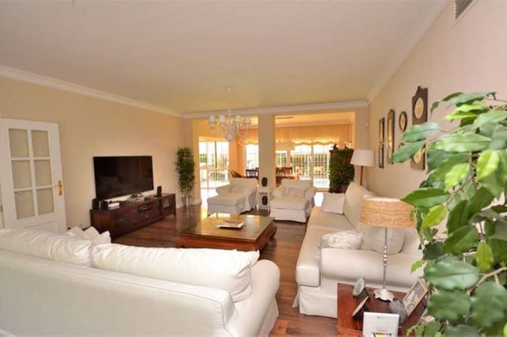 - A very special south facing family home in one of the most prestigious areas of Mijas Golf. Designed for comfortable family living it boasts a large lawned area with thatched exterior pergola with lounge, bar and BBQ beside a designer pool with waterfall, plus a back garden furnished with a chill out and children outdoor games area. The ground floor comprises of an entrance hallway leading to very spacious lounge with open plan kitchen and separate dining area and 2 bedrooms, one on suite, an aditional guest toilet and a utility room. The first floor offers two very spacious bedrooms with ensuite bathrooms and extensive built in wardrobes. The property has electric gates and parking for 2/3 cars, centralised air condition hot and cold, double glazing, solar panels, alarm system and drip irrigation.
