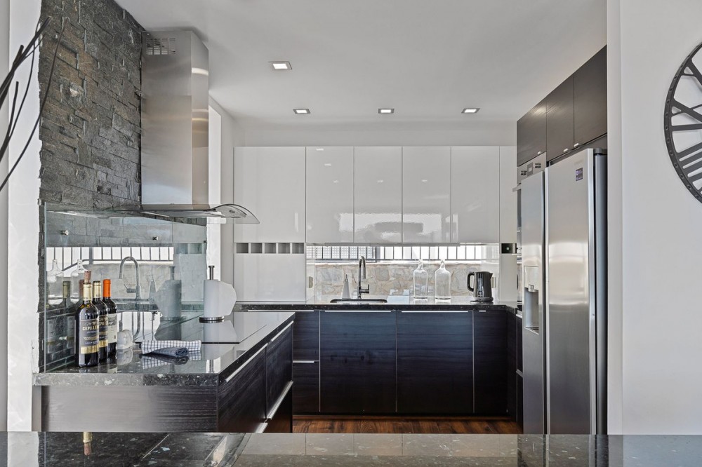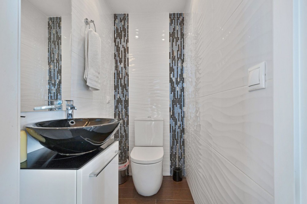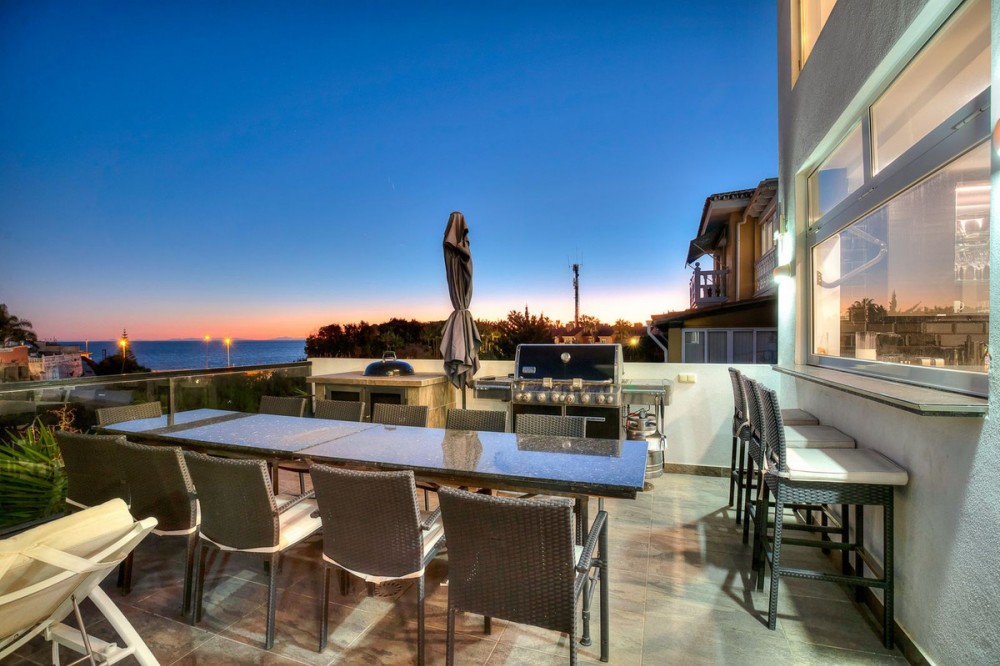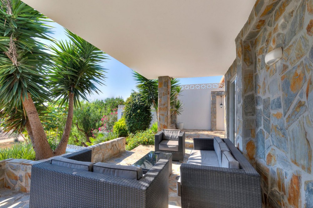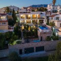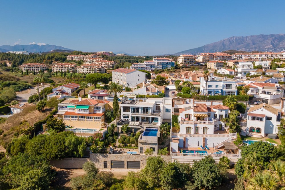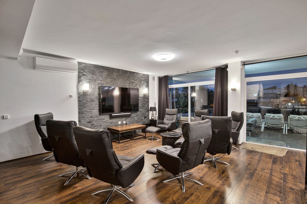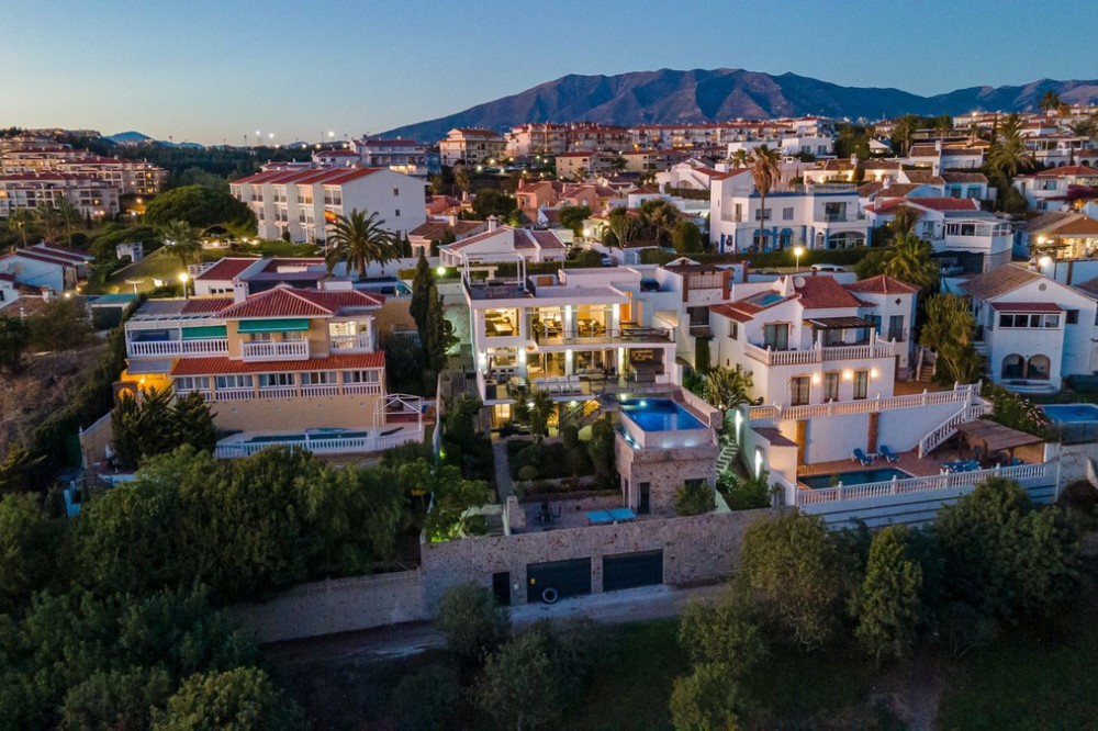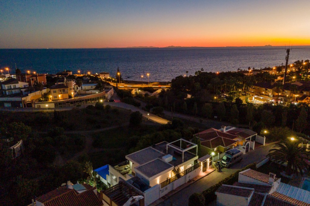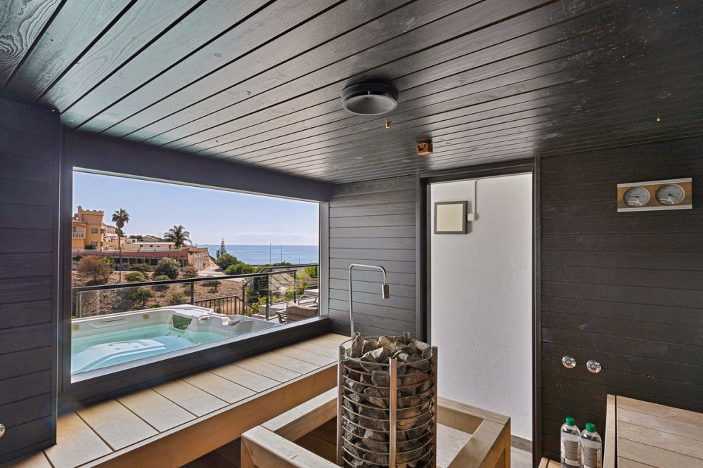- Welcome to Villa Perla in El Faro this unique villa offers everything you could wish for in modern luxury living. The villa has been expanded and completely renovated during the years 2016-2018. The technical and constructional characteristics of the house are unparalleled in Spain. All rooms have insulated floors and stylish laminate, wet rooms have tile and underfloor heating, and the outer walls have insulation and double masonry, which ensures excellent energy efficiency. All windows and doors have thermal glass and anti-theft glass The house has an efficient mechanical ventilation system built by a Finnish company with inlet and outlet air with heat recovery. Three separate ventilation machines distribute air to a residential building, a gym and a garage. In addition, the house is connected to the natural gas network, so the domestic water and the swimming pool are heated inexpensively. In the upstairs living room, you can enjoy beautiful evenings by the gas fireplace connected to the gas network. Each room has its own separate air heat pump for cooling and heating. In addition, the living room has electric sun blinds on the inside of the window panes. Villa Perla also offers good opportunities for relaxation in the swimming pool and hot tub on the pool floor with salt water. The swimming pool also has a countercurrent device. The sauna has Helo sauna automation and a timed digital heater. The kitchen/bar on the pool floor has a bar window that opens up electrically in the direction of the terrace. The security of the house is top class thanks to electronic locking, burglar alarm equipment and camera surveillance. The lift doors in the garage and on the upper level are practical and easy to use. The apartment house has space and comfort for the whole family; 6 bedrooms, 6 bathrooms, 3 wc, 2 kitchens, 2 living rooms, utility room, storage room for linen and lockers, study with access through a secret door and a gym with air conditioning and mechanical supply/exhaust air. The sauna has two outdoor showers and a toilet. The garage can accommodate two cars and three motorcycles. The exit next to the garage leads to El Faro beach, which is less than 200 meters away, with restaurants. The property is sold with movables; two fully equipped kitchens, dining tables, living room furniture, TV chairs, bar furniture, sun loungers, outdoor furniture and all rooms have double beds (14 beds in total) and a sofa bed. In addition, the store includes two large TVs, gym equipment. Contact us, we will be happy to present this great property.