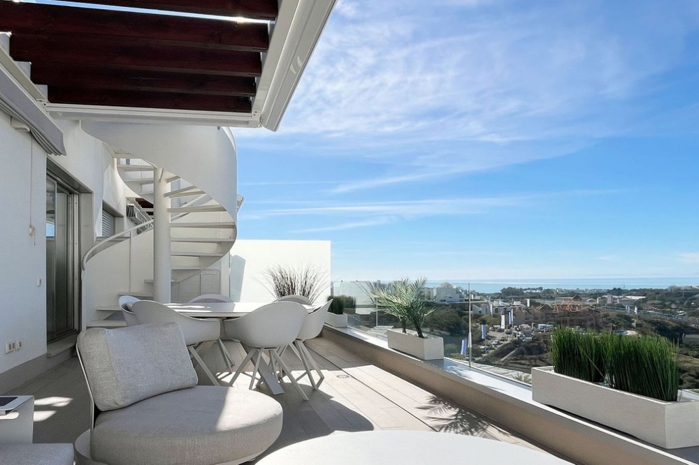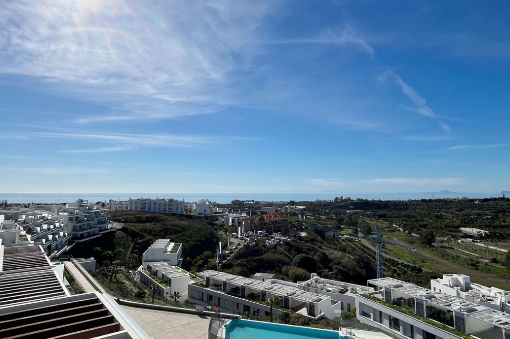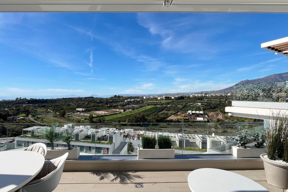 - *This property has an active tourist licence and the community allows short term rentals.* Welcome to this inviting penthouse in Oceana Views. As you walk through the hallway, you'll find two comfortable bedrooms on your right, each with its own en-suite bathroom, offering privacy and convenience. The penthouse features a modern open-plan kitchen that flows effortlessly into a welcoming living area, making it a great space for both relaxing and entertaining. Step out onto the terrace, and you're immediately greeted with impressive views of Gibraltar and Africa, a beautiful backdrop for any day. The first terrace is equipped with a dining table and a lounge area, ideal for meals outdoors or simply enjoying the fresh air. Up on the solarium, the views get even better, providing a perfect spot for hosting a barbecue with friends or enjoying a quiet sunset with a glass of wine. This space adds an extra layer of enjoyment to the penthouse, making it not just a place to live, but a place to truly enjoy life. The property includes an underground parking space and a store room. Residents have access to the clubhouse across the road offering a gym, spa and restaurant.