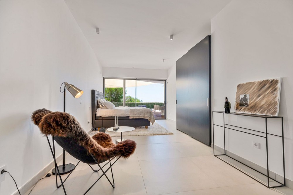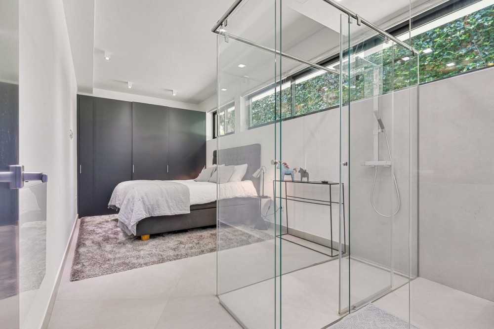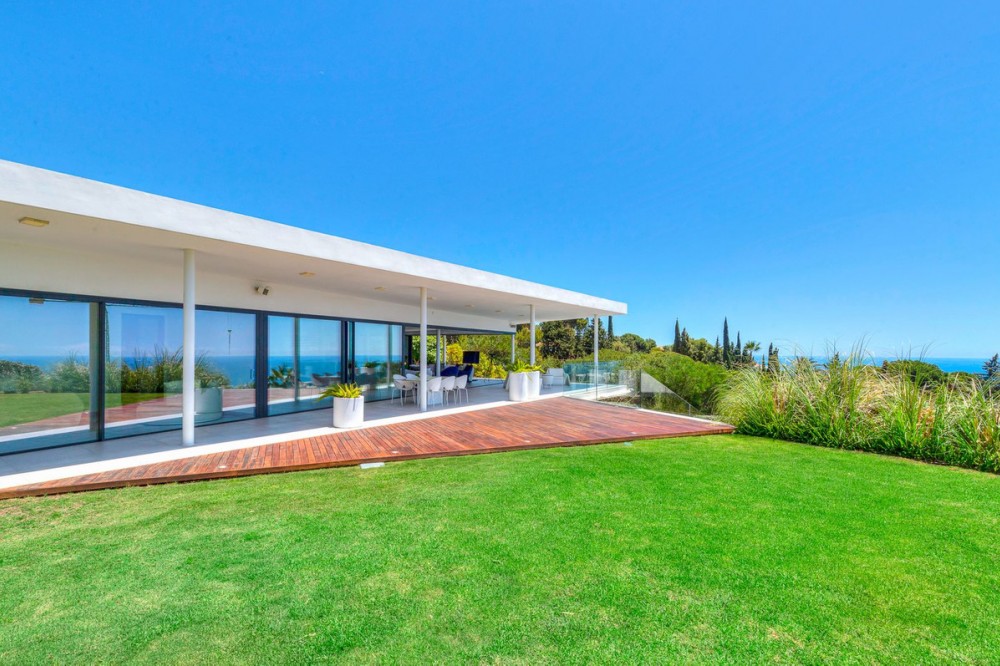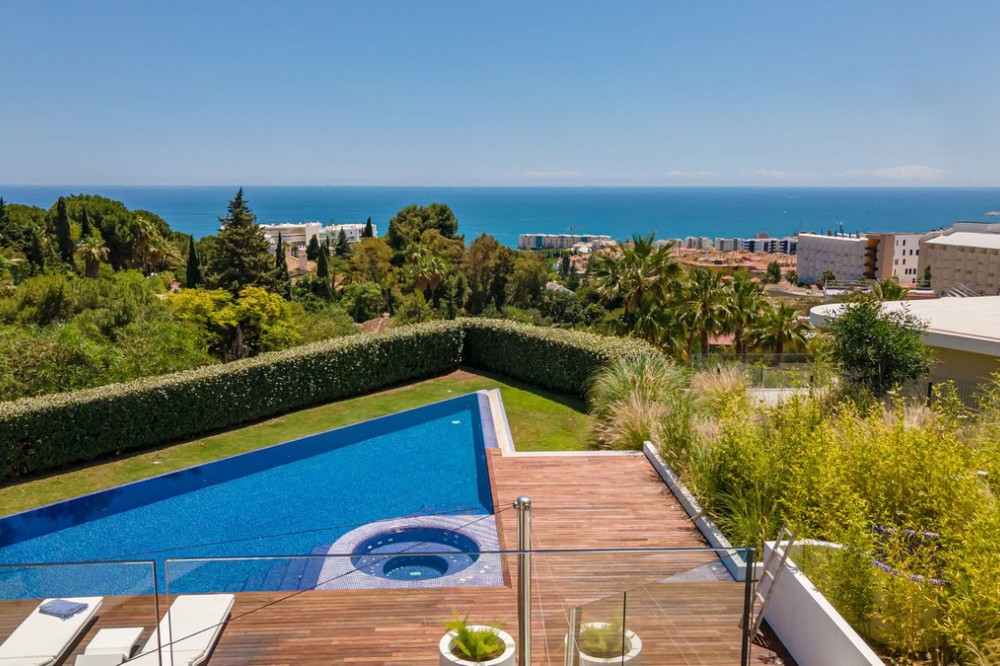 - Contemporary designer villa with breathtaking views towards the sea. The villa comprises of two floors with main entrance on the upper level. From the moment you step through the front door, you are struck by the fantastic view thanks to the floor-to-ceiling glass doors along the whole front side of the house. The upper floor is characterized by an open floor plan that houses a kitchen island, integrated kitchen cabinets, dining area and sofa group. In the middle sits a glass wine cabinet. On this floor is also the master bedroom with bathroom en-suite and private dressing room. Outside the large glass doors is a lovely covered terrace that leads out to a wooden deck and lawn. From the wooden deck, a three-meter-wide staircase leads down to the 67 m2 pool with Jacuzzi. The villa's two floors are connected by the specially designed staircase, which is the jewel of the house. On the lower level there are four bedrooms, each with an en-suite bathroom with glass walls, a guest toilet, a TV-room with a small kitchen and a fireplace, a laundry room and a large double garage. Three of the four bedrooms and the TV-room have access to the wooden deck next to the pool where, in addition to space for sun loungers and a dining table, there is an outdoor kitchen, barbecue and toilet, all protected by roll-up canvas roofs. The villa is equipped with air conditioning, under floor heating, alarms, security cameras, home automation, etc. The villa is located on one of the best plots in the exclusive Reserva del Higueron urbanization on the border between Fuengirola and Benalmadena only 15 minutes from Malaga International Airport. In the area there is the 5-star Hotel Hilton, sports club with gym, spa, padel and tennis courts and a Michelin restaurant.