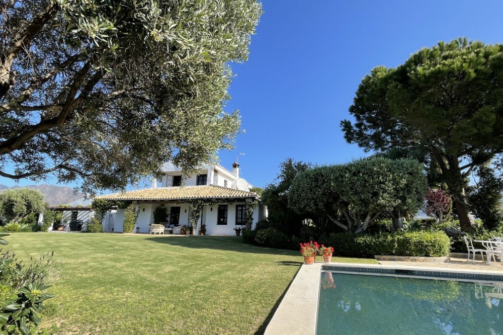 - Immerse yourself in the captivating charm of this refined utterly peaceful country home, affording absolute privacy and breathtaking panoramic views, which unfold before you as far as the sea and the Sierra de Ronda. The beach, several golf courses, riding stables and extensive shopping facilities are only a 10-minute drive away. Embrace the timeless elegance of this Cortijo style country house, evident in the spacious rooms bathed in natural light and filled with a sense of effortless sophistication. Gather loved ones around the crackling fireplace in the expansive classic ‘salon’ or prepare culinary masterpieces in the spacious kitchen with inside and outside dining areas perfect for intimate meals and grand celebrations. Host formal dinners in the dedicated gracious dining room, ensuring every occasion feels special. Retire to one of the luxurious en-suite bedrooms, offering a private sanctuary after a day of golf, swimming, tennis or horse riding. Need a dedicated space to work remotely? The separate office provides the perfect environment for focused productivity connected to the Internet via Starlink (satellite) with speeds above 30mbps. Alternatively, it could double up as a fifth bedroom. For friends and family that come to visit, the guest annex, complete with its own living room, spacious “Mama Mia” dining terrace, kitchen, two double bedrooms, and a bathroom plus shower, provides comfortable independent accommodation, which can be instantly incorporated as part of the main house. Step outside and discover your own personal oasis. Lush green lawns invite relaxation or even a round of croquet, while the sparkling swimming pool beckons refreshing dips under the warm Spanish sun. Covered outdoor dining areas provide the perfect setting for al fresco meals, allowing you to embrace the beauty of the surrounding landscape. Built on an expansive plot of 10.000m², which could cater for equestrian enthusiasts, offering endless possibilities for creating your own personal haven. This is more than just a house; it's a lifestyle. A chance to own a piece of paradise, experience the beauty of Spain, and create lasting memories with loved ones in a haven of comfort, sophistication, and endless possibilities.
