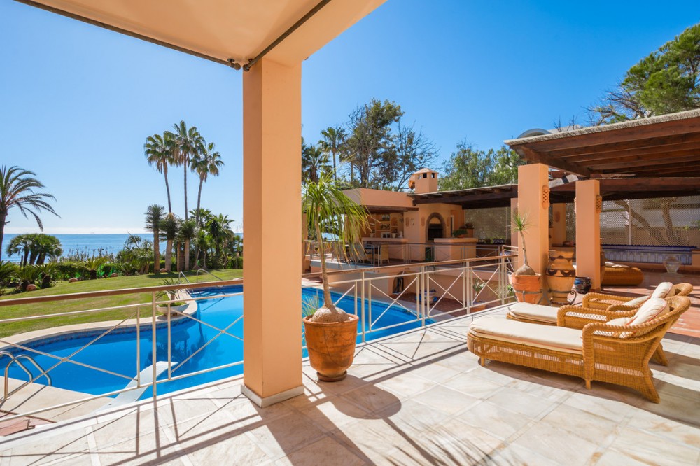 - Nestled on the beautiful New Golden Mile shoreline, this stunning beachfront villa offers luxury living at its best. With 8 bedrooms, 10 bathrooms, and a separate guest apartment, it's perfect for comfort and sophistication. Spread across three levels, the main house boasts a large kitchen for cooking enthusiasts and gatherings, a formal dining room, and multiple living areas including a TV room. Step outside to enjoy the covered terrace and outdoor bar area with breathtaking views. The outdoor space features a lovely swimming pool for relaxation and a spacious driveway with parking for two cars. With eight well-designed bedrooms, including two in the basement with their own living area and kitchenette, every detail ensures comfort and privacy. For those seeking coastal luxury living, this villa is a must-see.
