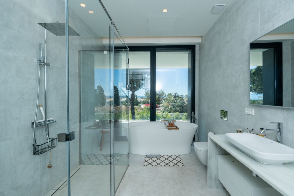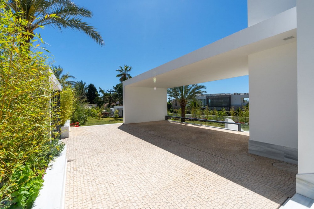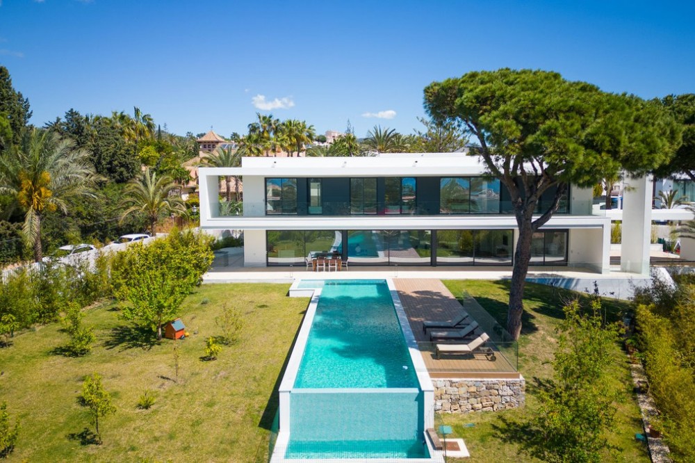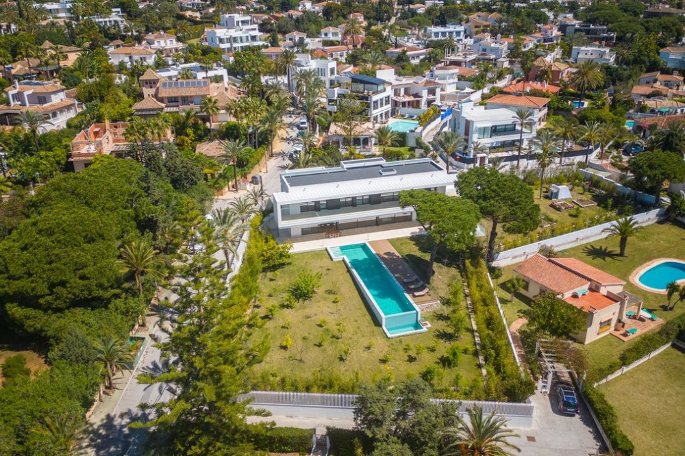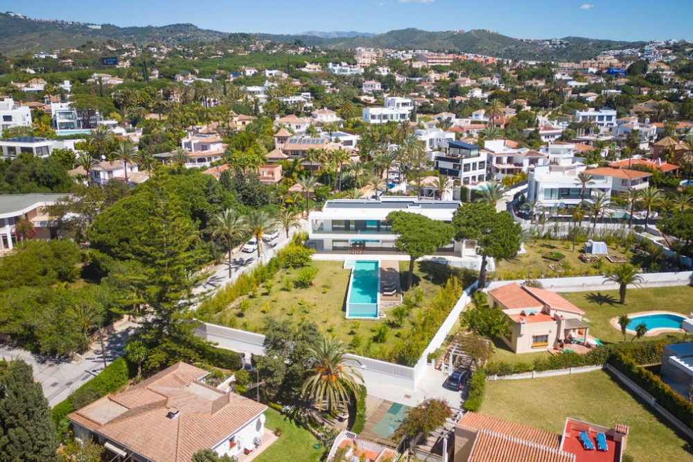 - Most luxurious and stylish newly built villa offering breathtaking sea views, situated in the trendy beach resort Marbesa, just a short walk from the beautiful white sandy beach. The villa was recently completed to the highest qualities and is offering a beautiful interior design throughout, furnished with the latest trends as well as built with top eco-friendly materials. Discover this amazing eco-friendly family villa in Marbesa, known for its beautiful beaches and convenient location near amenities and the protected natural wonder, the Dunes, and Cabopino harbor. Set on a spacious 2.500-square-meter plot with palm trees and tropical plants, this newly built, south-facing villa boasts underfloor heating in bathrooms. Almost every room offers fantastic sea views of the Mediterranean and the African coastline. The villa features an open-plan kitchen with top-of-the-line appliances, flowing into a spacious living room with sliding doors leading to a large covered terrace and BBQ area. On the first floor, you'll find 4 roomy en-suite bedrooms plus laundry area, while the lower level houses 1 more en-suite bedroom. This exceptional property adheres to the latest construction standards. Additional features: Skylight on first floor. Solar energy. Don't miss the chance to see this incredible modern villa. Schedule your viewing now and step into the world of luxury living! The charming and well-established neighbourhood of Marbesa offers a tranquil location close to extensive sandy beaches just eight kilometres from Marbella town centre. With some excellent beach restaurants nearby, as well as easy access to the many shops, medical facilities, international schools and first-class golf courses to be found east of Marbella, it is an ideal location for people looking for a relaxed lifestyle. lower level; 242 m2 ground floor; 209 m2 first floor; 189 m2 covered terrace; 87 open terrace; 42 covered parking; 57 Built on the beachside of the main A7 coast road, wherever you are in Marbesa is just a short walk through the quiet leafy streets to the sandy seashore with its magnificent views across the Mediterranean. There is a real community feeling in this small urbanisation, which has grown up around the development of homes inspired by the feel of a traditional Andalusian white village. The properties for sale in Marbesa offer exceptional value for money – especially for substantial homes on sizeable plots near the beach in Marbella – and have excellent investment potential.