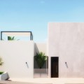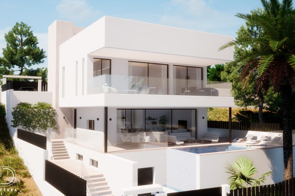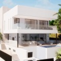 - Modern villa under construction – ready by the end of next year Construction has already started on this 5-bedroom, 4-bathroom villa, and the building process will take around 14 months. Realistically, the home will be completed by the end of next year. The design combines clean Scandinavian lines with modern comfort, creating a practical and stylish home. On the ground floor you’ll find a bright open-plan living room with kitchen and dining area, one bedroom, and a bathroom. From here you walk straight out to the terrace, pool, and outdoor lounge/dining area. The first floor offers two bedrooms sharing a bathroom, plus the master bedroom with ensuite and walk-in wardrobe. Both the master and one bedroom open onto a covered terrace. This level also has an extra entrance and a parking space. The rooftop solarium comes with panoramic views, an outdoor kitchen and bar, and plenty of space for dining or relaxing. The basement includes a gym, a fifth bedroom (or storage), bathroom, and spa area with jacuzzi, steam room, and sauna. Parking is provided for up to three cars.