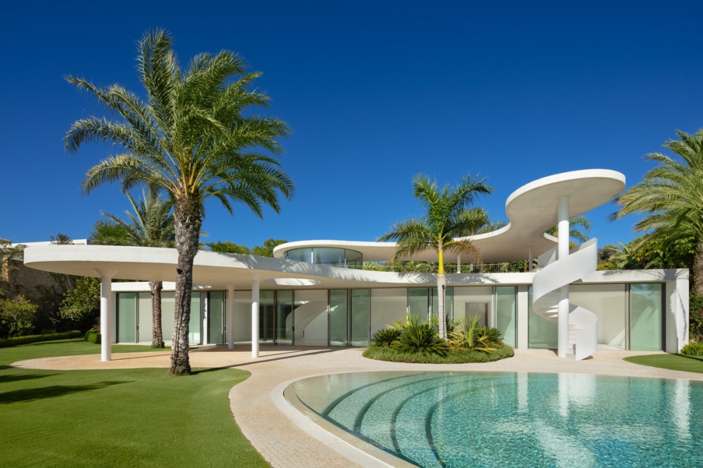 - This prestigious villa stands as a testament to architectural ingenuity, capturing the essence of uniqueness and sophistication. Designed by the visionary minds of Vicens & Ramos architects, its futuristic yet nostalgic structure commands attention with its flowing lines and harmonious integration within the lush green surroundings. The villa harmoniously coexists with nature, enveloped by a tapestry of vibrant greenery. The ground floor accommodates all living spaces, while the upper level features a captivating dome-like entrance and a bespoke spiral staircase, evoking a sense of grandeur. The entrance, thoughtfully designed for parking convenience, sets the stage for welcoming guests and making a lasting impression. An outdoor spiral staircase grants direct access to the garden from the entry level. The ground floor encompasses a fully-equipped kitchen, generous living and dining areas and four stunning bedrooms, each offering their own unique charm. With an abundance of windows and glass sliding doors, natural light floods the interior, seamlessly connecting it to the outdoors. The villa boasts a captivating garden, highlighted by an egg-shaped pool adorned with tranquil light blue tiles. Towering palm trees grace the landscape, while the verdant grass provides ample space for leisure and social gatherings. The terrace tiles, specially chosen for this property, add yet another bespoke touch to the villa's distinctive character. Offering an unparalleled architectural masterpiece, this exceptional villa promises an extraordinary personal retreat, complemented by breathtaking views and an enviable location within the esteemed Finca Cortesin Resort.