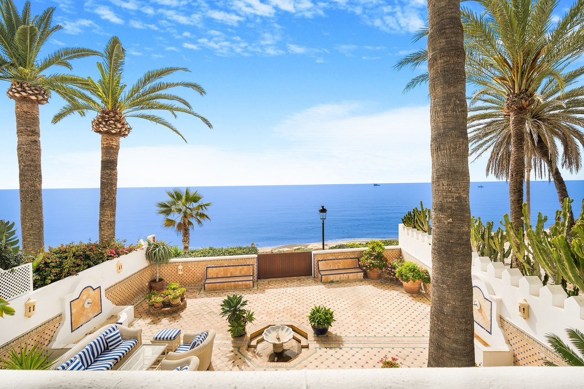 - Nestled in the heart of the Golden Mile, this exquisite Moorish-style 5 bedroom villa is one of only a few houses that can truly claim to be frontline beach. With direct access straight onto the sand, there is nothing separating you from the shoreline and the breathtaking views of the Mediterranean sea. Located a mere five-minute stroll from the renowned Puente Romano, this gem of a home offers 676 m2 of unique living space with stunning vine covered walkways and patios sheltering chic guest bedrooms all decorated in a classical and elegant traditional style, each with its own entrance and en-suite facilities. The main house offers a lovely spacious blue and white classical kitchen, as well as a generous dining area and lounge from where you can access the first of many patios. From here you can watch the sunset in style from a blend of covered and open relaxation areas for those seeking shade from the summer sun. Alternatively, enjoy the cooler evenings in front of a log fire in the spacious family room with an impressive vaulted ceiling. From here double doors lead you to a charming walled patio, featuring a private pool and lounging area. On the first floor the wide staircase leads you to the spacious master suite and dressing room, boasting captivating views and access to an additional terrace with solarium. One additional bedroom can also be found on the first floor, all maintaining the beautiful English style that permeates throughout the property. This home is a true gem, ideal for families who cherish being near the sea. The property offers a blend of charm, opulence and the luxury of coastal living.