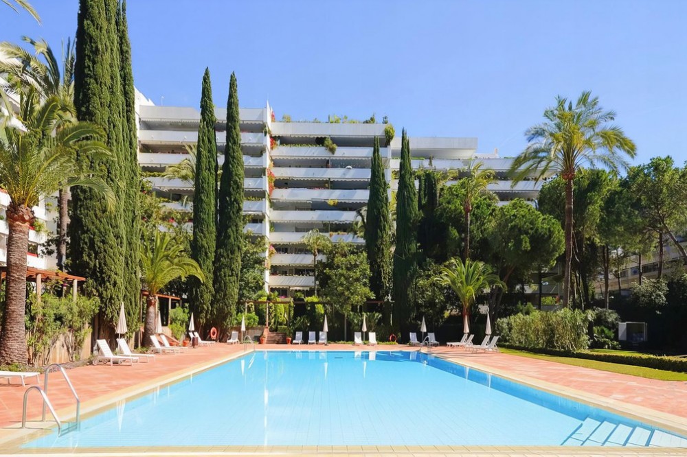 - OPPORTUNITY: Beach side 3 bed luxury apartment, Marbella Golden Mile. Rare opportunity to buy an exclusive apartment in the sought after Don Gonzalo complex, just a few steps away from the popular Playa de Fontanilla beach and the pleasant Golden Mile promenade which leads all the way to Puerto Banus. Apartment details: * Prestigious, iconic complex with 24h security and concierge service * Very large apartment on the 1st floor, in very good state but with classic furniture * 3 generous bedrooms and 3 en-suite bathrooms * Spacious and bright (large 42 sqm living room) * South-west-facing * 23 sqm terrace with garden and pool views * Air conditioning for cooling and heating * Fully equipped kitchen with all appliances * Fitted wardrobes * Marble floors * Extensive well cared for sub-tropical gardens and 2 impressive community pools. * Directly surrounded by several other exclusive residential blocks such as Gran Marbella, Mare Nostrum, Marbella House. * All amenities are within walking distance: El Corte Ingles, Mercadona are just across the main street. * Very wide choice of supreme restaurants are also in the immediate vicinity, not to forget the array of beach clubs and fish restaurants on the nearby promenade. * Only a short walk of just a few minutes to the marina of Marbella which counts plenty of leisure facilities and eateries. Several 5 star hotels are also close by and offer a good choice of luxury faculties and restaurants. Please note the apartment does not come with underground parking space nor storage room!! The price is slightly negotiable.