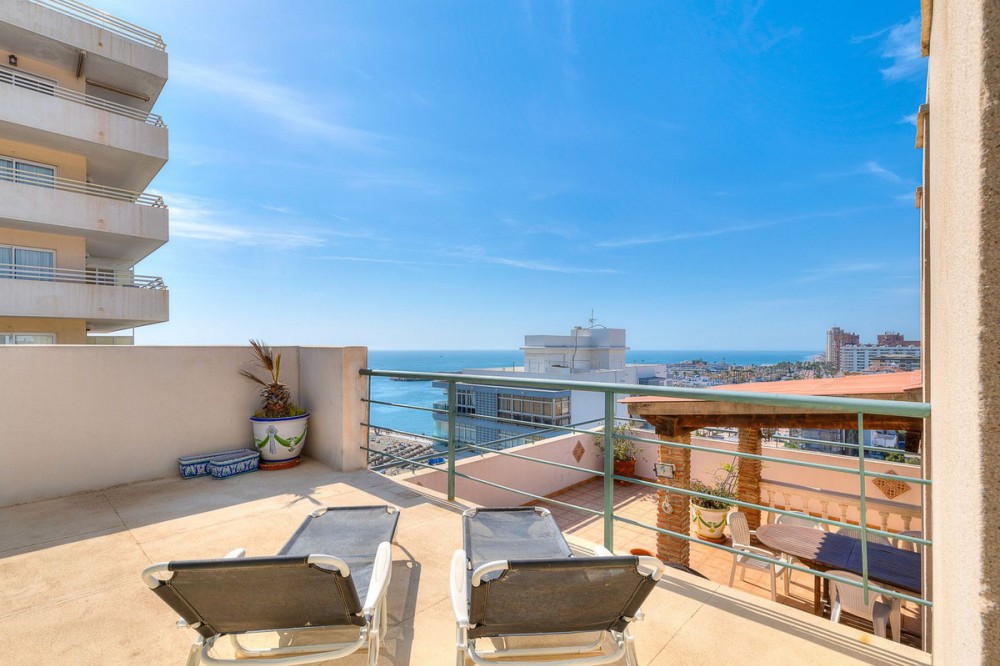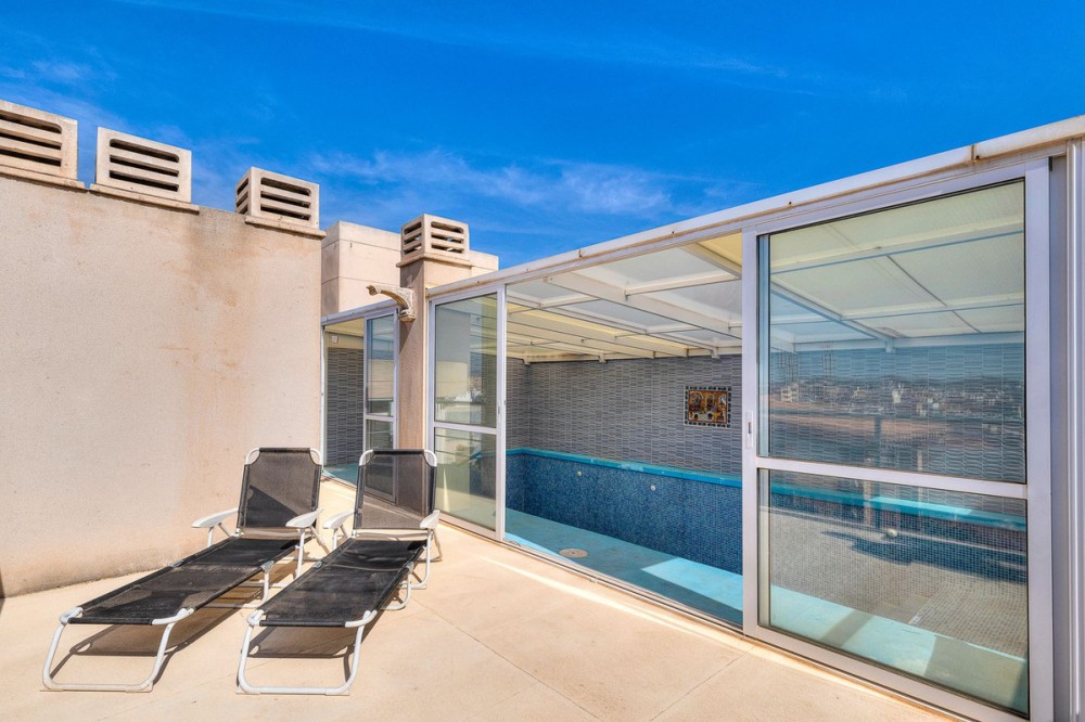 - Exclusive duplex penthouse by the beach in Fuengirola with a private pool on the rooftop terrace Luxurious penthouse in a residential complex just 50 meters from the beach. When you enter the apartment, you first come to a large hallway that leads to the left into a spacious and fully equipped kitchen. To the right is a wonderful large living room of over 70 m² with a separate dining room. From the dining room, you can enjoy the fantastic panoramic view through the large windows during your meal. From the dining room, you also have access to a large west-facing terrace where you can enjoy meals in the sunset. The apartment has 4 bedrooms and 3 bathrooms, and from one of the bedrooms, there is access to a large south-facing terrace with a sea view. Upstairs, you will find your very own rooftop terrace of over 100 m² with outstanding sea views and sun from morning to evening. On the rooftop terrace, there is also a large built-in private pool and plenty of space for sun loungers, a dining table, a barbecue area, and a relaxation area. The penthouse is centrally located in the popular town of Fuengirola, close to all kinds of services you may need, and on the ground floor, you will find the large supermarket Mercadona. There is also a communal pool on the roof of the building and a parking space for 2 cars in the basement. Don’t miss this rare opportunity to purchase one of the best penthouses in Fuengirola.