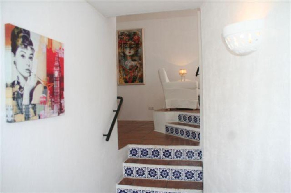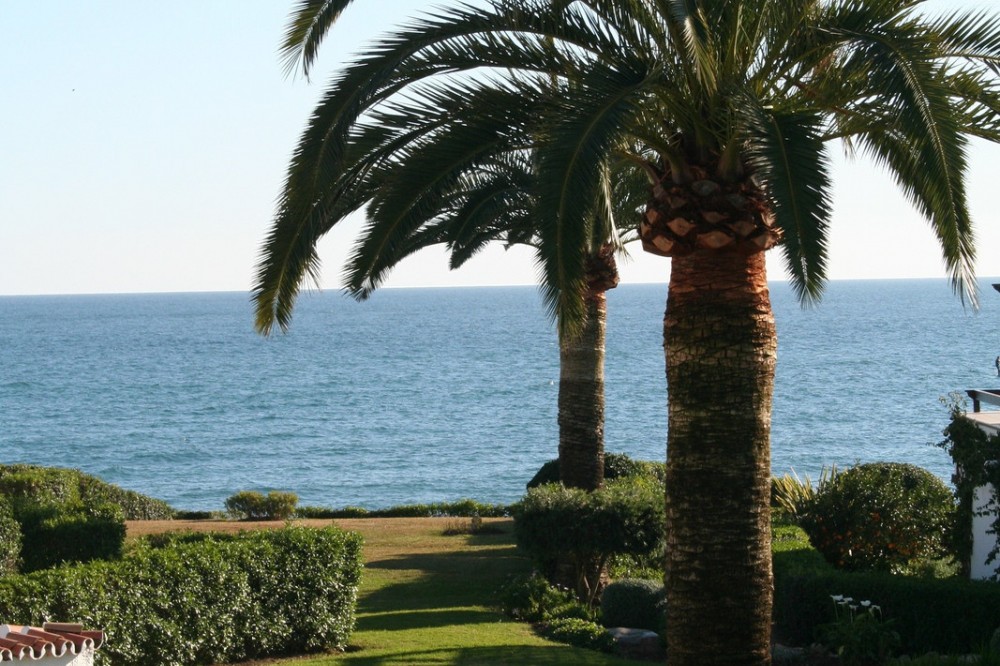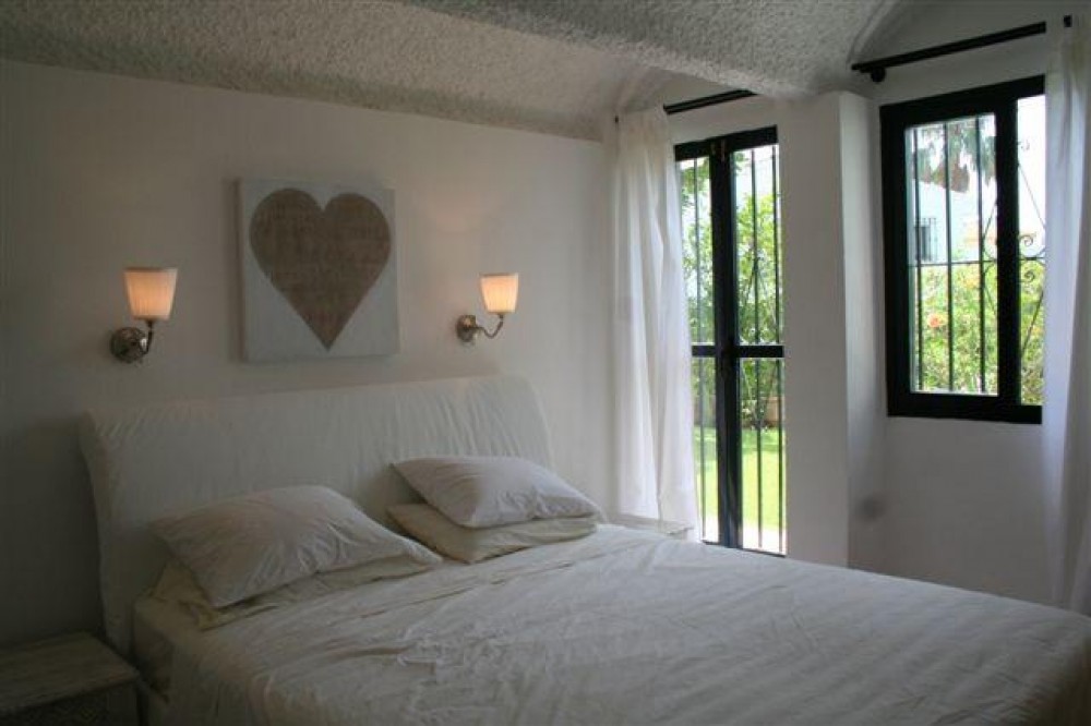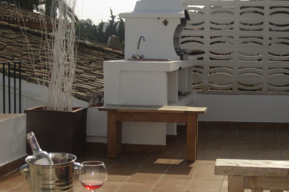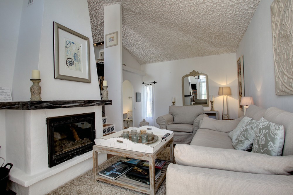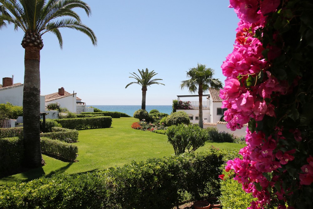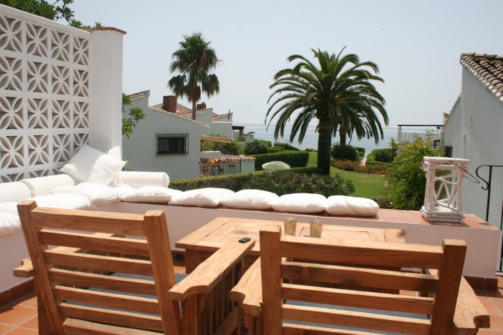 - Very charming 3 bedroom / 2 bathroom townhouse with spectaculaire sea view in a securely gated beachfront resort with a large communal pool, subtropical gardens and direct access to the beach (only 50 steps to the beach!). The resort was built in 1969 and is located at the entrance (East) of Estepona, near the Palacio de Congresos and the large Supermercado Carrefour. The house has a private garden and a large terrace (50m2)with a lounge area, a built-in BBQ and a large dining table. From the terrace you have a wonderful view overlooking the Mediterranean sea. The fully fitted (new) kitchen is well equipped with American fridge/freezer, oven, microwave, 5 ring stove and dishwasher. The split level living-room has a seating area with a fire place and a flat screen TV, plus an office corner. All bedrooms have airconditioning and have direct access to the private garden. The Carrefour, several beachbars, a fresh bakery, a pharmacy, a hairdresser are all within short walking distance. Estepona old town is a 15 min walk. Popular places like Puro Beach club, Puerto Banus, Los Flamingos Golf Club, Marbella are all within a 5 - 15 min drive.