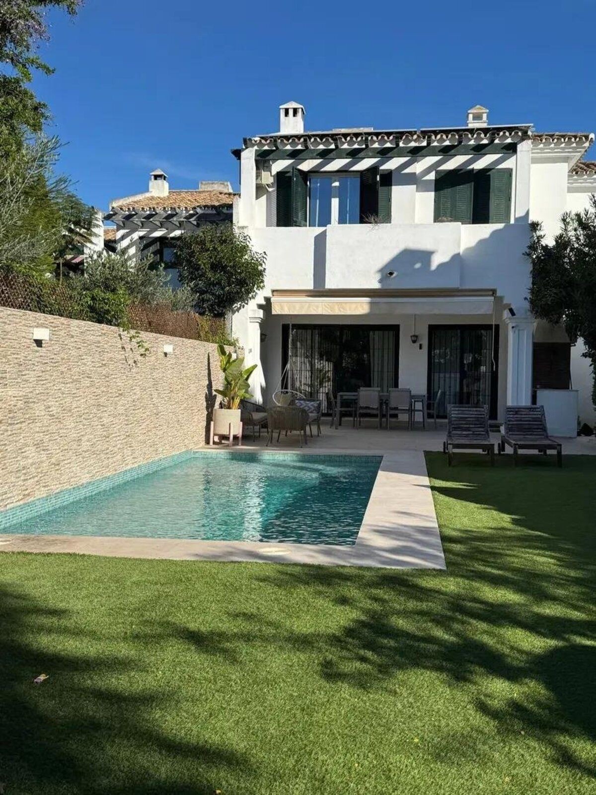 - This spectacular semi-detached villa, located in the sought after area of San Pedro Playa in Marbella, has been recently renovated to offer a modern home full of amenities. Just steps from the beach, this property combines an excellent location with luxury features ideal for enjoying life by the sea. It has 3 bedrooms and 3 bathrooms, offering spacious and comfortable rooms perfect for family or guests, plus a large and bright living room that becomes an ideal space for relaxation and gatherings, bathed in natural light thanks to its open design. The property includes a private pool and garden, creating a perfect environment to enjoy the outdoors with total privacy, as well as a built-in barbecue area designed for unforgettable moments with friends and family. It also has a private garage that provides a comfortable and safe space for your vehicle, along with air conditioning and heating systems that guarantee thermal comfort throughout the year. In addition, it is equipped with solar panels, demonstrating a commitment to sustainability and offering energy savings through self-consumption. Located in a quiet area but close to all amenities, with the beach just a few steps away, this villa is perfect for those looking for quality of life without giving up the proximity to Marbella and its many attractions. It is a unique opportunity to enjoy a Mediterranean lifestyle in a privileged environment, do not miss it!