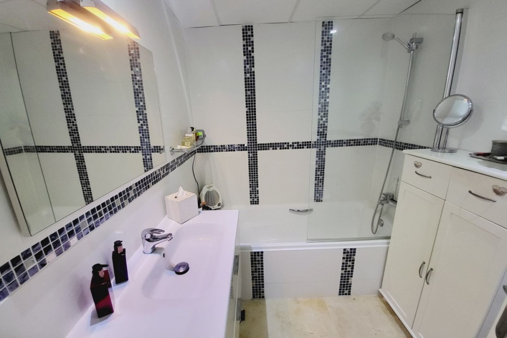 - EXCEPTIONALLY LARGE AND SPACIOUS 2 BEDROOM 2 BATHROOM APARTMENT SITUATED IN A MUCH SOUGHT AFTER AND EXCLUSIVE COMMUNITY. THE APARTMENT IS A GROUND FLOOR PROPERTY WITH A 50m2 TERRACE THAT LEADS OUT DIRECTLY TO A SMALL PRIVATE GARDEN AREA. THE PROPERTY HAS A HAS A SUNNY SOUTH WESTERLY ASPECT AND OFFERS BOTH SUN AND SHADE. FINISHED TO THE HIGHEST STANDRADS THROUGHOUT THE APARTMENT BRIEFLY COMPRISES: ENTRANCE HALLWAY WITH FITTED WARDROBES FOR STORAGE, SEPARATE GOOD SIZED QUALITY KITCHEN, HUGE OPEN PLAN LOUNGE AND DINING AREA, DOUBLE GUEST BEDROOM WITH FITTED ROBES, GUEST BATHROOM AND A MASTER EN-SUITE BEDROOM WITH FITTED ROBES. THE LOUNGE AND MASTER BEDROOM HAVE DIRECT ACCESS TO THE STUNNING TERRACE AREA WHICH IS USED BY THE CURRENT OWNERS AS AN ADDITIONAL LIVING SPACE AS WELL AS AN INDEPENDENT OFFICE AREA. TASTEFULLY PRESENTED THROUGHOUT IN EXCELLENT CONDITION WITH THE HIGH QUALITY FURNISHINGS BEING INCLUDED IN THE PRICE. THE COMMUNITY IS BEAUTIFULLY MAINTAINED AND HAS BOTH A MAIN POOL AND CHILDREN'S POOL, COMMUNITY BAR / SNACK-BAR, PADDLE TENNIS, A SMALL GYM AND COMMUNAL LIBRARY. A GOOD SIZE UNDERGROUND GARAGE SPACE AND STORAGE ROOM ARE INCLUDED IN THE PRICE. THIS IS A FANTASTIC HOLIDAY HOME OR GREAT PERMANENT RESIDENCE AND EARLY VIEWING IS RECOMMENDED!
