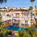 - LOCATION! Charming Detached Villa in El Chaparral - Front Line Golf Location Discover this stunning detached villa, nestled in the most sought-after street of El Chaparral, just a 5 minute drive from the bustling La Cala de Mijas. Boasting a prime front line golf location, this exquisite home offers a perfect blend of elegance and comfort. Spread across two levels, the villa features four spacious bedrooms, including a master suite with an ensuite bathroom, and three additional double bedrooms and three bathrooms on the ground level. There is an additional benefit of underfloor heating in the bathrooms and solar panels for heating water at the property. The heart of the home is a large modern kitchen with a centre island, ideal for culinary enthusiasts, complemented by a separate utility room. The lounge and dining room provide ample space for entertaining, while the sunny south-facing terrace offers breathtaking sea views. Outside, the property showcases a large frontage surrounded by greenery with a stone fountain as a centre piece, a private swimming pool with capacity of 48 m3 with an adjacent washroom / toilet, a large double garage and additional parking on the drive. There is also a large store room. With a plot size of 1,000 m² and 300 m² of constructed area, this villa is a rare find in the area. Built in 1986 and maintained in good condition, it includes fitted wardrobes, a storeroom, and modern heating and air conditioning throughout. Don't miss this opportunity to own a piece of paradise with unparalleled golf and sea views.