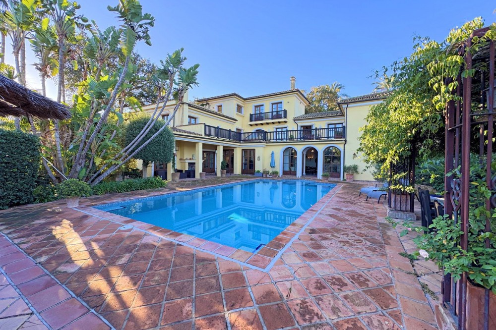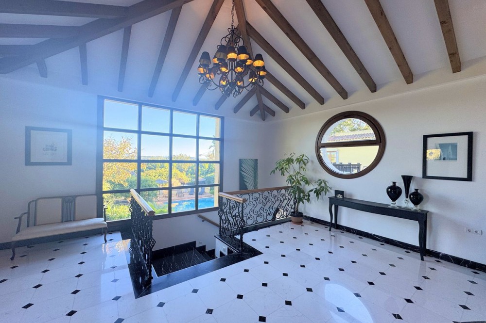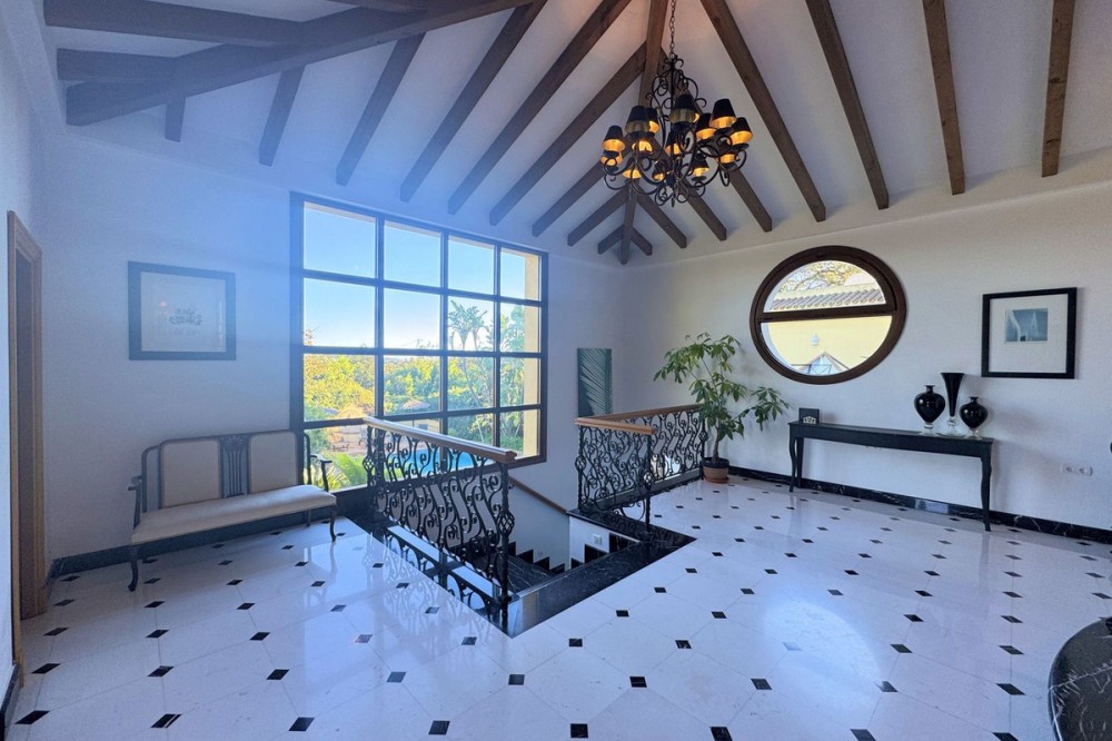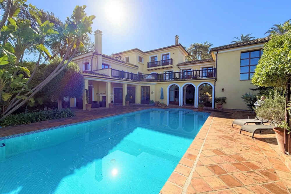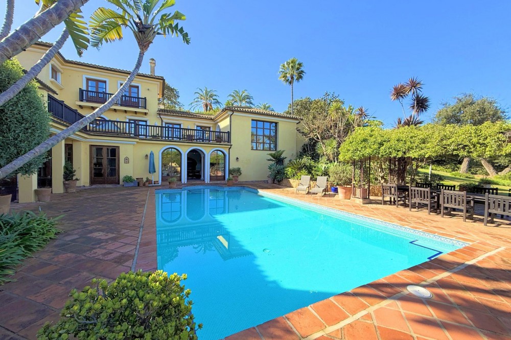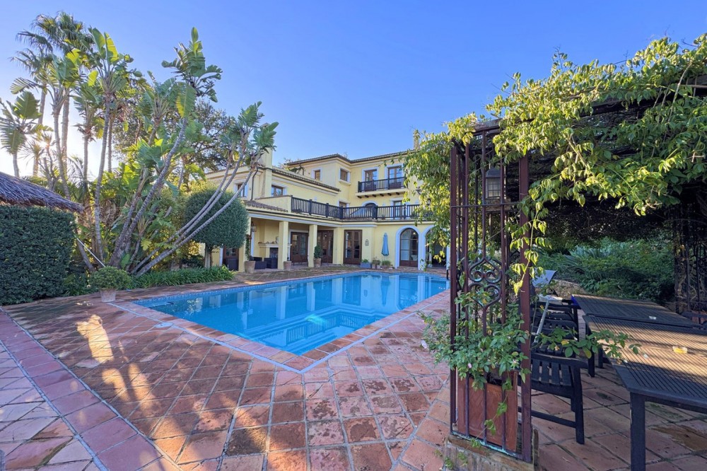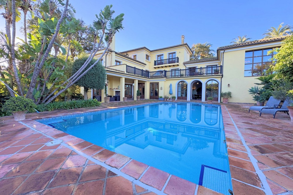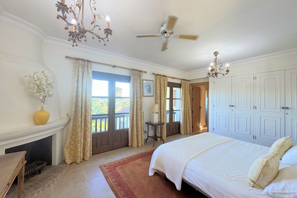 - "LUXURY 6 BEDROOM VILLA IN SOTOGRANDE." Just a few metres from the prestigious Real Valderrama golf course. This imposing home, designed on three levels, offers a perfect balance between privacy and shared spaces. From the impressive entrance hall, you will be greeted by a large panoramic window that marks the views into the main living area. This elegant space is highlighted by high ceilings, a wrap-around fireplace and French doors leading to a charming courtyard. On this same level is the master suite, an exclusive retreat with private bathroom and dressing room, along with three additional bedrooms. The upper floor houses a large bedroom with fireplace and ensuite bathroom, accompanied by an adjoining room ideal as a study or extra bedroom, providing versatility. On the lower level, you will discover an environment designed for relaxation and conviviality. It includes a TV room with fireplace, a contemporary kitchen and a Moroccan-inspired dining room. All these areas connect directly to the terraces, the swimming pool and a beautiful garden, creating a perfect space to enjoy unforgettable moments outdoors. This unique residence has terraces and balconies on all levels, from where spectacular views of the golf course and the majestic mountains can be admired. Comfort is guaranteed in every corner of the house, thanks to underfloor heating in the main areas and radiators in the other rooms, as well as air conditioning throughout the property. A spacious garage, a laundry room and its privileged location in the heart of Sotogrande complete this marvellous offer. Let yourself fall in love with this architectural gem that combines luxury, design and unbeatable location. A property that not only offers a home, it offers an incomparable lifestyle. We recommend a visit to appreciate all that this villa has to offer!