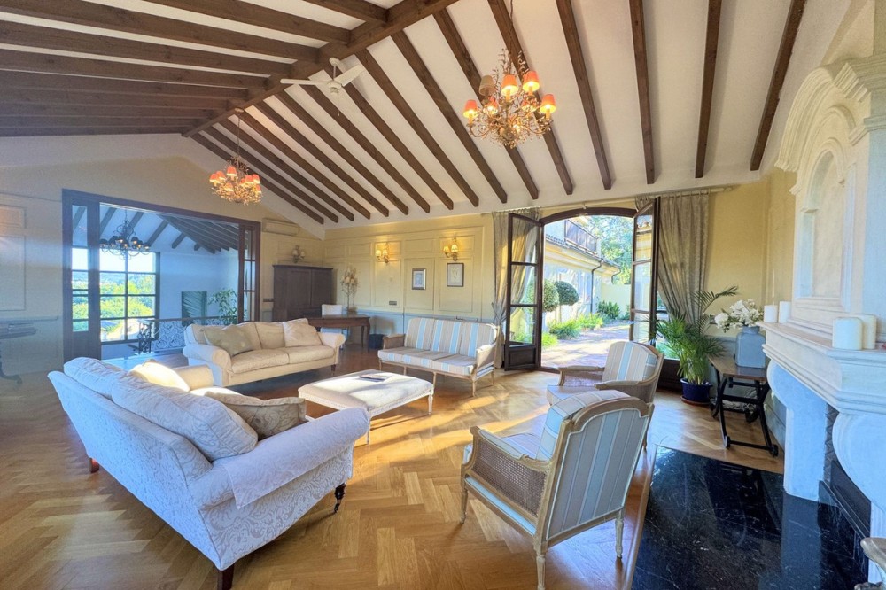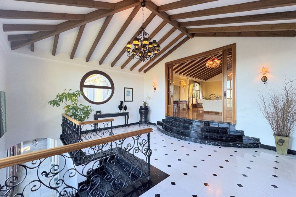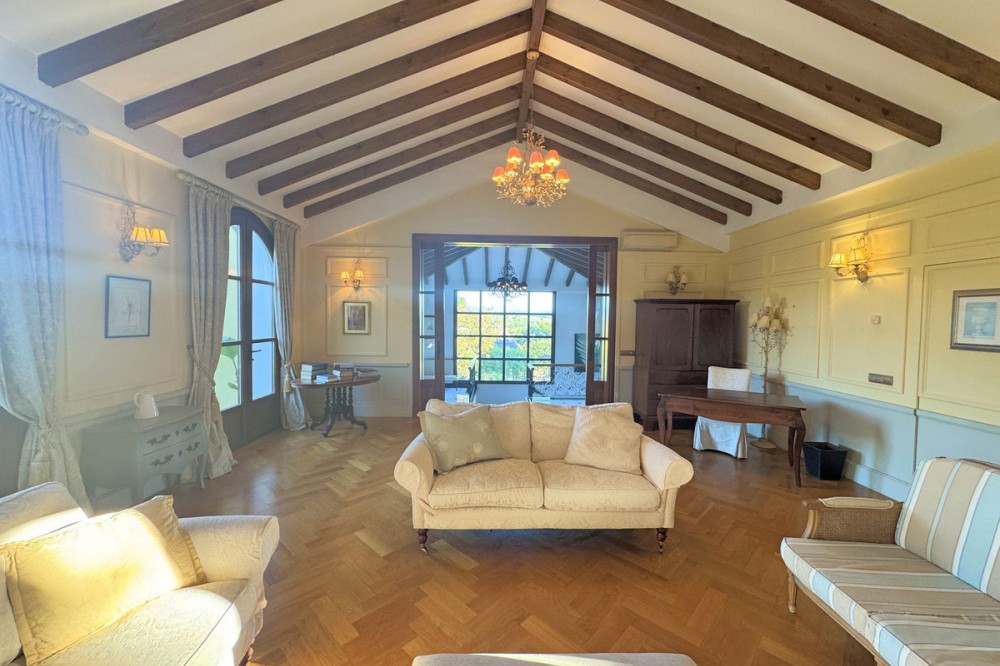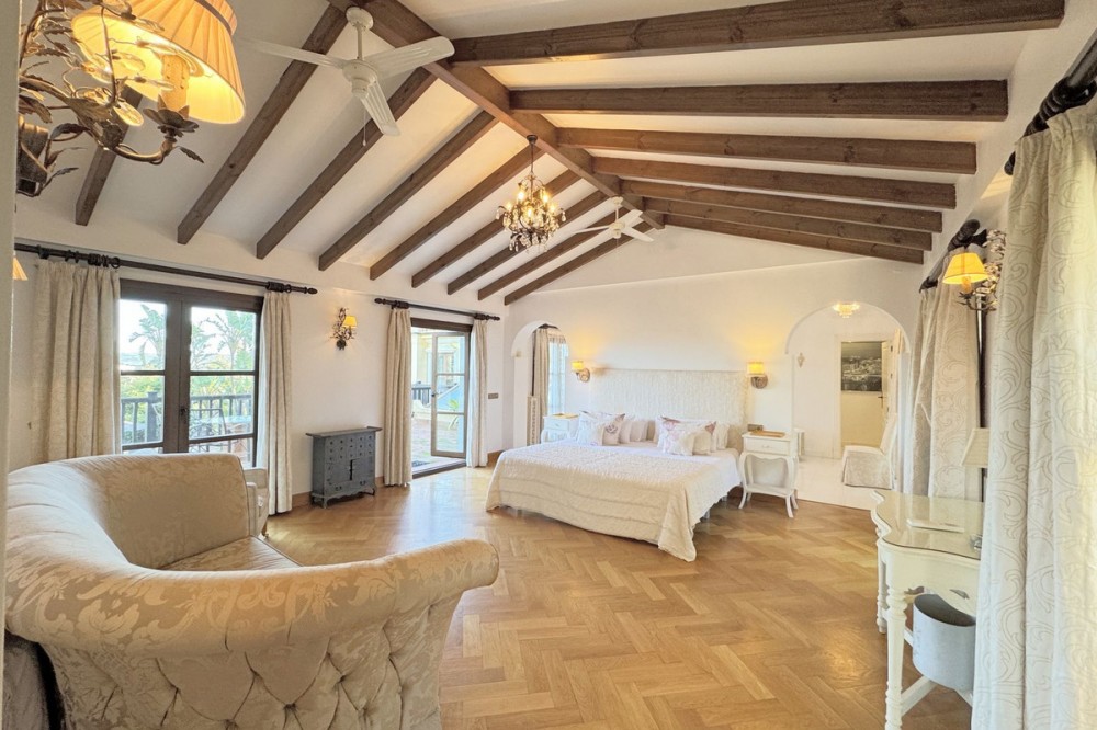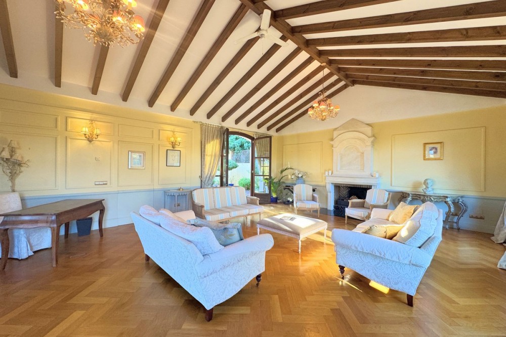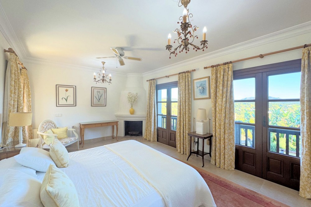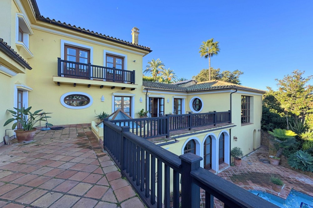 - "LUXURY 6 BEDROOM VILLA IN SOTOGRANDE." Just a few metres from the prestigious Real Valderrama golf course. This imposing home, designed on three levels, offers a perfect balance between privacy and shared spaces. From the impressive entrance hall, you will be greeted by a large panoramic window that marks the views into the main living area. This elegant space is highlighted by high ceilings, a wrap-around fireplace and French doors leading to a charming courtyard. On this same level is the master suite, an exclusive retreat with private bathroom and dressing room, along with three additional bedrooms. The upper floor houses a large bedroom with fireplace and ensuite bathroom, accompanied by an adjoining room ideal as a study or extra bedroom, providing versatility. On the lower level, you will discover an environment designed for relaxation and conviviality. It includes a TV room with fireplace, a contemporary kitchen and a Moroccan-inspired dining room. All these areas connect directly to the terraces, the swimming pool and a beautiful garden, creating a perfect space to enjoy unforgettable moments outdoors. This unique residence has terraces and balconies on all levels, from where spectacular views of the golf course and the majestic mountains can be admired. Comfort is guaranteed in every corner of the house, thanks to underfloor heating in the main areas and radiators in the other rooms, as well as air conditioning throughout the property. A spacious garage, a laundry room and its privileged location in the heart of Sotogrande complete this marvellous offer. Let yourself fall in love with this architectural gem that combines luxury, design and unbeatable location. A property that not only offers a home, it offers an incomparable lifestyle. We recommend a visit to appreciate all that this villa has to offer!
