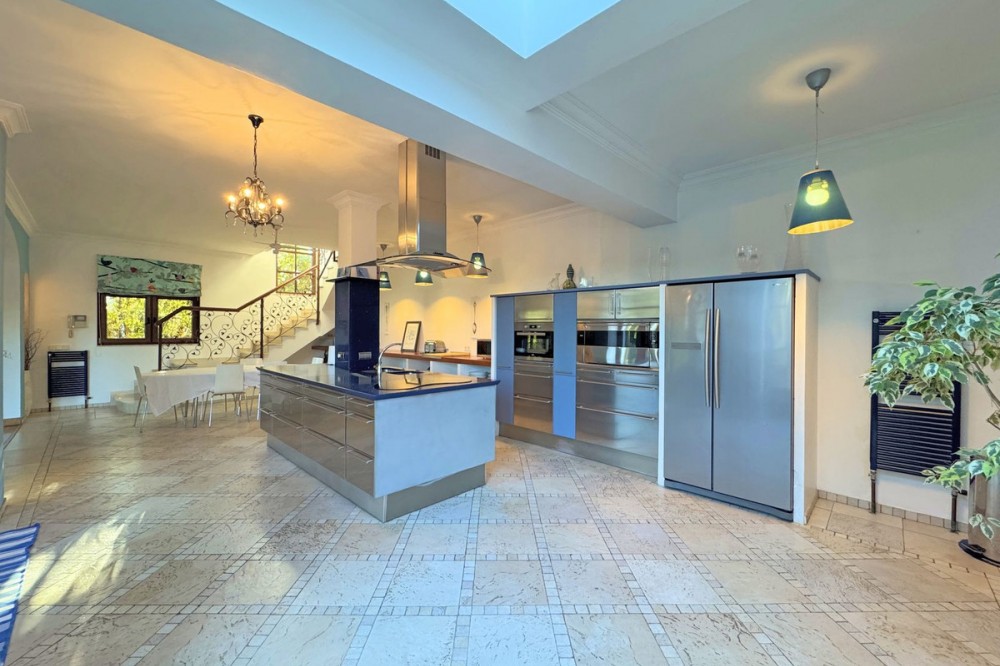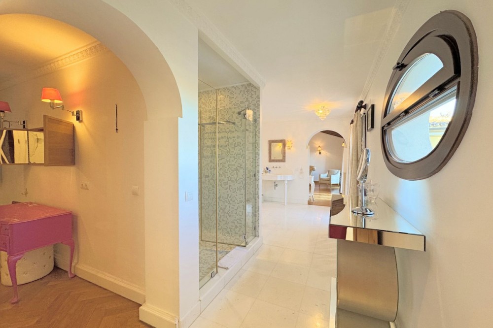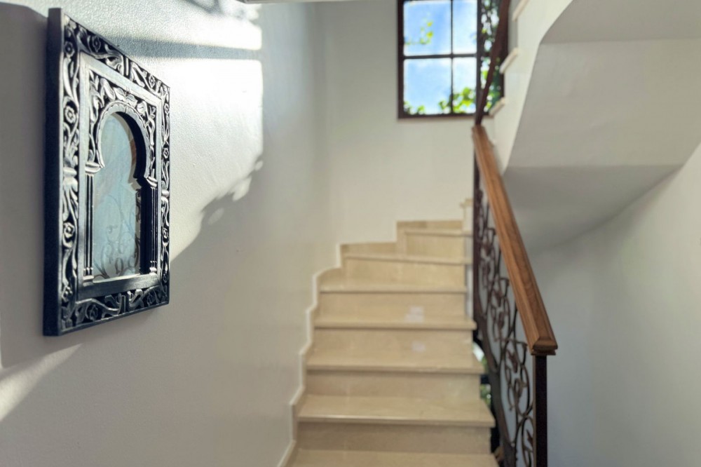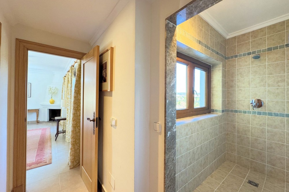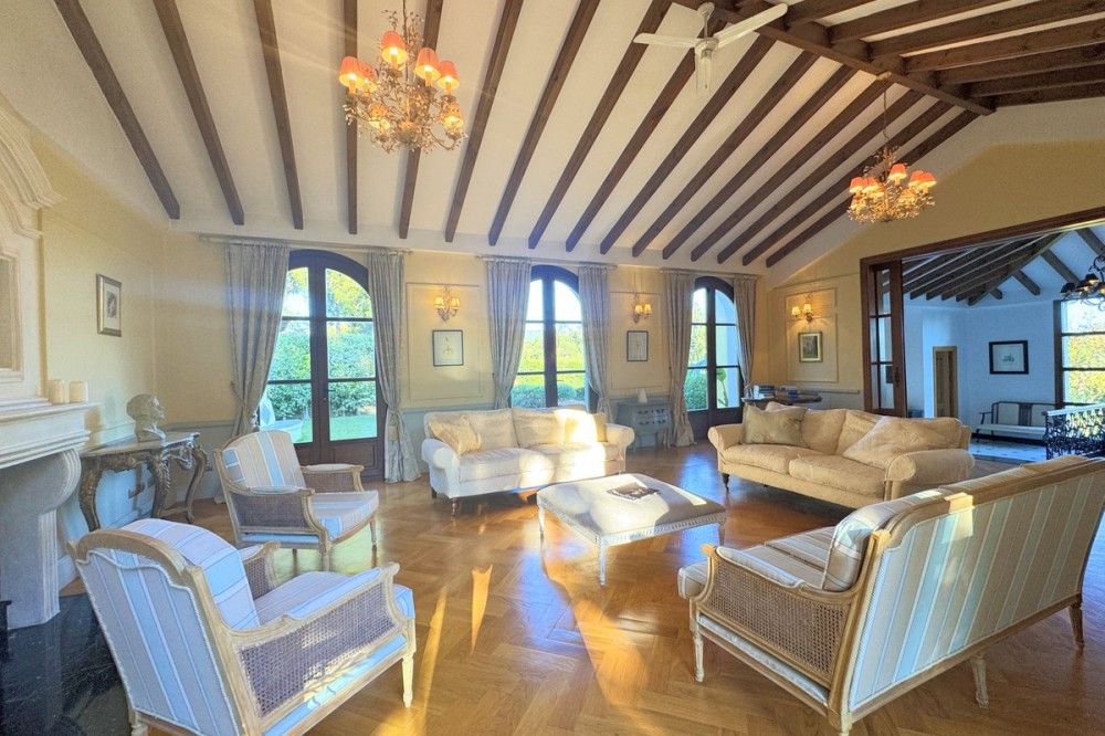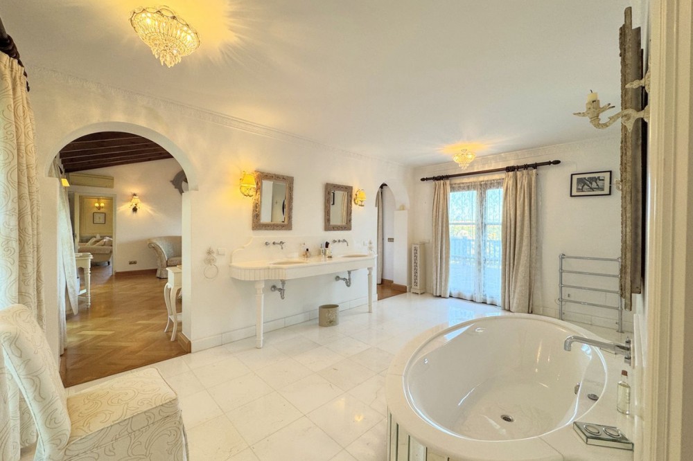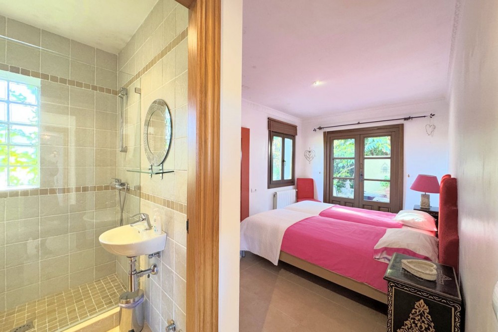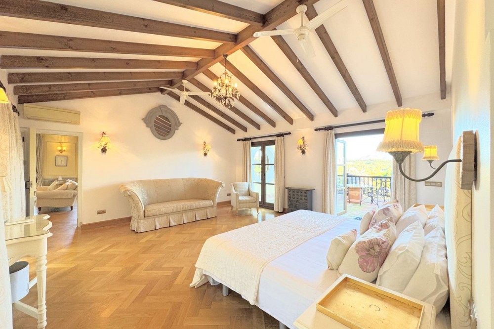 - "LUXURY 6 BEDROOM VILLA IN SOTOGRANDE." Just a few metres from the prestigious Real Valderrama golf course. This imposing home, designed on three levels, offers a perfect balance between privacy and shared spaces. From the impressive entrance hall, you will be greeted by a large panoramic window that marks the views into the main living area. This elegant space is highlighted by high ceilings, a wrap-around fireplace and French doors leading to a charming courtyard. On this same level is the master suite, an exclusive retreat with private bathroom and dressing room, along with three additional bedrooms. The upper floor houses a large bedroom with fireplace and ensuite bathroom, accompanied by an adjoining room ideal as a study or extra bedroom, providing versatility. On the lower level, you will discover an environment designed for relaxation and conviviality. It includes a TV room with fireplace, a contemporary kitchen and a Moroccan-inspired dining room. All these areas connect directly to the terraces, the swimming pool and a beautiful garden, creating a perfect space to enjoy unforgettable moments outdoors. This unique residence has terraces and balconies on all levels, from where spectacular views of the golf course and the majestic mountains can be admired. Comfort is guaranteed in every corner of the house, thanks to underfloor heating in the main areas and radiators in the other rooms, as well as air conditioning throughout the property. A spacious garage, a laundry room and its privileged location in the heart of Sotogrande complete this marvellous offer. Let yourself fall in love with this architectural gem that combines luxury, design and unbeatable location. A property that not only offers a home, it offers an incomparable lifestyle. We recommend a visit to appreciate all that this villa has to offer!