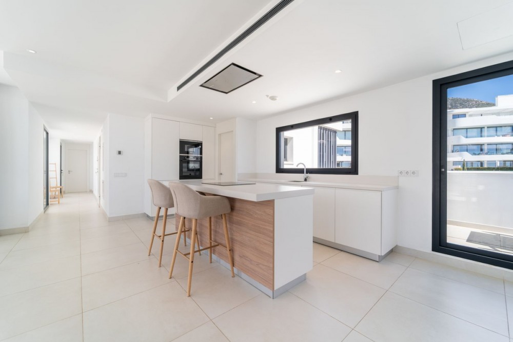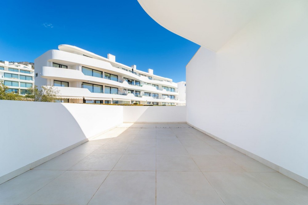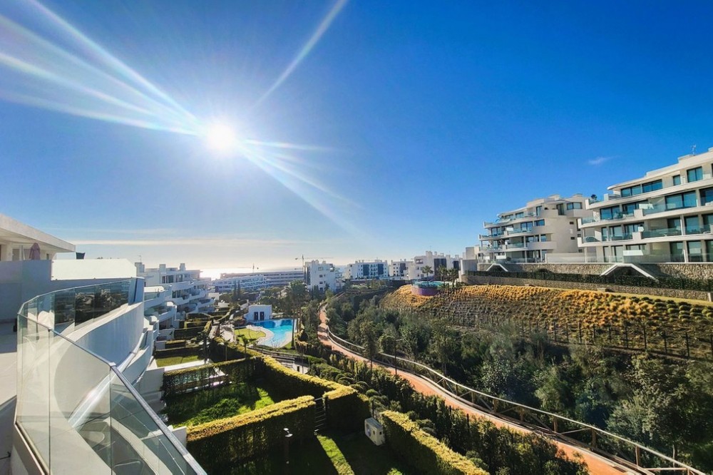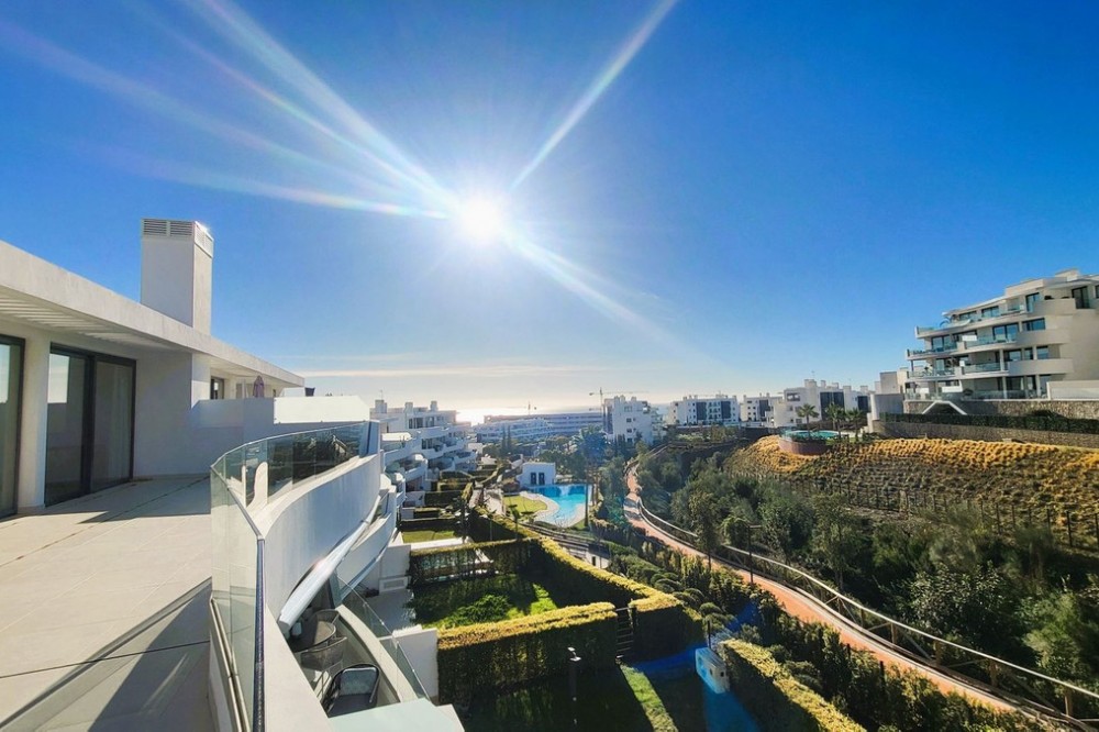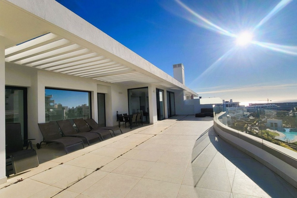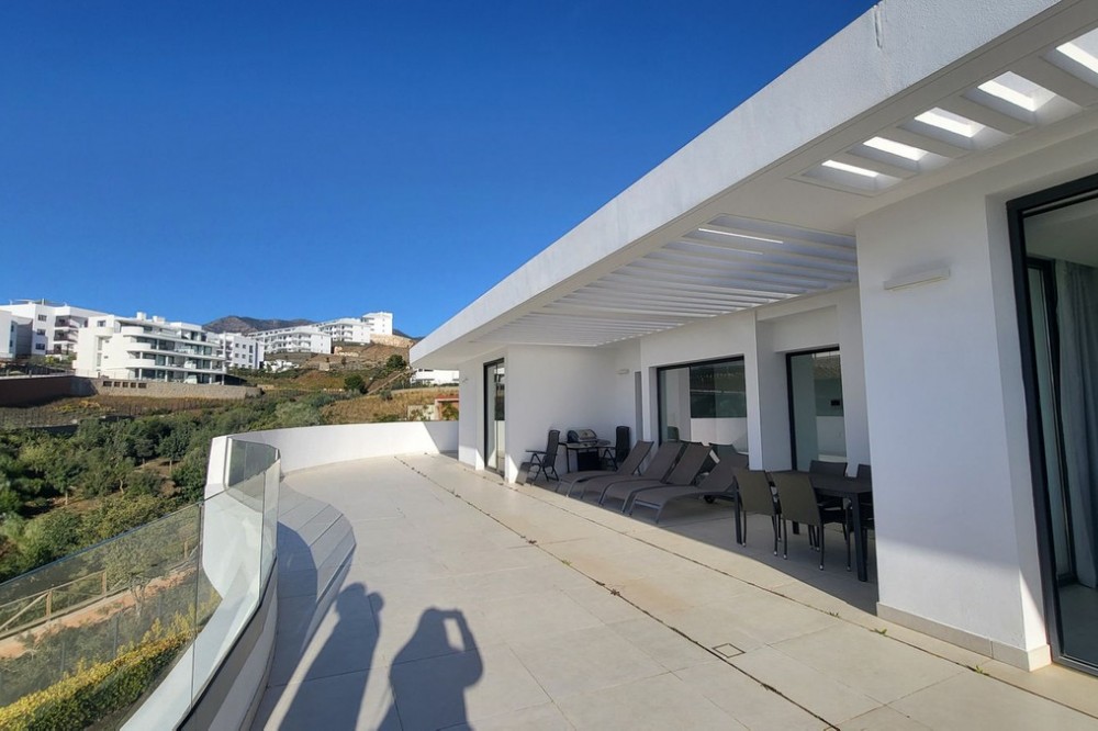- Luxury west facing penthouse, located in the exclusive urbanization of Higuerón West. Consists of entrance, hall way, spacious living-dining room with floor to ceiling glass sliding doors leading out to a large wrap around terrace of 158m2, with views of the mountains, gardens and partial sea views. Open plan kitchen fully furnished and equipped with electrical appliances from Bosch and laundry area with washing machine/dryer. Main bedroom with ensuite bathroom and walk-in closet, 2 extra bedrooms with built-in wardrobes and guest bathroom. There is also a backside terrace of 15m2 with access from the living room. Air conditioning hot and cold by Airzone, video intercom, domotic system, pre-installation alarm system, floor heating in both bathrooms. Includes two parking spaces and one storage room.